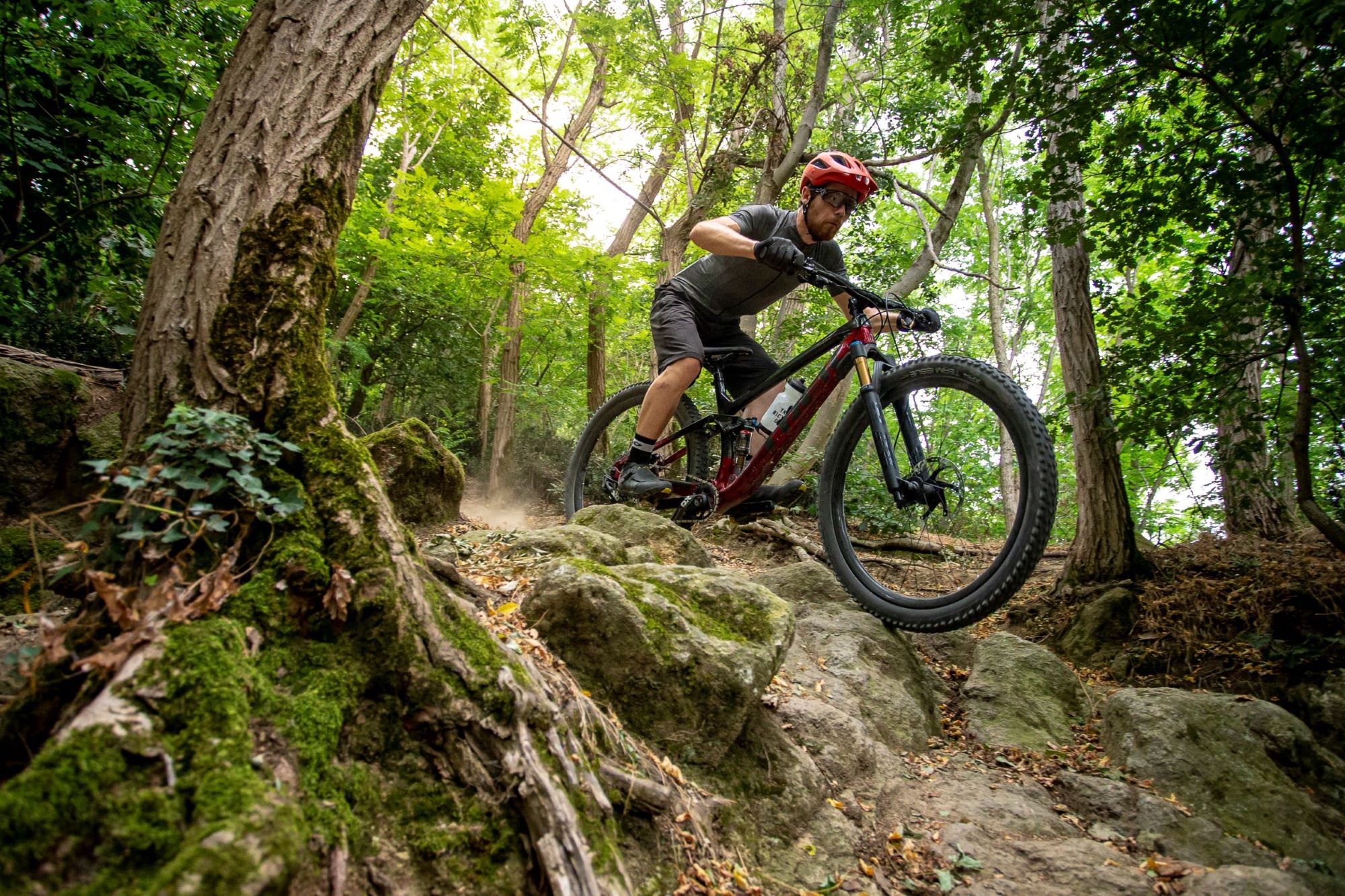 Le modèle mis à notre disposition par Trek est le Fuel EX 9.9, qui sera vendu 7 499 €. A ce tarif, rien ne manque : cadre entièrement en carbone, roues carbone Bontrager Line Carbon 30, fourche Fox 36 Factory Grip2, transmission Sram X01 Eagle, freins Shimano XT M8120 4 pistons. La finition est également très réussie avec ce carbone / rouge foncé du plus bel effet. Nous l’avons roulé avec le Mino-Link en position Low.
