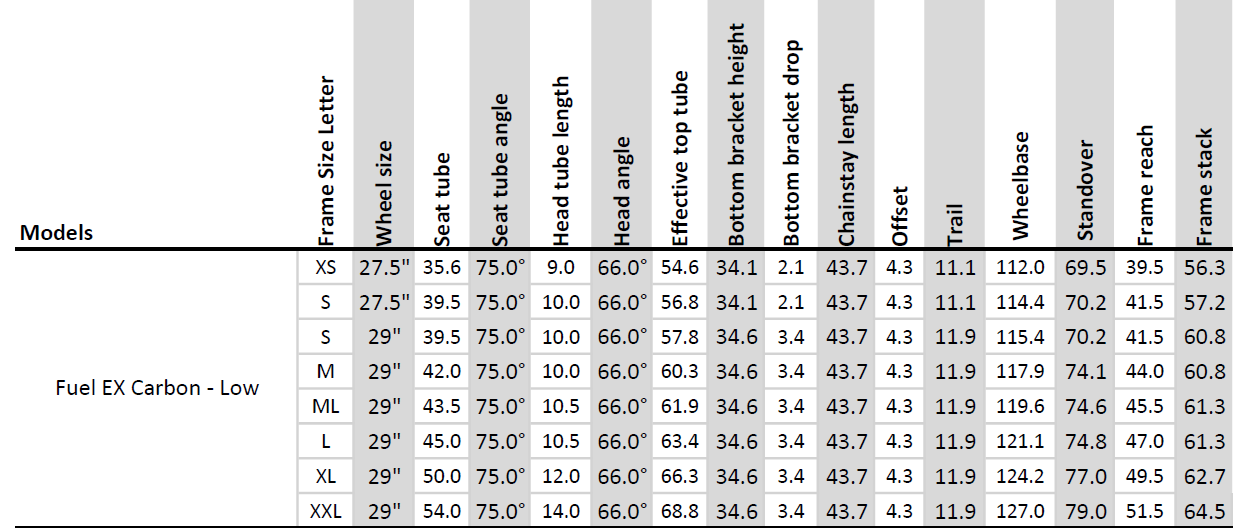 Conformément à la tendance actuelle, le Fuel EX s’allonge et se couche un peu plus que le modèle précédent. Le reach augmente ainsi de 10 à 20 mm suivant les tailles (455 mm en taille ML) tandis que l’angle de direction passe de 67° à 66°, dans la moyenne de la catégorie. Pour conserver une position efficace au pédalage, l’angle de selle remonte quant à lui de 74° à 75°.