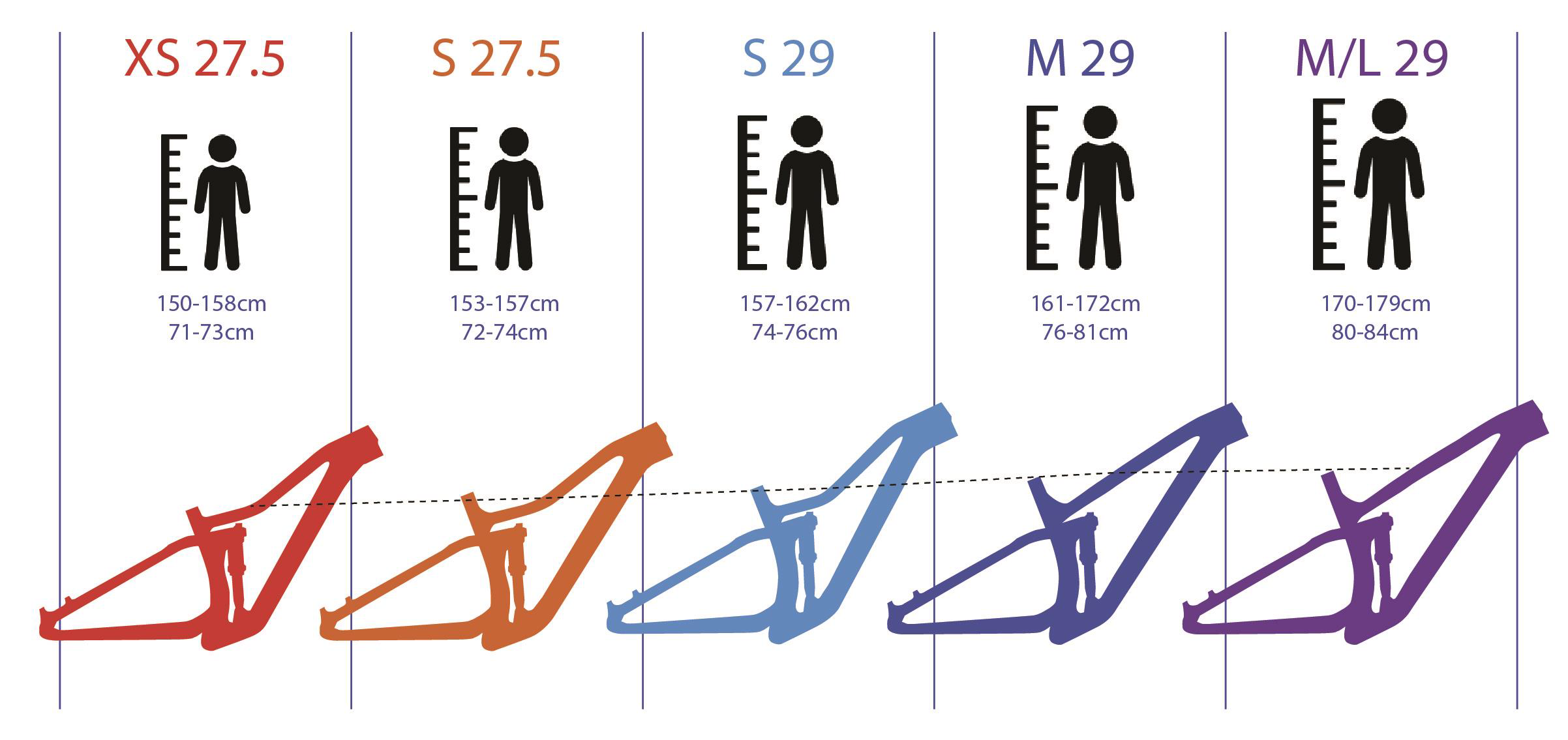 La charte des tailles a néanmoins été légèrement revue et, pour s’adapter au mieux aux personnes les plus petites, la taille XS ne sera disponible qu’en 27,5″. La taille S sera elle proposée dans les deux formats de roue. Dans le même esprit, le débattement de la tige de selle est adapté à la taille du vélo : 100 mm en XS et S, 150 mm au-dessus et même 170 mm à partir de la taille L sur les modèles 9.8 et 9.9.