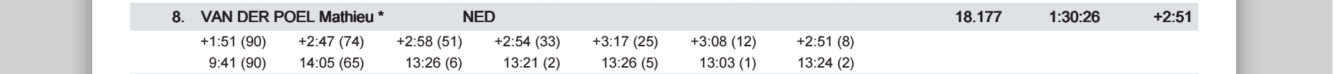 D’autres auraient arrêté les frais. Ou trouvé des excuses. Mais lui, le petit-fils de Poulidor et le fils d’Adrie van der Poel, il a remis les bouchées doubles. 90e toujours à l’issue du start-loop (effectué pour la plupart avec une chaîne bloquée sur le petit pignon avant que son dérailleur se remette à fonctionner correctement), il va ensuite entamer une remontée qui est sans aucun doute une des plus belles que notre sport ait jamais connu.