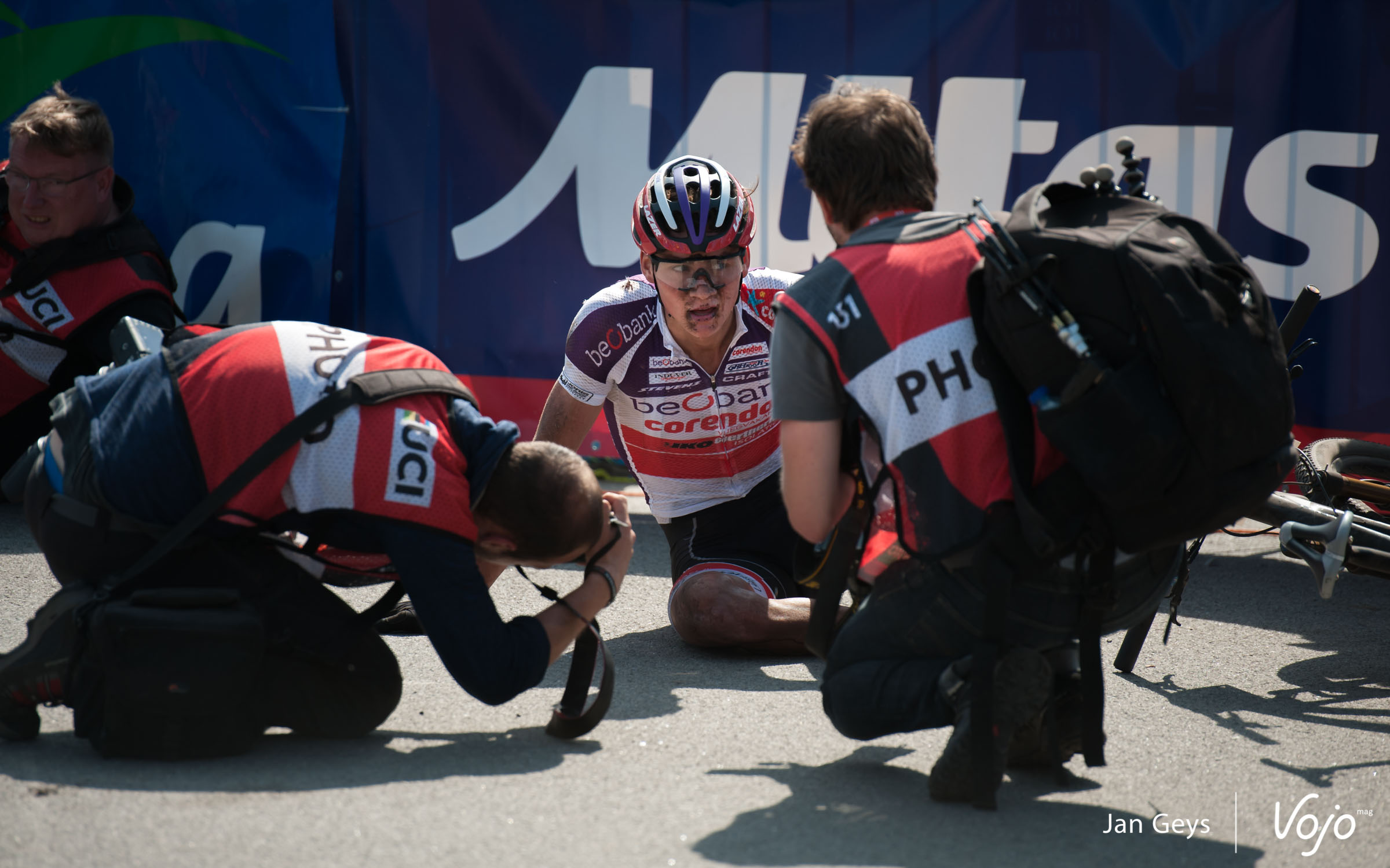 Non seulement les départs sont importants sur ce type de course mais en partant si loin, le risque de chute est démultiplié. Et paf ! Ce qui devait arriver arriva. McConnell fait un écart, Stirnemann casse sa chaîne et voilà qu’un bon paquet de coureurs se retrouvent au tapis ou emmêlés dans un enchevêtrement de vélos. Parmi eux, MVDP, comme l’appellent ceux qui trouvent son nom trop long ou imprononçable.