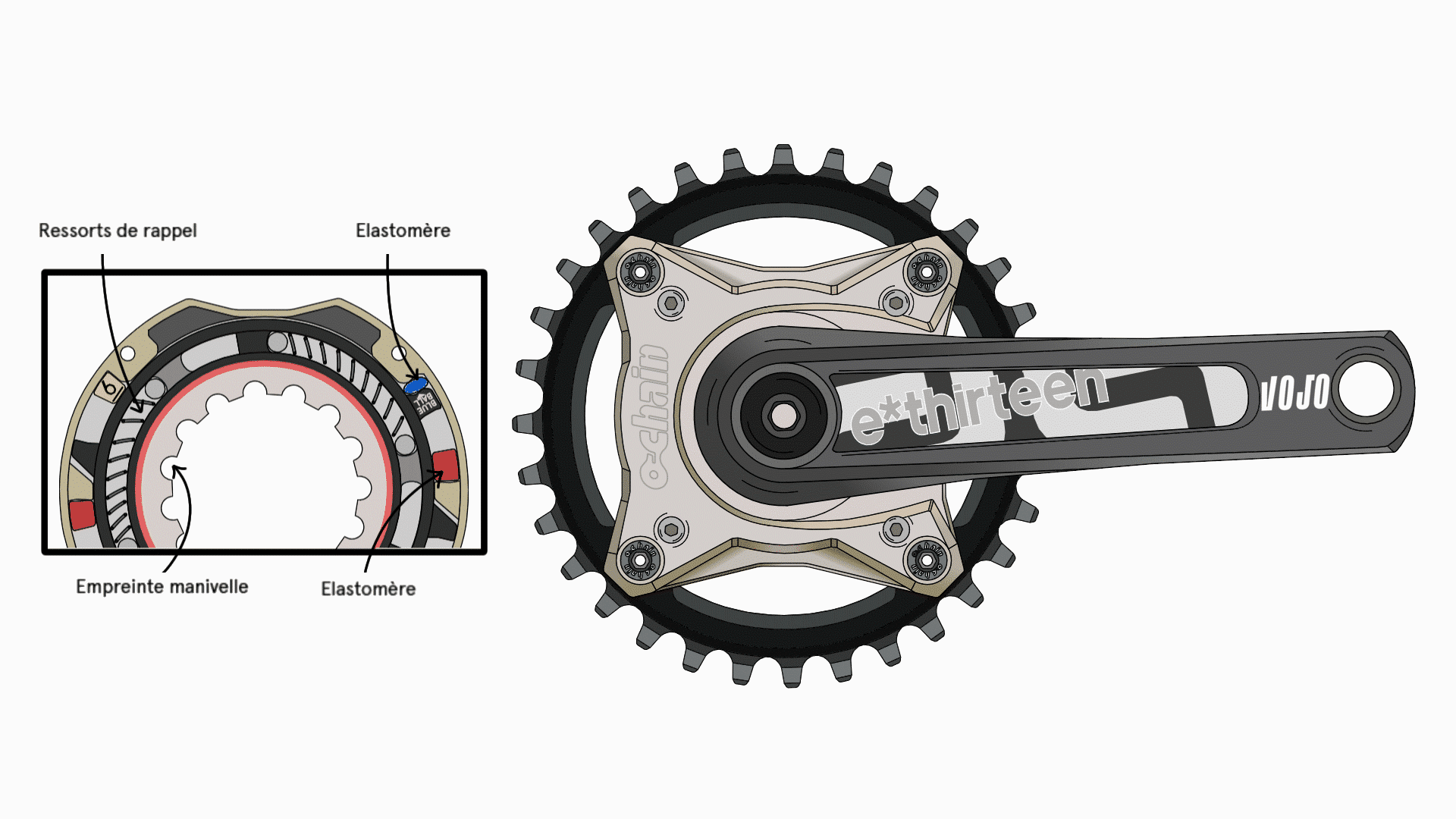 Lors du pédalage, le mouvement des manivelles amène les différents ergots en contact avec les élastomères rouges. Une fois le contact établi, les manivelles entraînent le plateau en rotation. Cela pose alors un problème de réactivité. Lorsque l’on veut relancer et donner un premier coup de pédale, la manivelle doit parcourir un certain angle avant d’embarquer la chaine par le biais du plateau. Ensuite, il faut que la chaîne entraîne la cassette afin d’enclencher le corps de roue libre. À ce moment, la roue dans son ensemble entre en rotation.