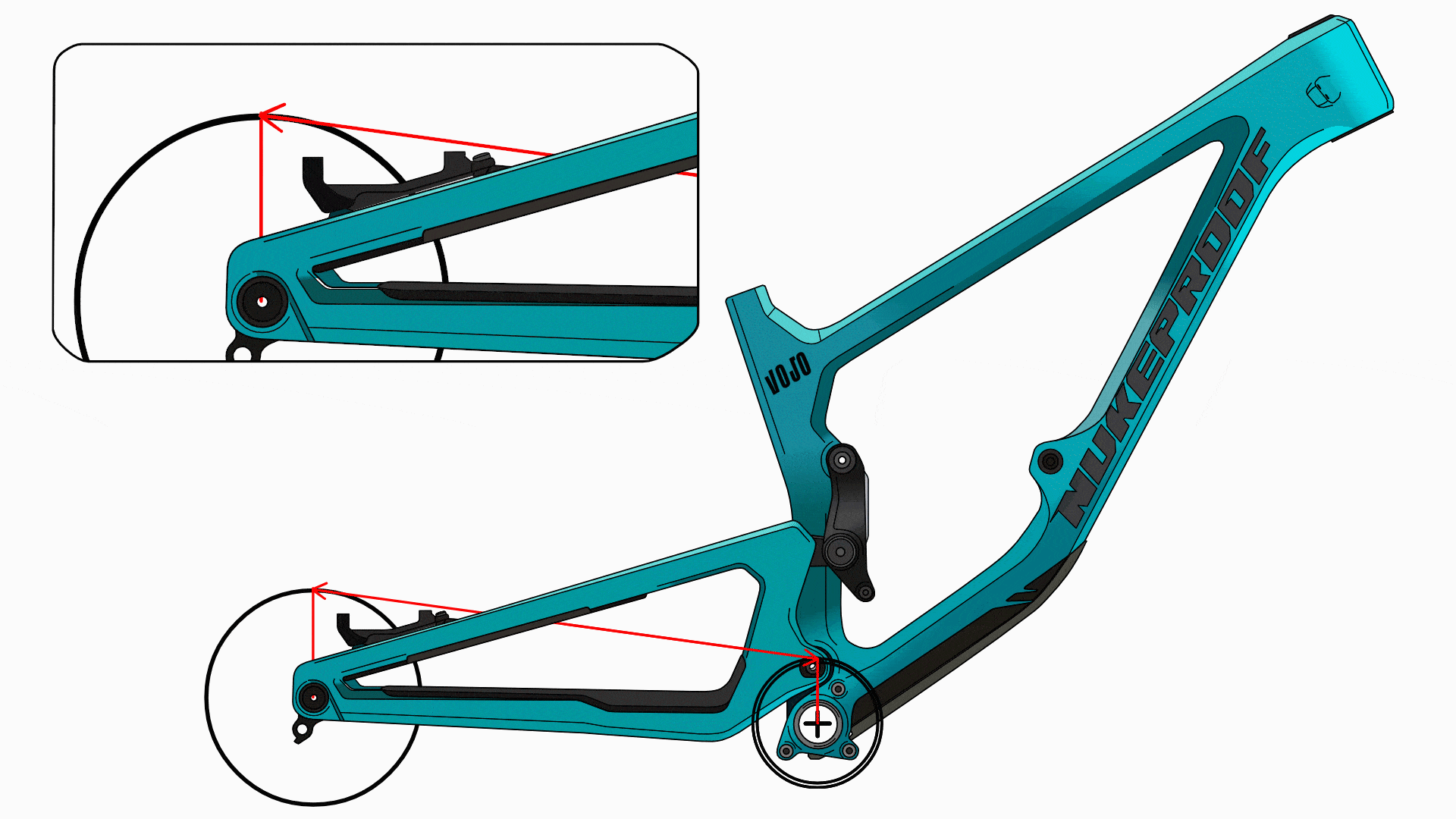 Regardez l’animation ci-dessus : puisque le point de pivot n’est pas concentrique avec le boîtier de pédalier (sauf exception), la distance entre la cassette et le plateau varie lorsque l’amortisseur est comprimé. Cette variation est fonction de l’architecture du vélo et n’est pas nécessairement linéaire.