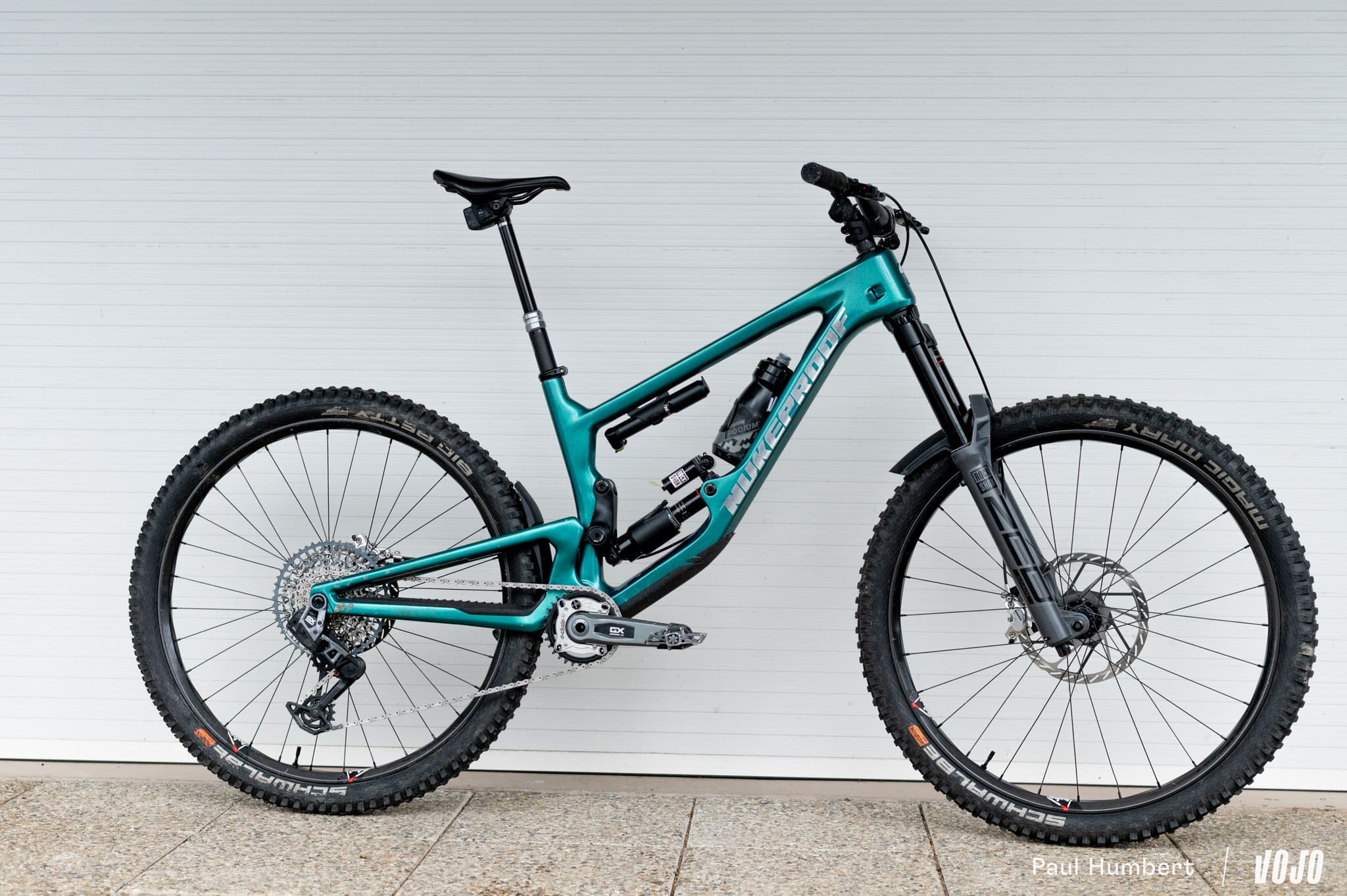 Ce n’est pas en descente pure qu’on trouve une faille au système, ni véritablement en montée, mais entre les deux : dans les portions de relance ou les passages techniques à basse vitesse. Le Nukeproof Giga n’est pas un vélo de course qui va naturellement renvoyer le pilote dans le virage suivant. Il est suffisamment agile pour virer de bord facilement mais en temps normal, il bénéficie aussi des effets de chaîne pour rester « actif ».