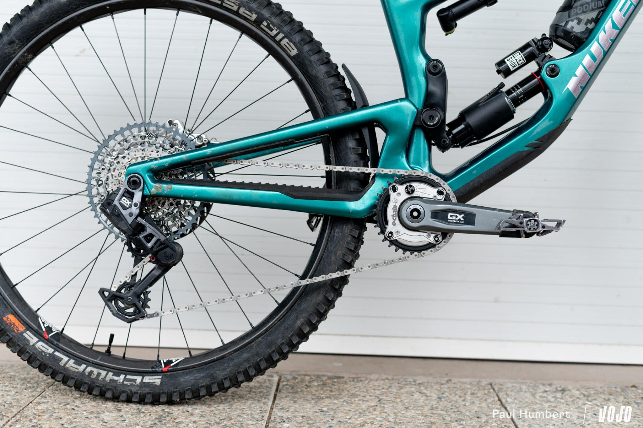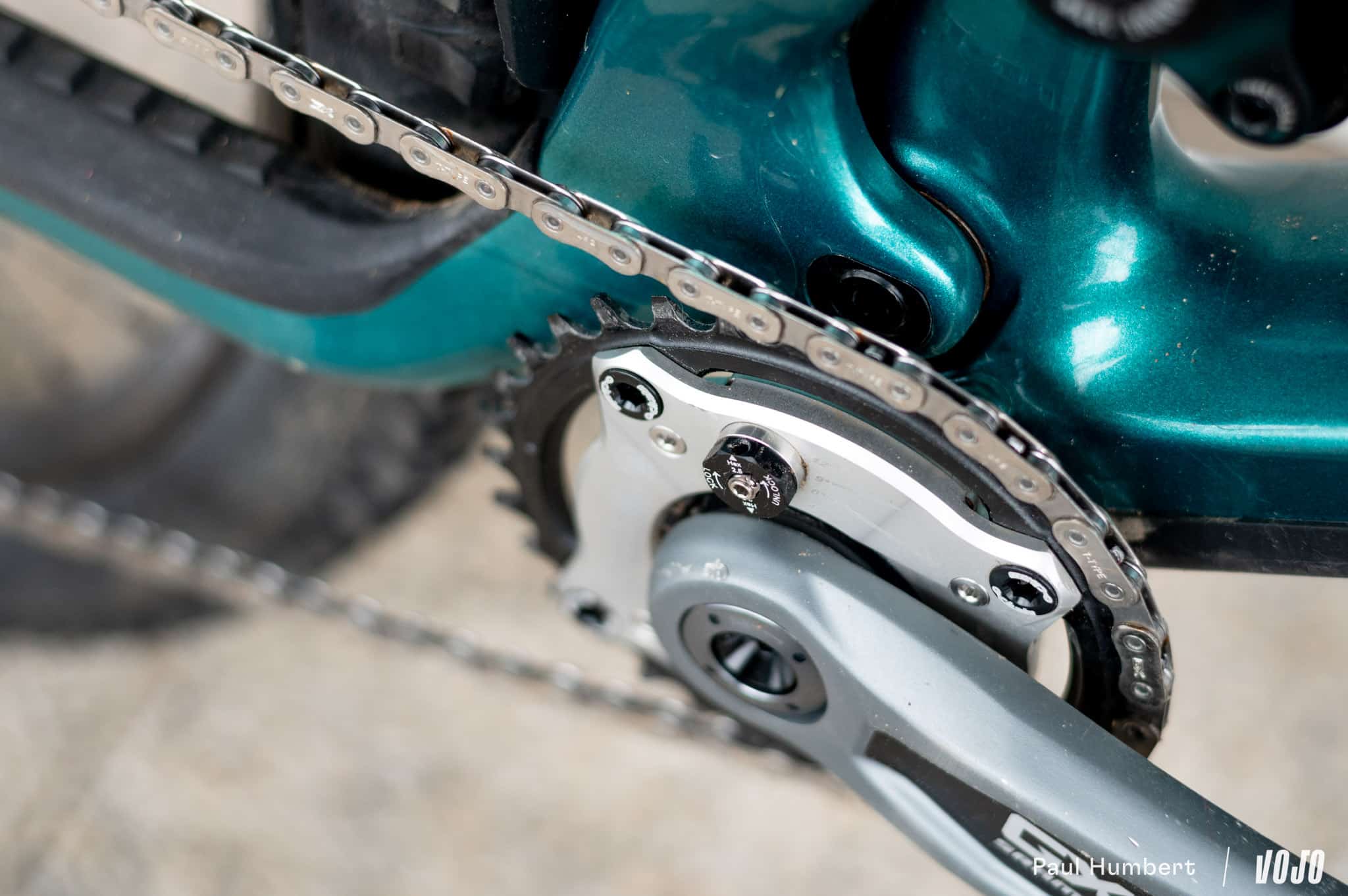 Pour l’installation, exit le plateau Sram T-Type qui est remplacé par celui par la denture « universelle » Ochain. Attention, Ochain assure la compatibilité pour les montages de 32 à 36 dents mais pas de 30 dents. Il est également impossible de conserver les petites protections de plateau de la transmission GX. Malgré ça, et l’absence de guide-chaîne sur notre Giga, nous n’avons souffert que d’un seul déraillement lors de cette prise en main.