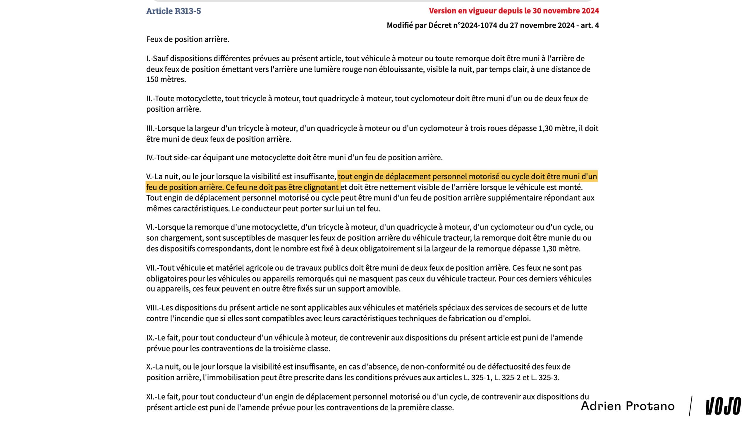 Si ce récent décret fait débat, c’est pour la modification qu’il apporte à l’article 5.313-5, précisant que ce feu arrière « ne doit pas être clignotant« … Un retour en arrière donc puisque celui-ci avait été admis par un précédent décret en 2016. Une décision qui a du mal à être comprise par grand nombre de cyclistes et qui nous a également fait sourciller à la rédaction.