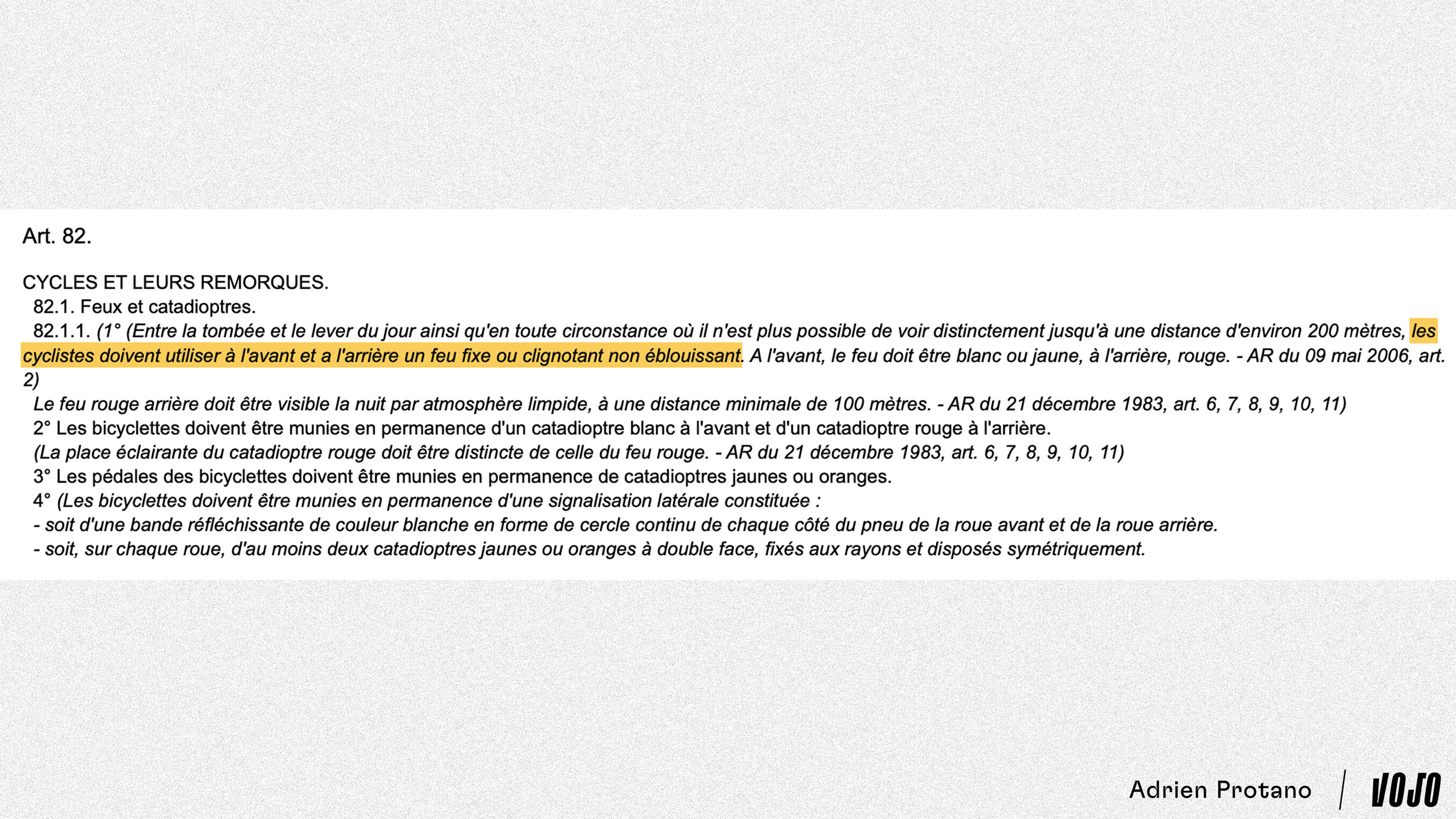 À l’exception de nos lecteurs belges ! L’article 82.1 (de l’arrêté royal du 1er décembre 1975 portant règlement général sur la police de la circulation routière et de l’usage de la voie publique) indique que « les cyclistes doivent utiliser à l’avant et à l’arrière un feu fixe ou clignotant non éblouissant ». Suite aux récentes discussions provoquées par le nouveau décret français, les autorités belges se sont montrées rassurantes : l’interdiction des lampes arrières clignotantes n’est pas prévue en Belgique.