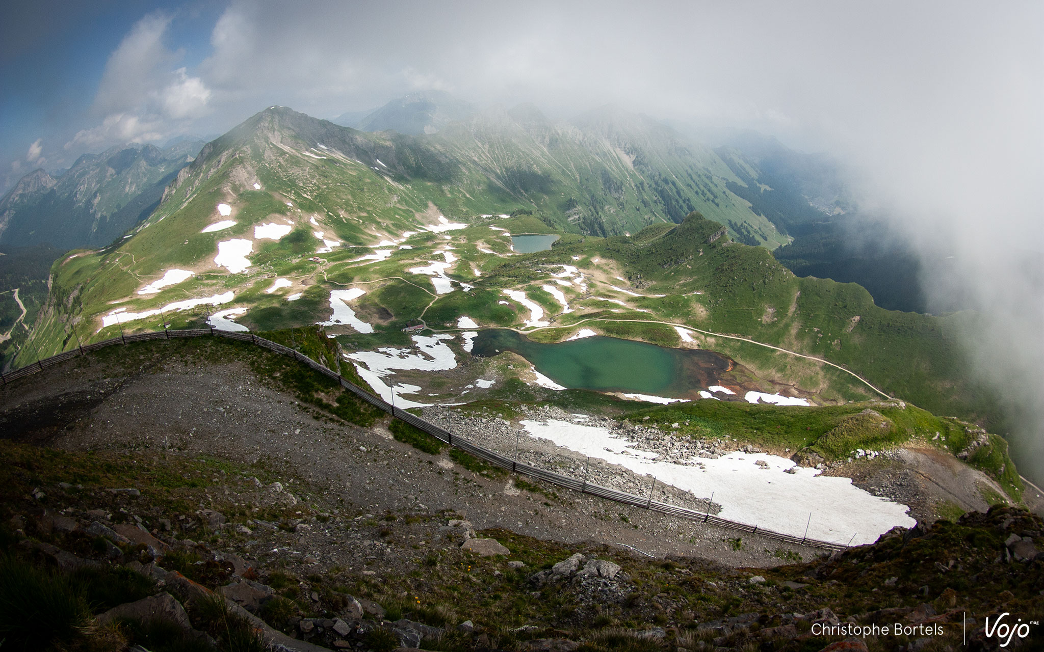 On craignait que la pointe des Mossettes (2277m) n’ait la tête dans les nuages, mais nous arrivons juste à temps pour profiter de la vue à couper le souffle sur le lac Vert avant que le paysage ne se voile.