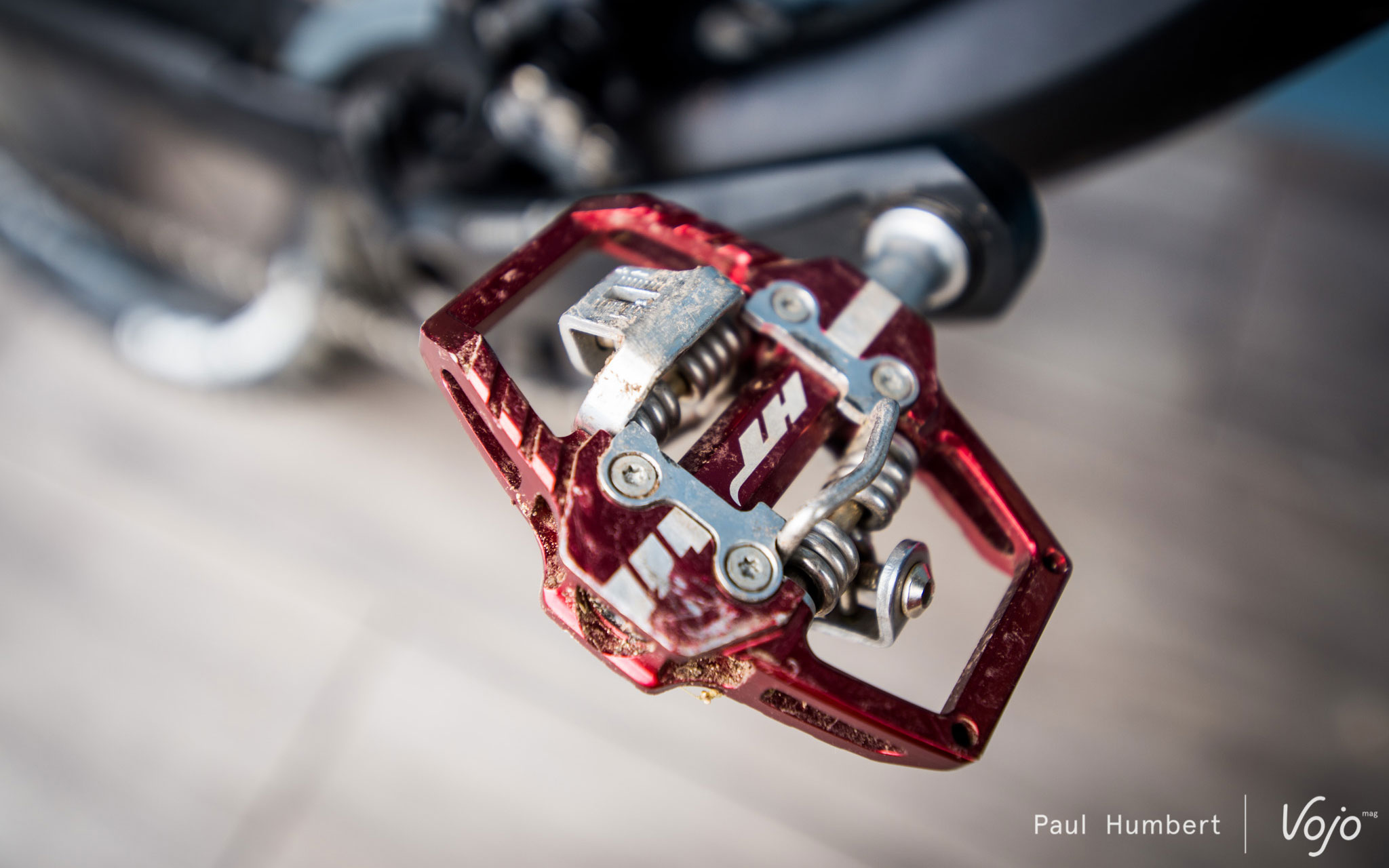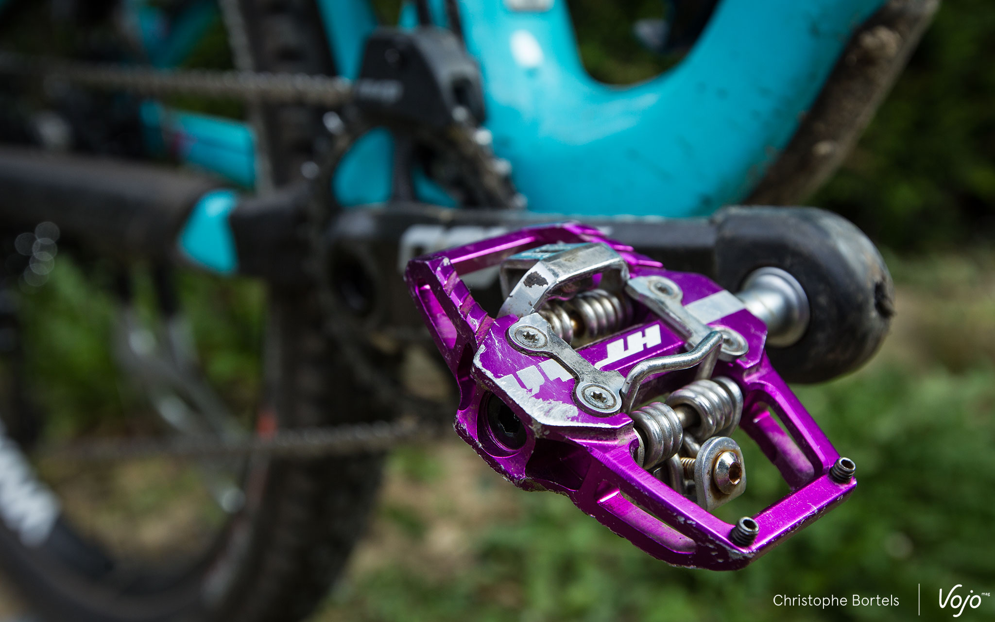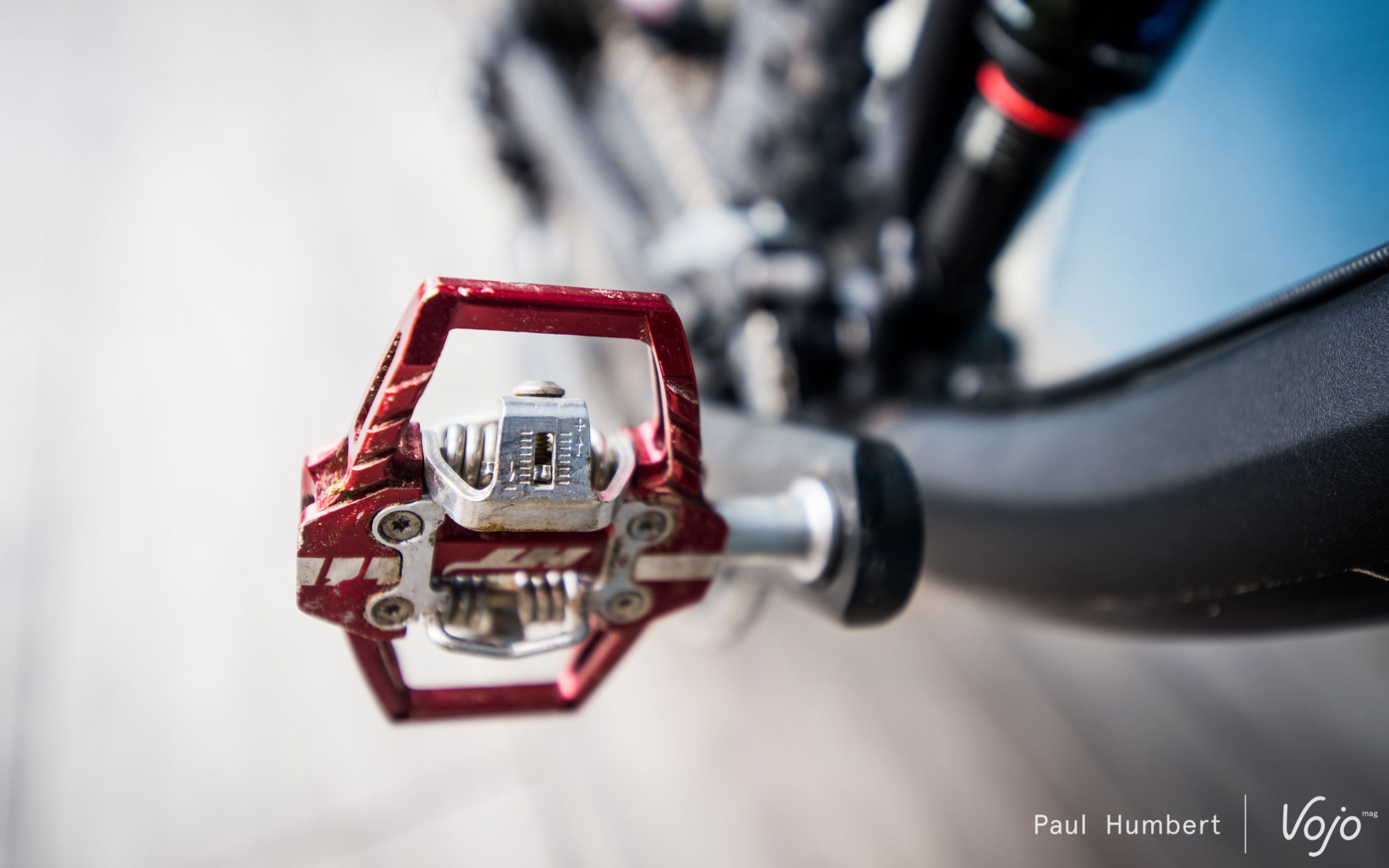 Excepté dans des conditions boueuses, le fonctionnement global est donc très bon. Mais quid de la fiabilité ? Eh bien, après 6 mois d’utilisation intensive par tous les temps, ponctués de dizaines de contacts avec des rochers, racines et autres obstacles, nos exemplaires de test (dont cette version magenta du plus bel effet visible ci-dessus) s’en sortent étonnamment bien, tant esthétiquement que mécaniquement. Des grattes, la couleur qui est partie par endroits, mais un fonctionnement qui est demeuré constant. Les roulements ont quant à eux pris un très (très) léger jeu, à peine perceptible à la main et qu’on ne sent absolument pas à l’usage. Seules quelques traces de rouille sont rapidement apparues du côté des vis de réglage de la tension du ressort. Rien de dramatique en soi donc. Quant aux cales, elles sont elles aussi oxydées et marquées, mais quasi aucune trace d’usure !