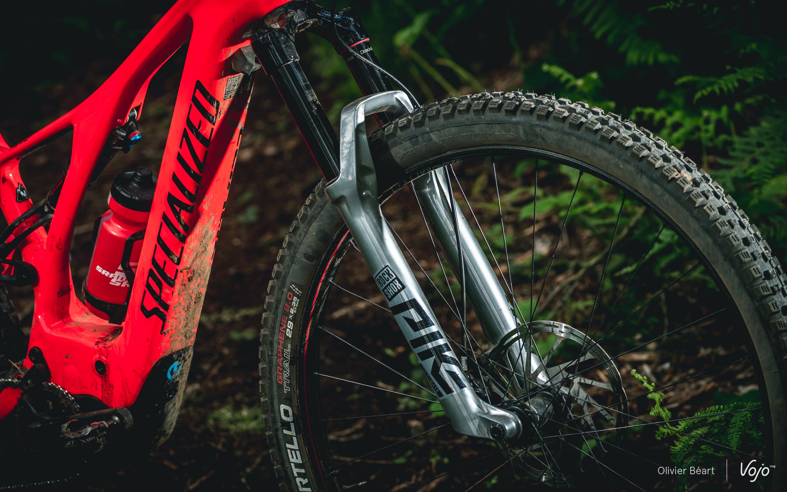 D’origine, le Specialized Levo Comp Carbon est équipé en suspensions Fox Performance. Disons que cela fonctionne plutôt pas mal, mais la fourche F34 performance Grip reste assez basique et surtout lourde. Il y a donc un gros potentiel de gain de poids à ce niveau et aussi de gain d’efficacité en passant sur un modèle plus haut de gamme. L’idée étant de se monter un Levo typé « XC hard » et pas une machine d’enduro, c’est la RockShox Pike Ultimate MY20 qui a été retenue. Son comportement se rapproche très fort de l’excellente Lyrik 2020 (voir notre test ici) mais dans un package plus léger qu’une fourche d’enduro race.