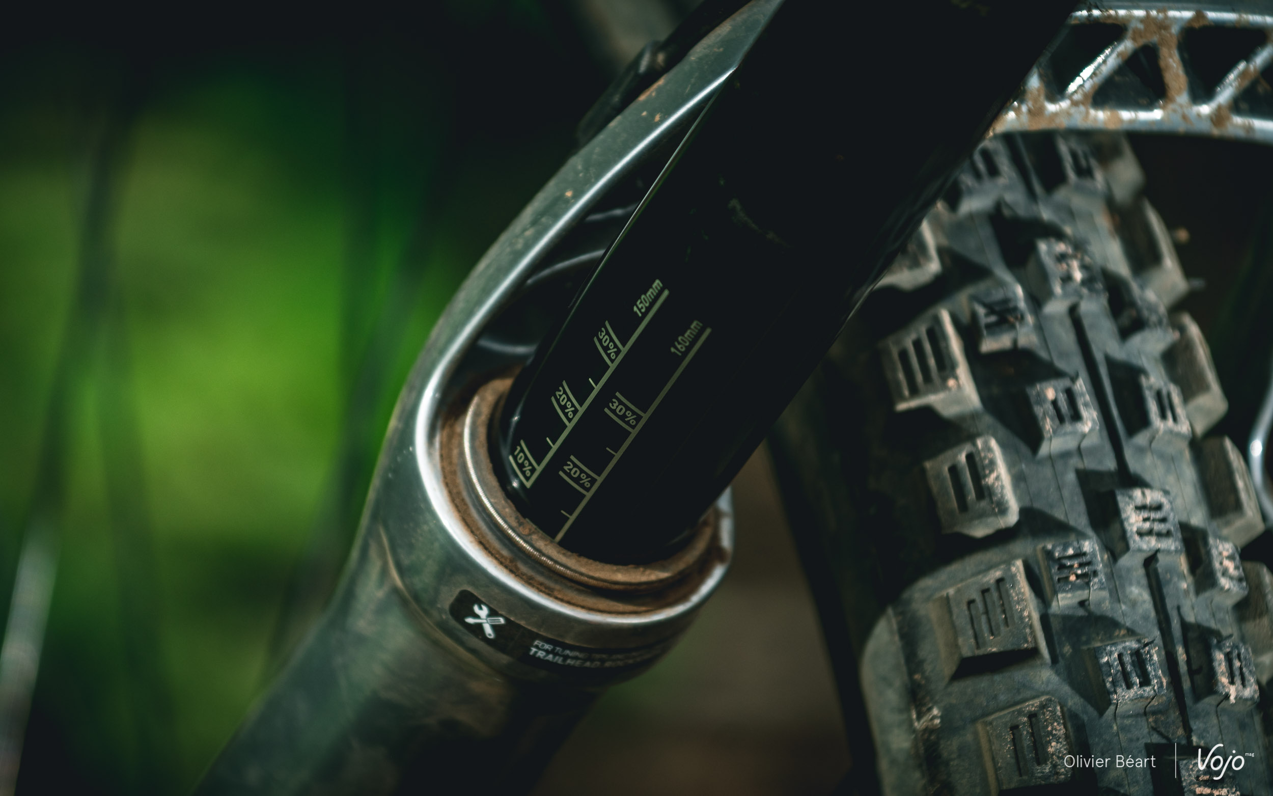 L’amortisseur d’origine est resté longtemps sur le vélo, mais en prévision des championnats du monde, il a fait place à un RockShox identique à celui du modèle Expert et dont le comportement est, selon moi, plus adapté au Levo. Le débattement de 150mm reste inchangé mais le Fox a une petite dureté en début de course qui fait ressentir plus de vibrations en roulant que sur le RockShox, et il suit moins bien sur les successions de chocs. Nous avons aussi rencontré un souci de levier de blocage sur le Fox, qui commençait à avoir tendance à ne plus rester en place et à se bloquer/débloquer tout seul sur terrain chaotique.