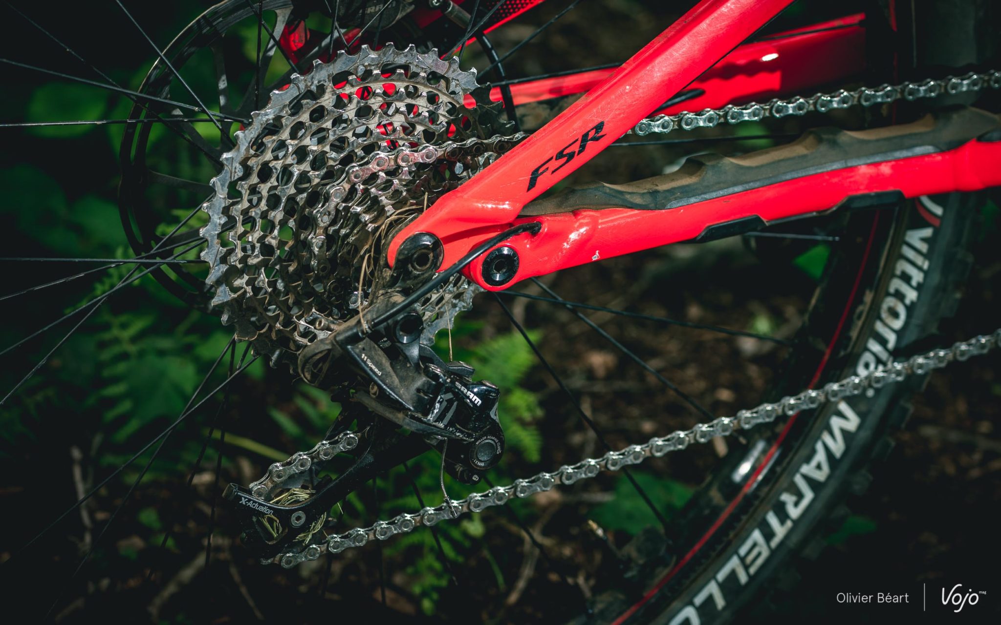 Seule la cassette GX d’origine a été changée pour une XX1 nettement plus légère. Le pédalier Praxxis d’origine n’a pas été changé. Il aurait pu être remplacé par un modèle avec des manivelles en carbone, mais cela aurait juste été pour le luxe. L’important c’est d’avoir des manivelles courtes pour ne pas taper lorsqu’on pédale (et on le fait à plus d’endroits « improbables » en électrique qu’avec un VTT classique), et les Praxxis d’origine sont en 165mm donc c’est parfait.