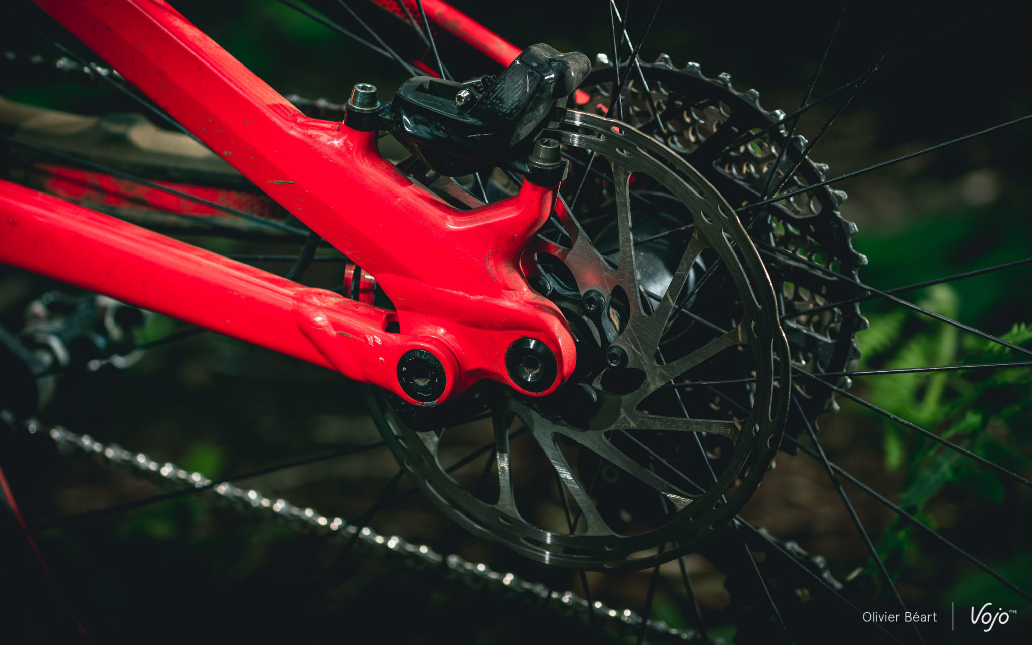 Le disque avant en 200mm a été conservé, mais j’ai passé l’arrière en 180mm pour gagner un peu de poids (disque plus petit et donc plus léger mais aussi un adaptateur en moins grâce au montage de l’étrier en direct sur le cadre). Vu l’usage du vélo et mon poids (75kg), c’est largement suffisant.