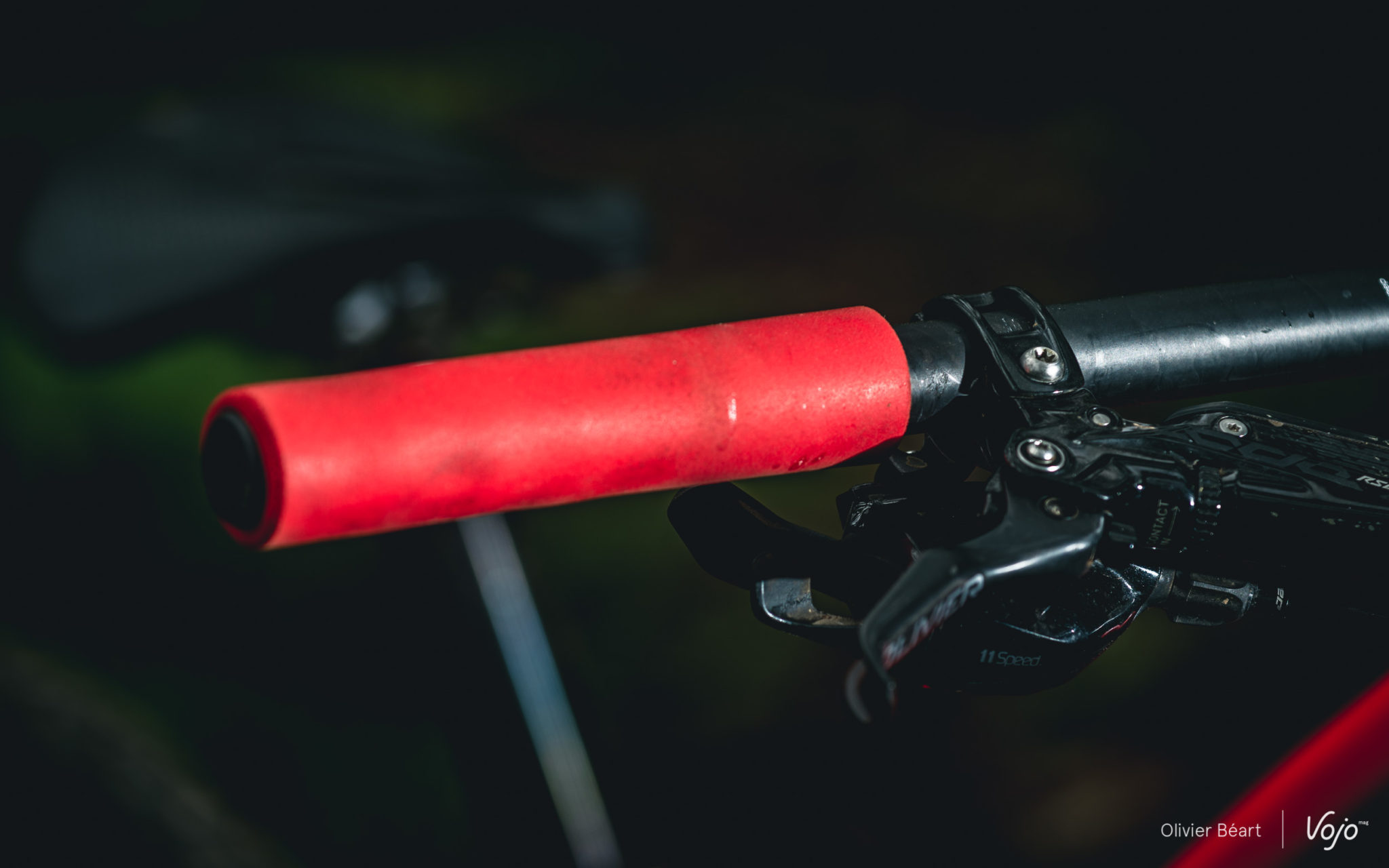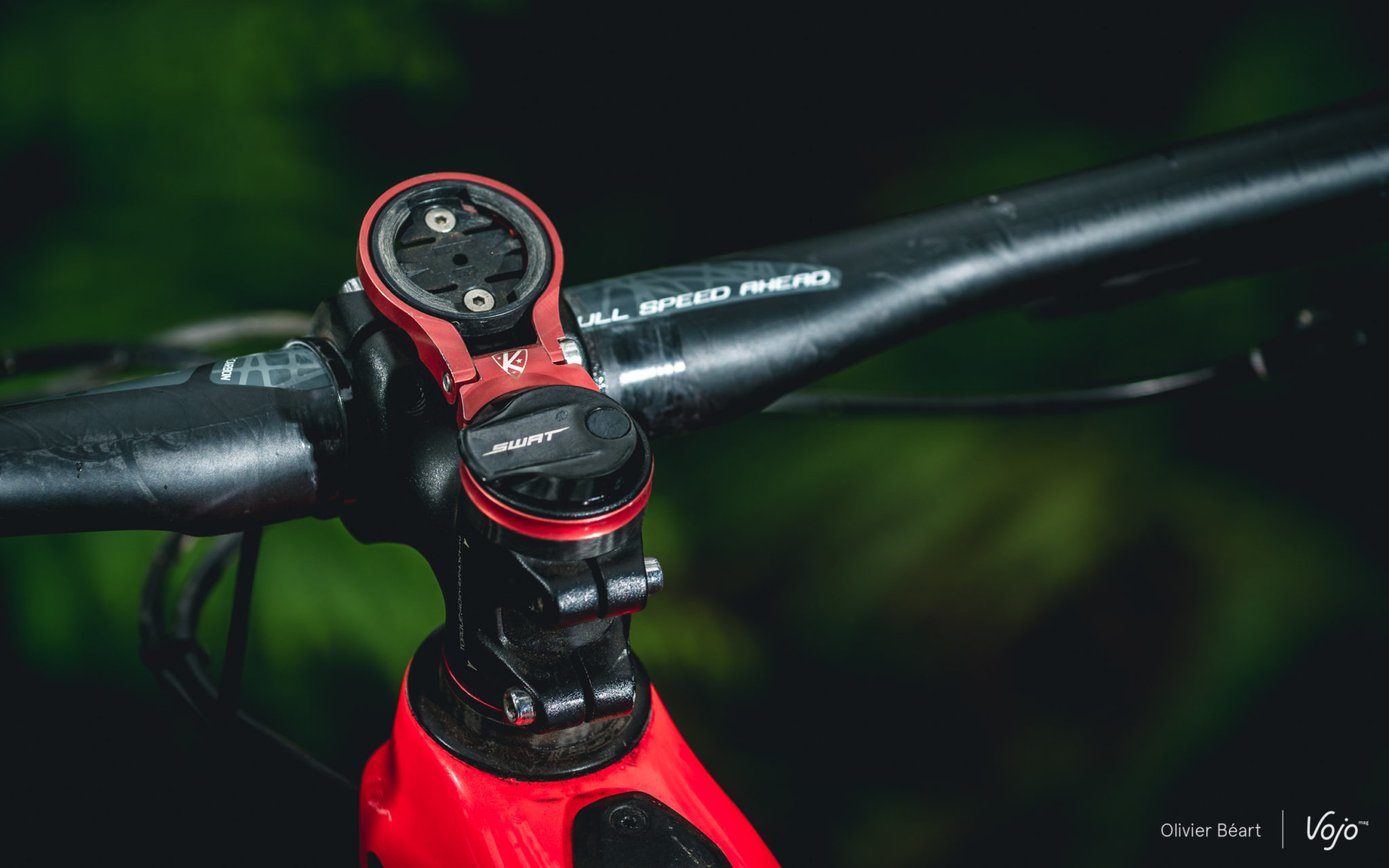 Les grips d’origine ont cédé la place à des modèles en silicone que j’apprécie beaucoup pour leur rapport poids/confort/accroche. Il s’agit ici de Suppacaz Silicone en 32mm de diamètre. Dans le tube de direction, le multi-outil Swat a été installé pour toujours disposer de quoi réparer sur le terrain, ainsi qu’un support GPS K-Edge pour avoir sous le nez les infos utiles (comme la distance) lors de certaines sorties ou épreuves où il faut gérer la batterie. Mais j’aime aussi rouler le Levo sans aucun compteur GPS et j’aime son minimalisme à ce niveau avec le simple petit display d’origine sur le tube supérieur.