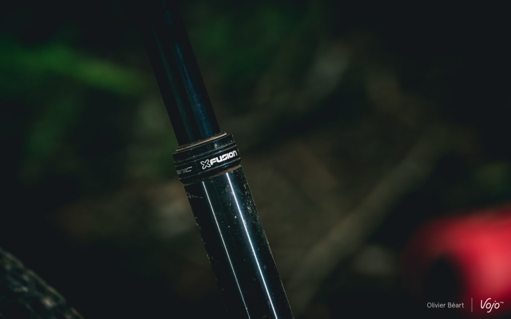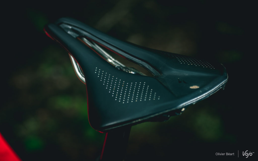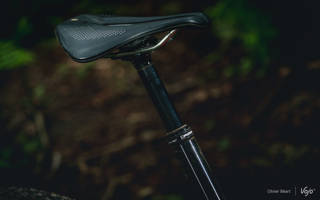 Au niveau de l’assise, la tige de selle X-Fusion Manic d’origine restera sur le vélo. Elle fait bien le job et elle se montre fiable, mais il y a aussi une raison pratique : le Levo a un tube de selle en diamètre 34,9mm ! Il existe encore peu de tiges dans ce diamètre, et la RockShox Reverb AXS dont nous disposons à l’essai est en 31,6. Il existe des adaptateurs, mais nous n’en avions pas sous la main et finalement, le modèle d’origine donne satisfaction. Au niveau de la selle, la Specialized Phenom Comp d’origine a été remplacée par la Specialized Power qui est ma préférée quand il est question d’enchaîner les heures de selle car je n’ai jamais la moindre douleur avec elle. Et comme j’ai fait les 24h des Crapauds en solo avec ce vélo… vous comprenez que c’était important !
