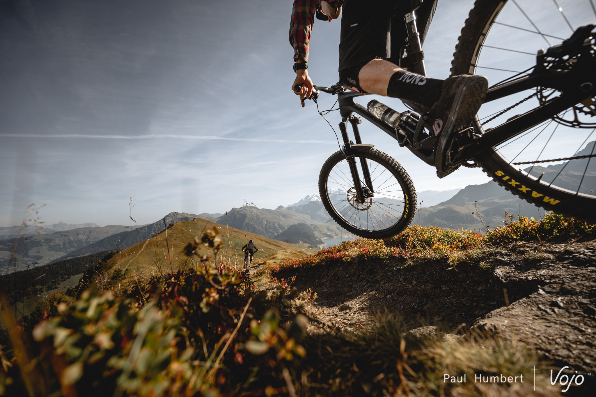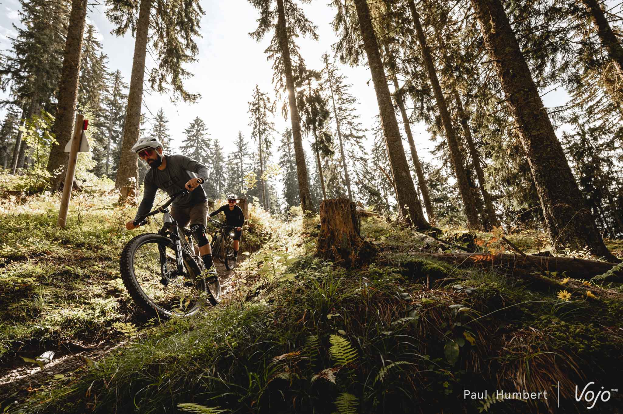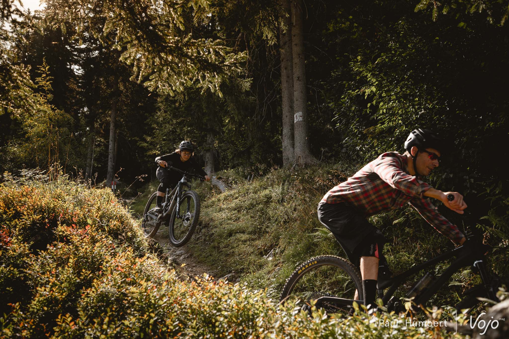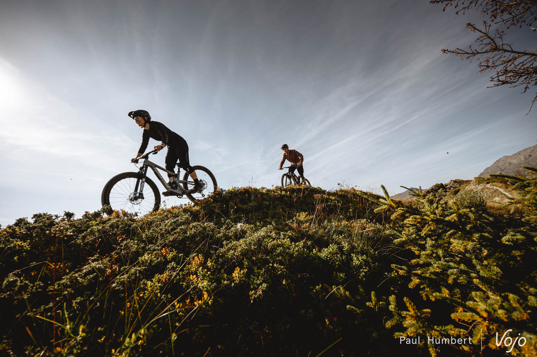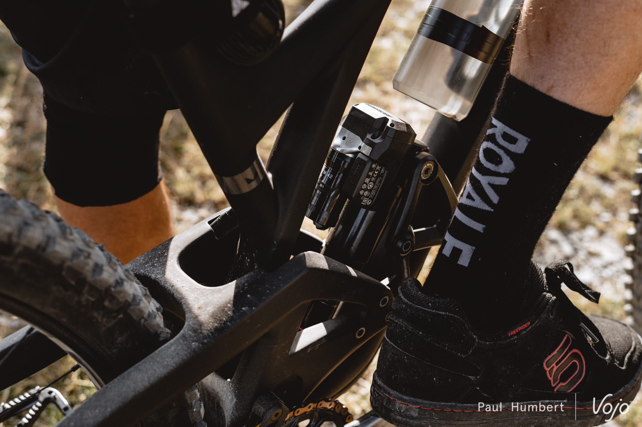Dans cette configuration, le système passe plus facilement sur le mode dissocié ce qui rend le vélo redoutable dans les montées techniques : l’avant encaisse le choc en souplesse tandis que l’arrière reste haut et ne s’affaisse pas. Attention, sur les plus gros chocs (franchissement d’une marche par exemple), l’arrière peut parfois s’ouvrir complètement, encore plus avec le Bias à -2. C’est intéressant pour le grip mais cela peut surprendre si on s’attend à du support au moment de pousser sur les jambes.
