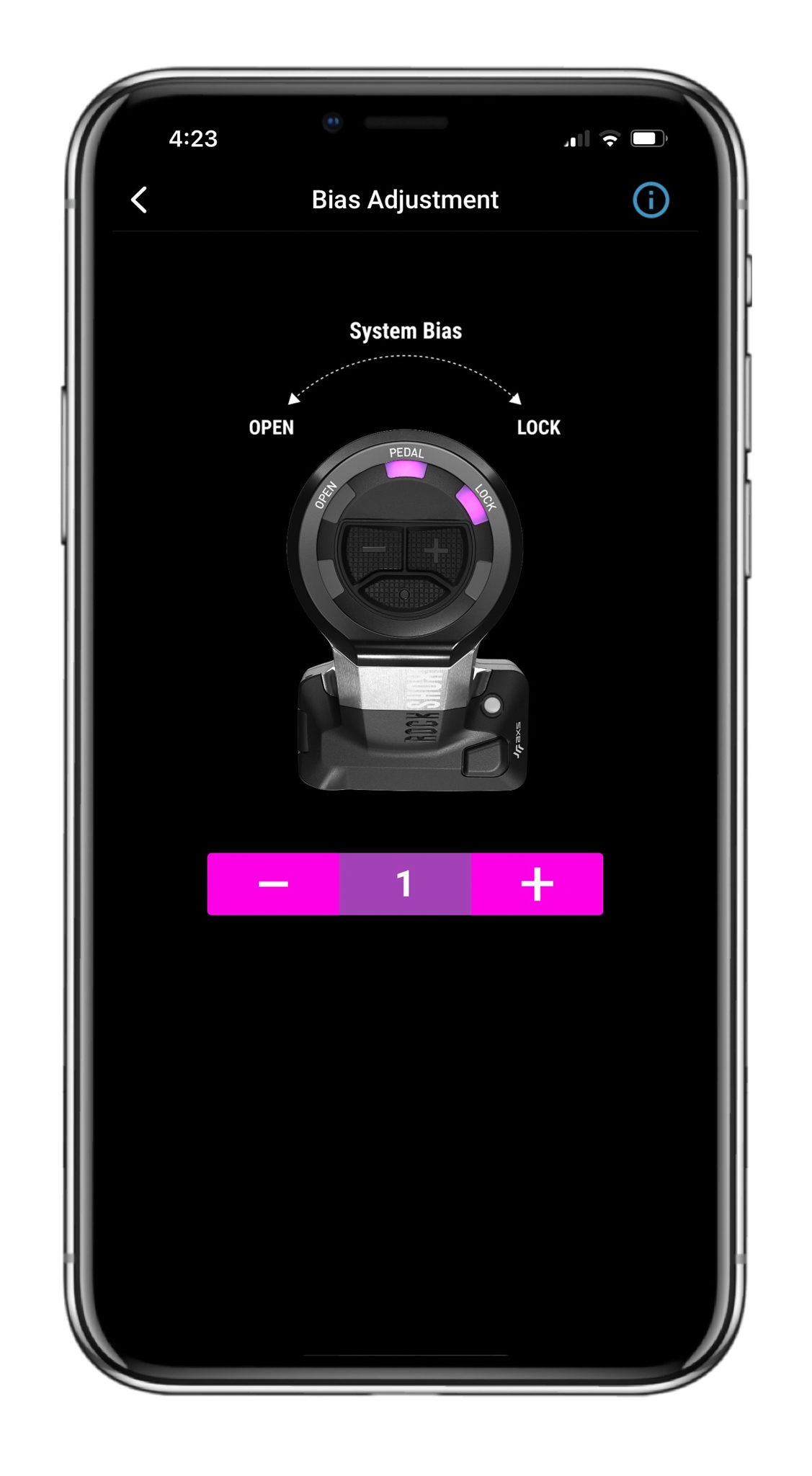 Trop simple ? Ce mode automatique est réglable : c’est le Bias, la tendance du système comme le dit Dimitri… ou son biais, tout simplement. D’une position de départ neutre, on peut l’orienter jusqu’à deux crans vers le « plus ouvert » ou vers le « plus fermé ». Cela fait donc 5 positions au total, qui permettent de personnaliser selon ses goûts, son vélo ou son terrain le fonctionnement du Flight Attendant. On peut ainsi l’encourager à passer plus de temps sur le mode intermédiaire que sur l’ouvert lorsqu’on pédale mais que le chemin est technique, ou l’inverse. Lorsqu’on est dans le réglage du Bias, les diodes sont couleur Magenta.