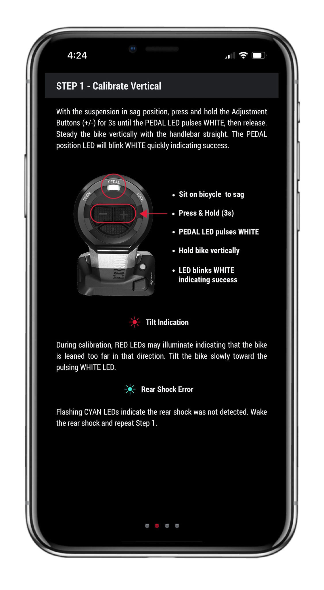 Avant d’aller rouler, il faut toutefois passer par l’essentielle étape de calibrage des capteurs. On règle d’abord les suspensions à sa convenance (sag, rebond et compression) puis on suit les instructions de l’application. Lorsque l’unité centrale clignote rapidement en blanc, c’est tout bon et on peut y aller !