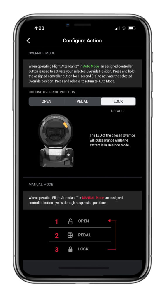 Enfin, on peut utiliser le Flight Attendant en mode manuel, comme un blocage trois positions classique. Le système se commande alors depuis l’unité centrale ou la manette et les diodes émettent une lueur rouge. Pour quitter ou revenir au mode automatique, il faut obligatoirement passer par l’unité centrale (longue pression sur le bouton principal).