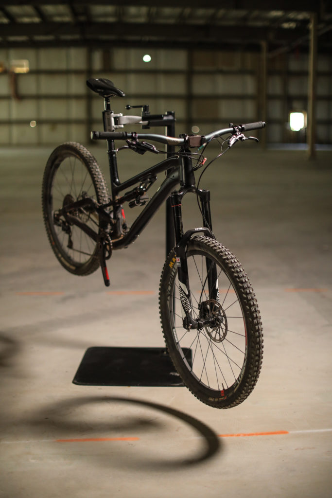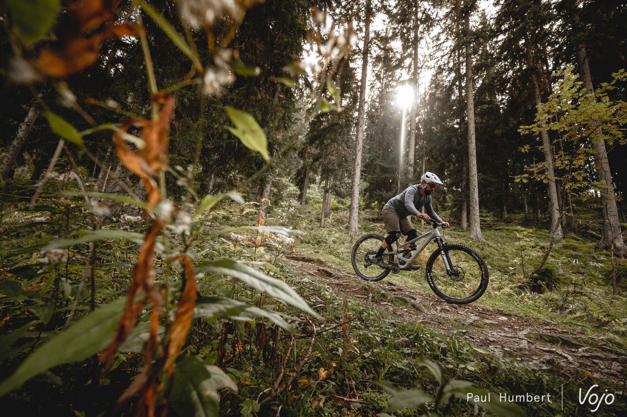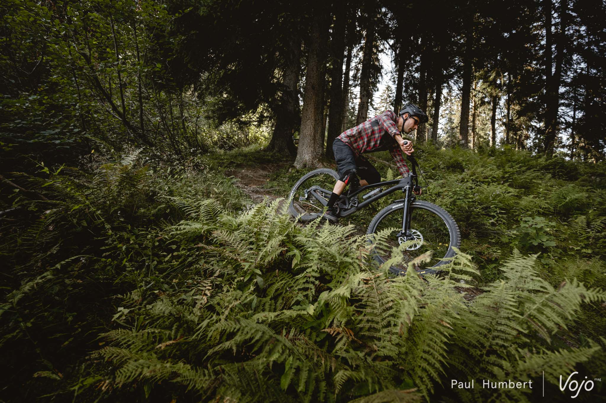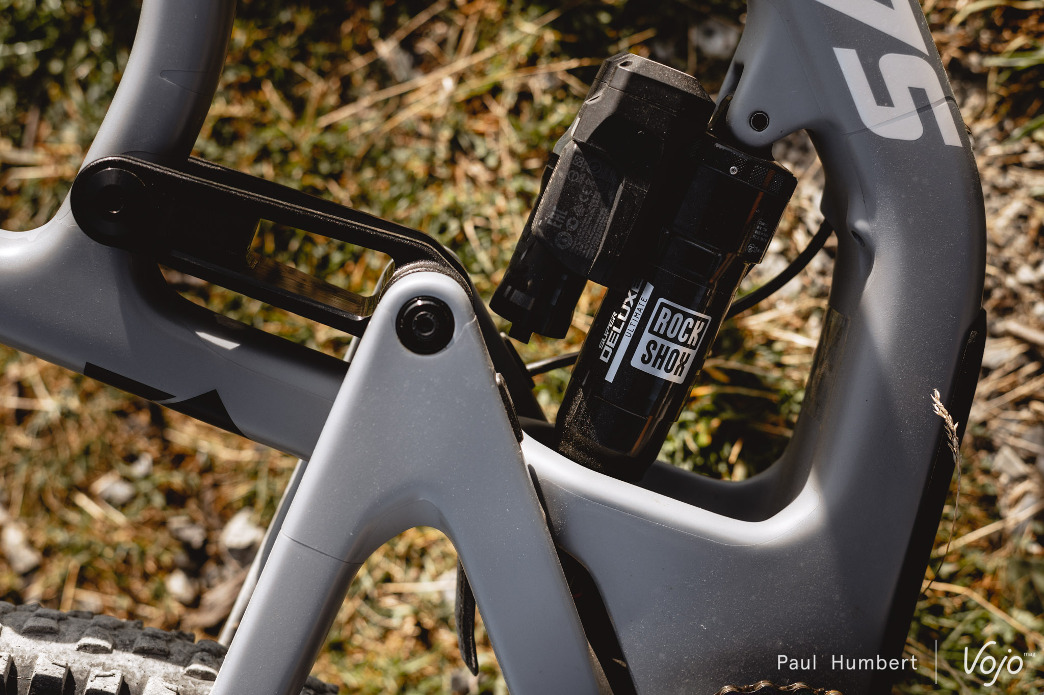 Dans cette configuration, le système passe plus facilement sur le mode dissocié ce qui rend le vélo redoutable dans les montées techniques : l’avant encaisse le choc en souplesse tandis que l’arrière reste haut et ne s’affaisse pas. Attention, sur les plus gros chocs (franchissement d’une marche par exemple), l’arrière peut parfois s’ouvrir complètement, encore plus avec le Bias à -2. C’est intéressant pour le grip mais cela peut surprendre si on s’attend à du support au moment de pousser sur les jambes.