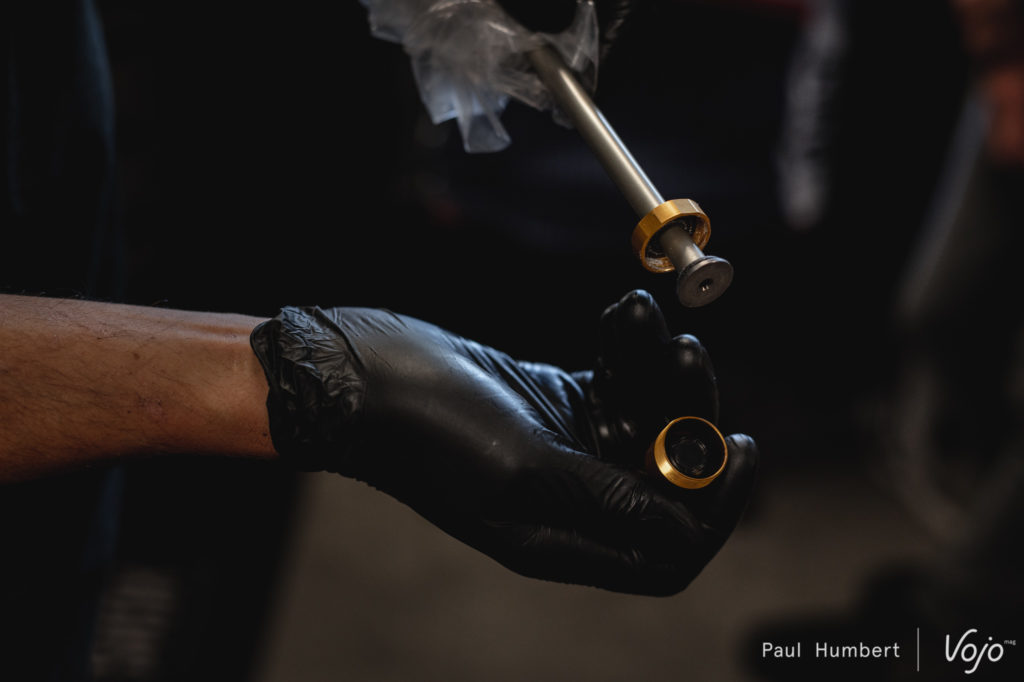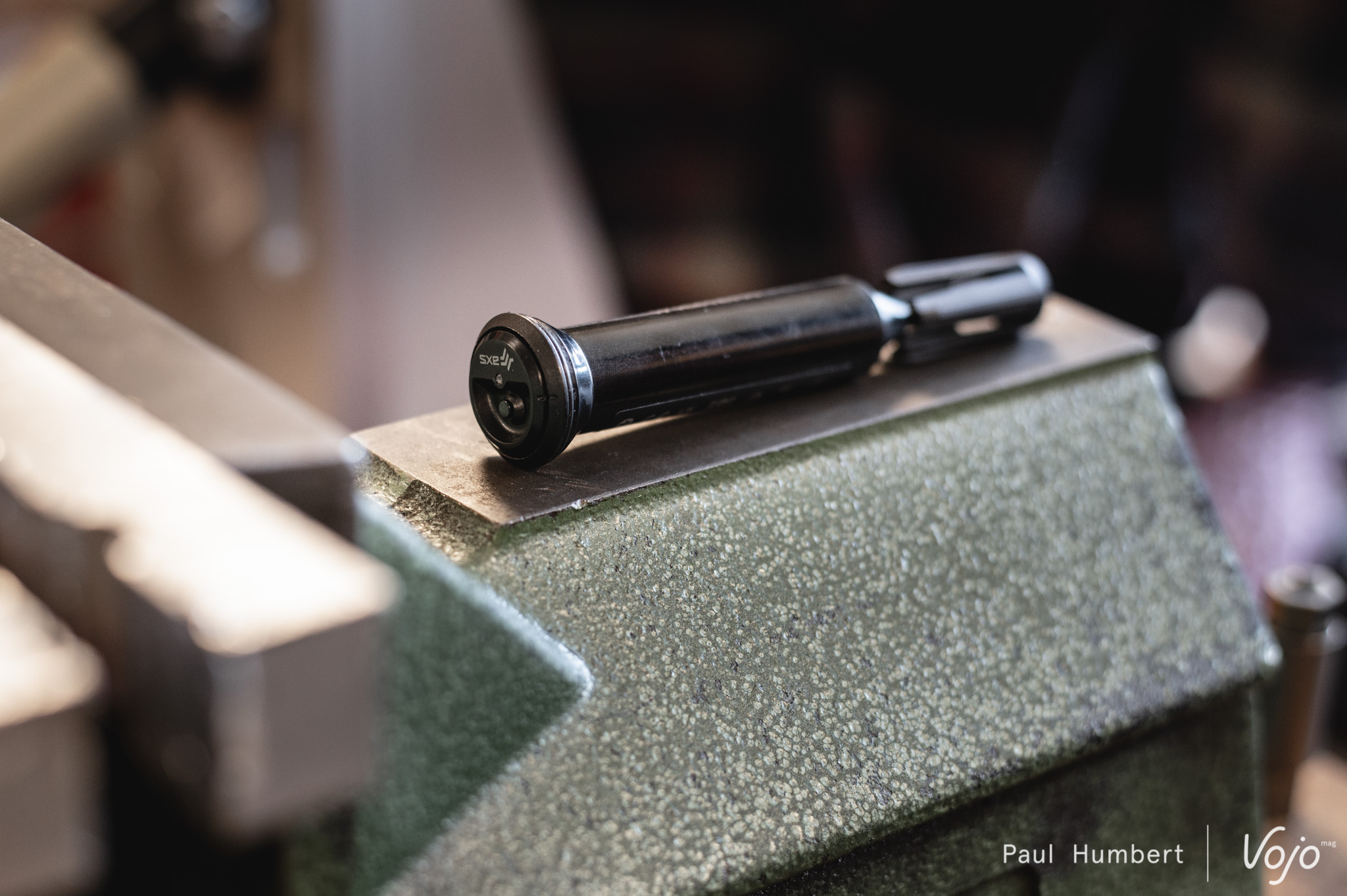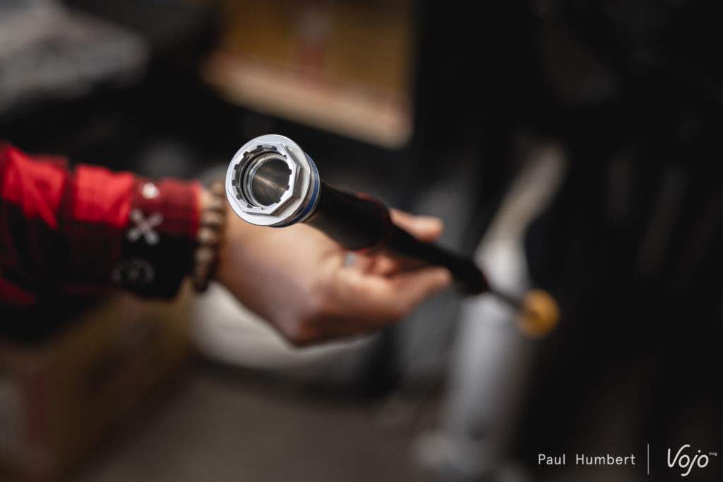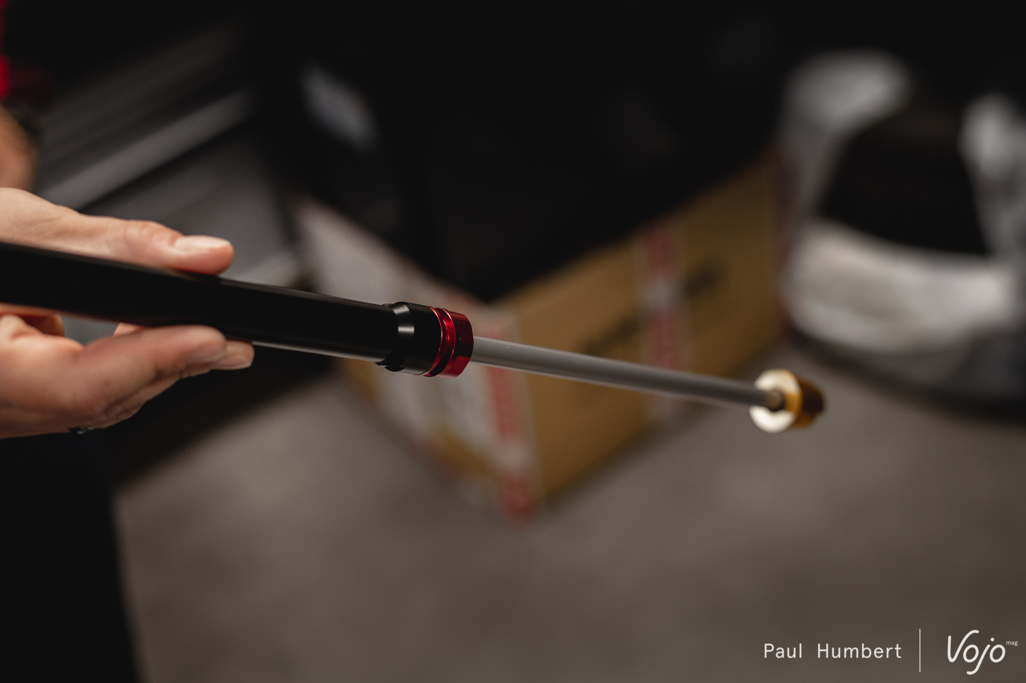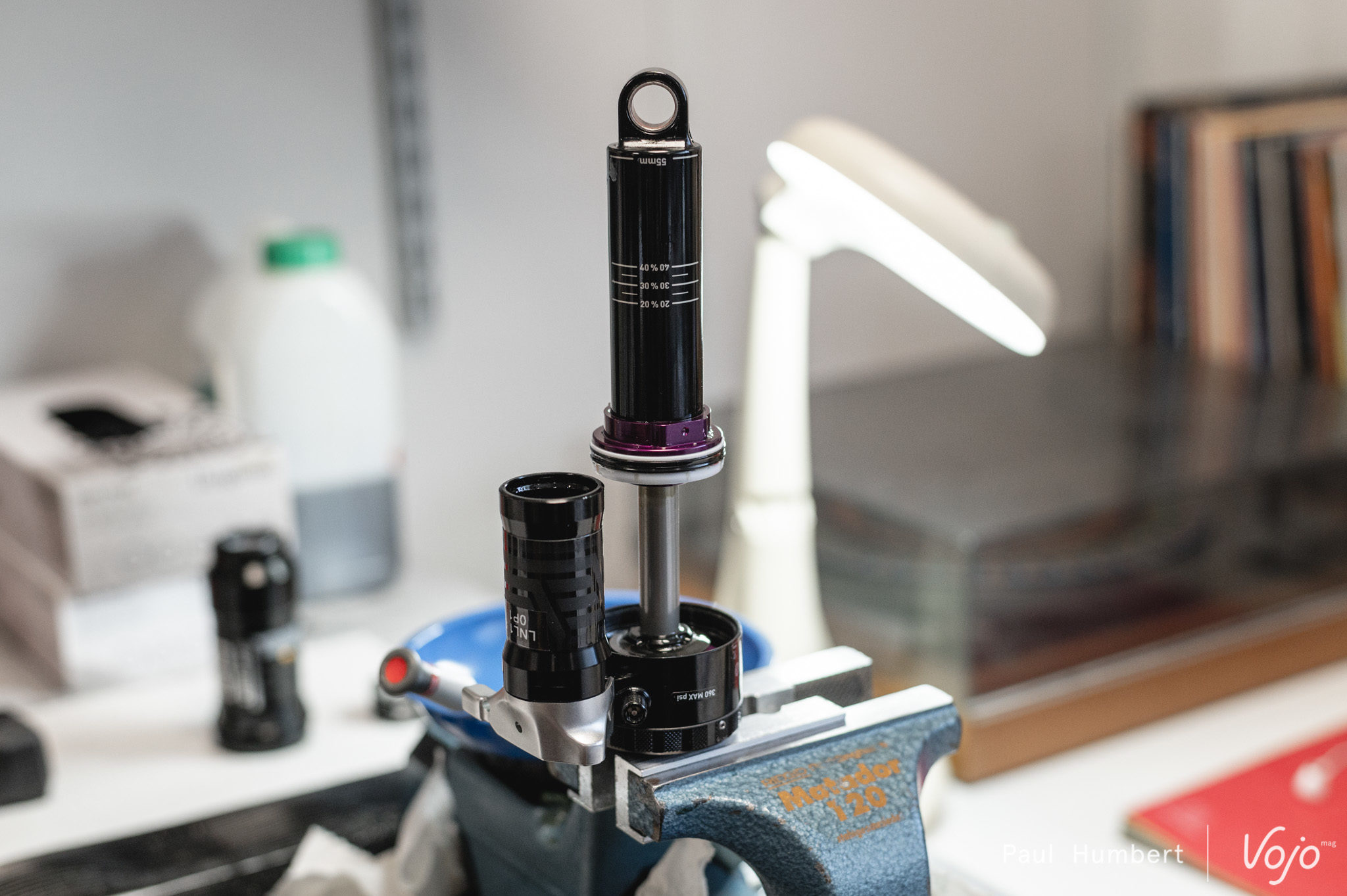 Pour jouer avec ces tokens, il faudra toutefois passer par une manipulation supplémentaire comparé aux amortisseurs habituels : le démontage du bloc électronique, qui empêche de démonter la boîte à air. Rien de bien difficile en apparence, Dimitri l’a fait devant nous en quelques instants et il suffit de dévisser 3 vis à tête hexagonale de 3 mm, mais il est toujours bon de le savoir.