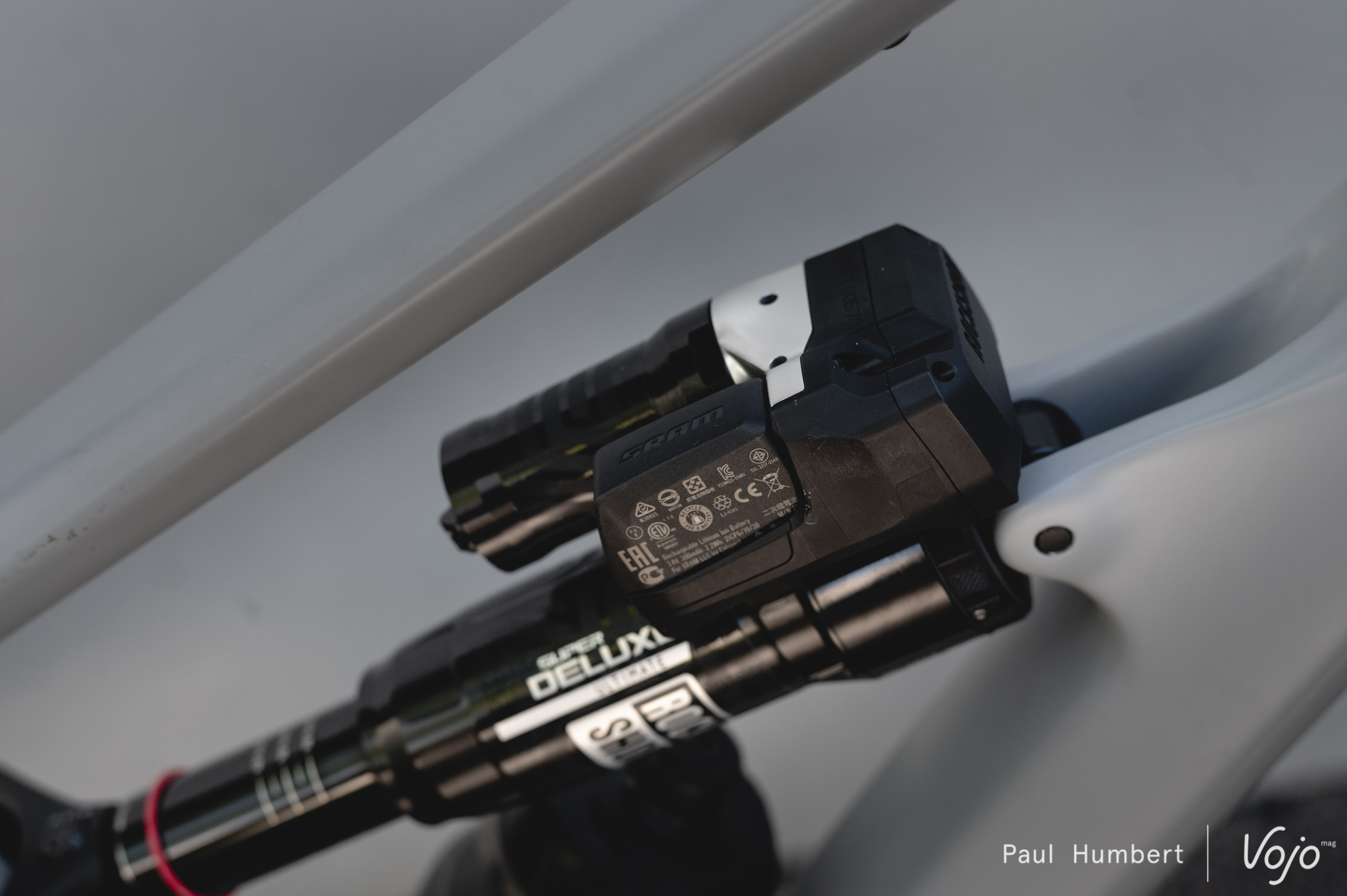 Sur l’amortisseur, un boîtier qui renferme un autre petit moteur, avec les mêmes fonctions que sur la fourche. Il agit selon les instructions envoyées par l’unité centrale et fonctionne lui aussi grâce à une batterie AXS.