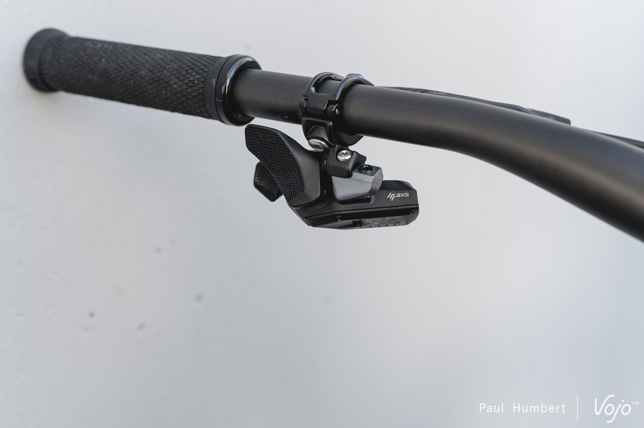 Enfin, et vous allez comprendre pourquoi nous parlions de trois composants « et demi », le système peut être contrôlé depuis le cintre grâce à une manette AXS classique. Toutefois, comme on parle d’un système électronique sans fil, tout est programmable et sur notre vélo, elle commandait également la tige de selle télescopique. On peut aussi se passer de cette manette et tout faire depuis l’unité centrale, ou depuis l’application Sram AXS.