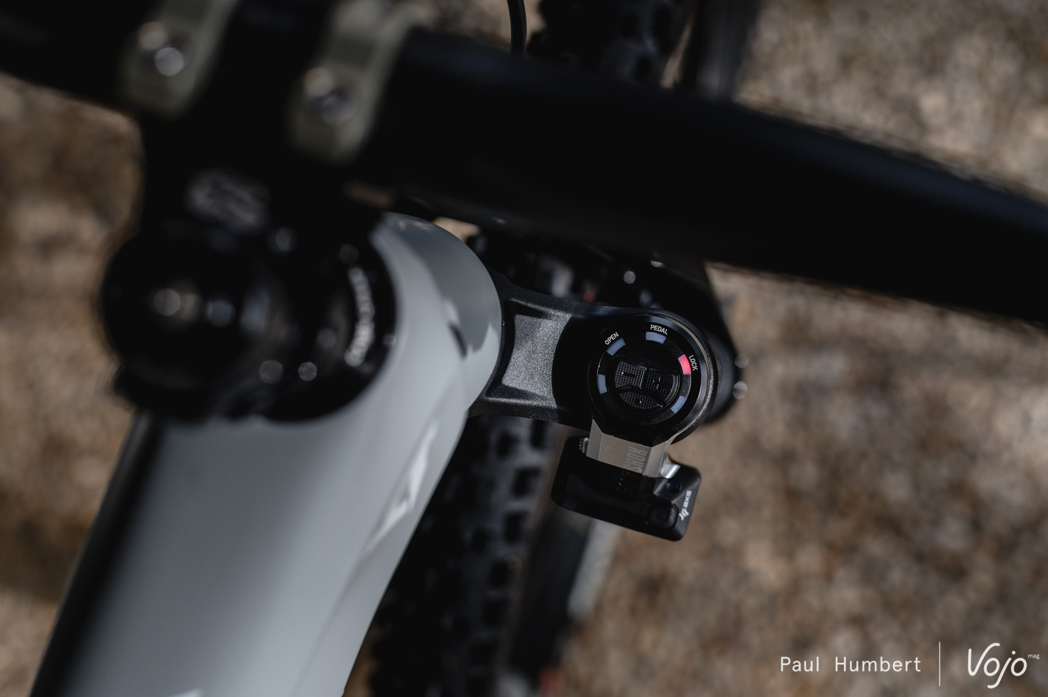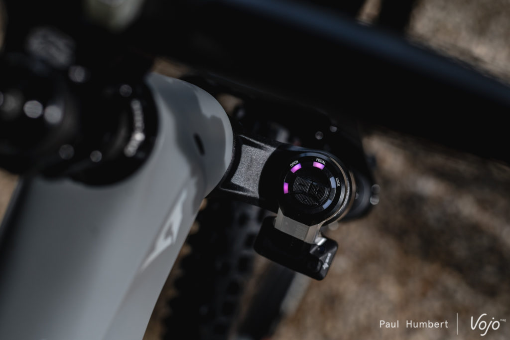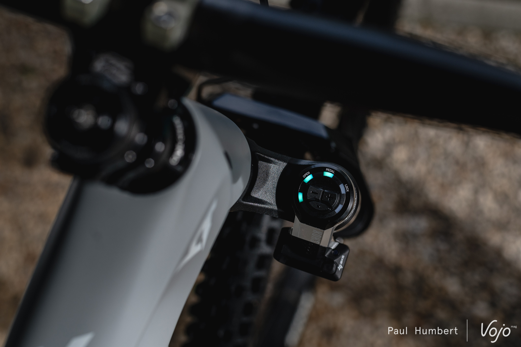 Le système est également capable, en mode automatique, de dissocier l’amortisseur de la fourche et de garder le premier en mode intermédiaire tout en ouvrant complètement la seconde. Cela permet de donner plus d’adhérence et de confort à l’avant tout en gardant du support à l’arrière, un cocktail qui peut s’avérer redoutable dans les montées techniques. Sur l’unité centrale, cela se traduit par deux diodes allumées en vert, celle du mode ouvert et celle de l’intermédiaire.