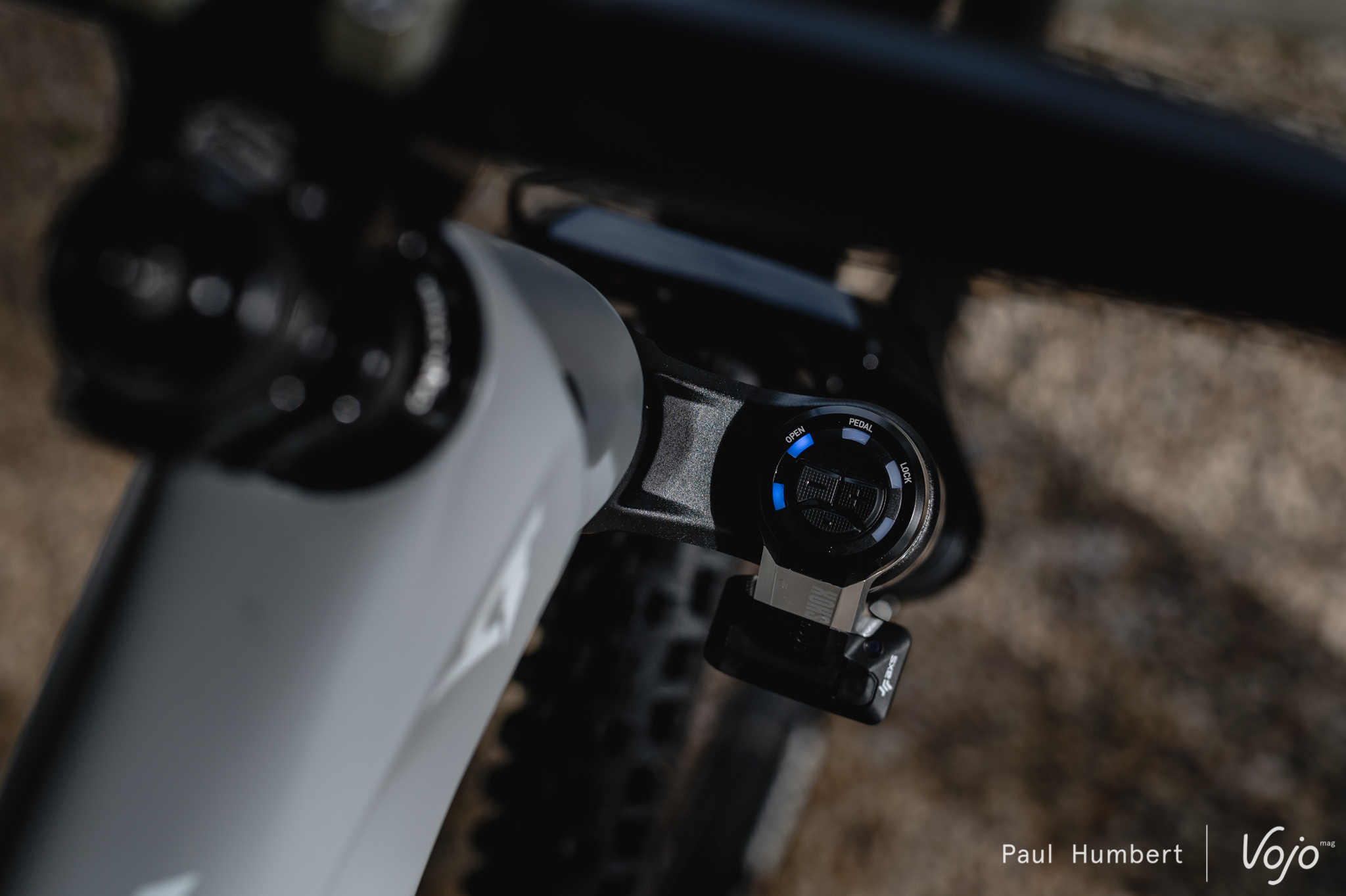 Sur la fourche, on a l’unité centrale qui traite toutes les données (pédalage, chocs, pente) et qui est dotée d’un module de commande, ainsi que le moteur qui agit sur la configuration de la cartouche : ouverte, position intermédiaire ou fermée. Une batterie AXS classique alimente tout ce petit monde en électricité.