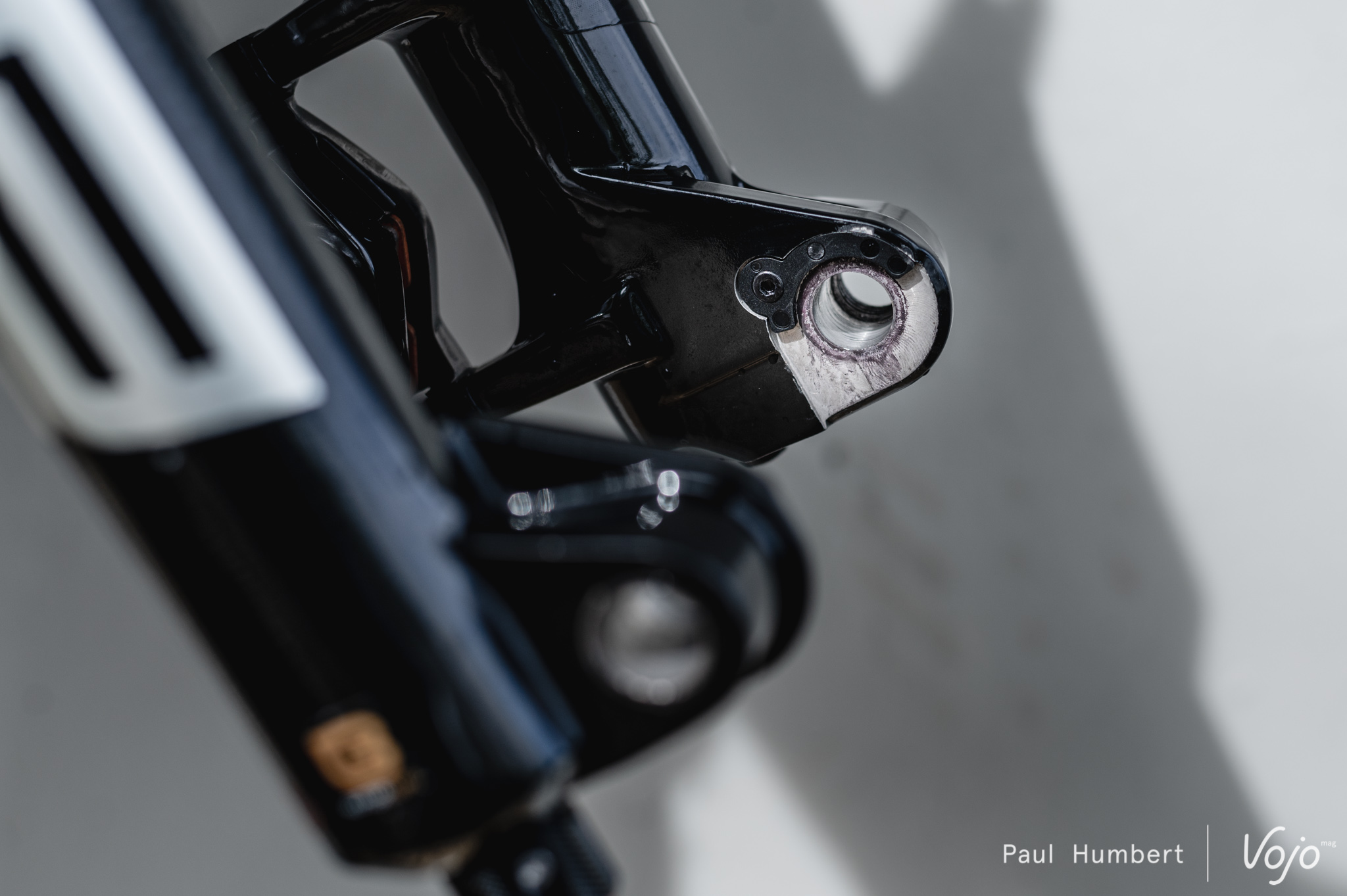 Sur ce nouveau châssis, on découvre de petites valves à l’arrière des fourreaux qui permettent de « purger » les fourreaux en cas de surpression causée par l’enchaînement de longues descentes ou les variations d’altitude. Ce n’est pas nouveau sur le marché puisque Fox et SR Suntour en utilisent déjà mais chez RockShox, c’est bel et bien une première.