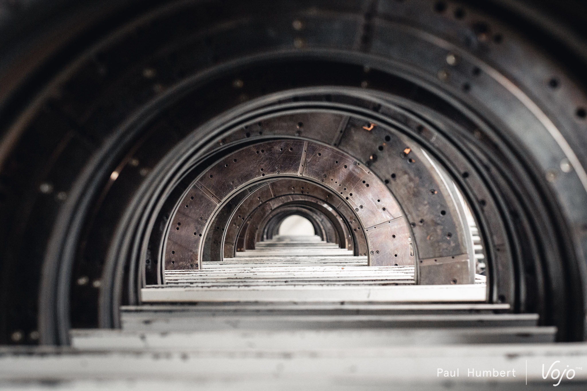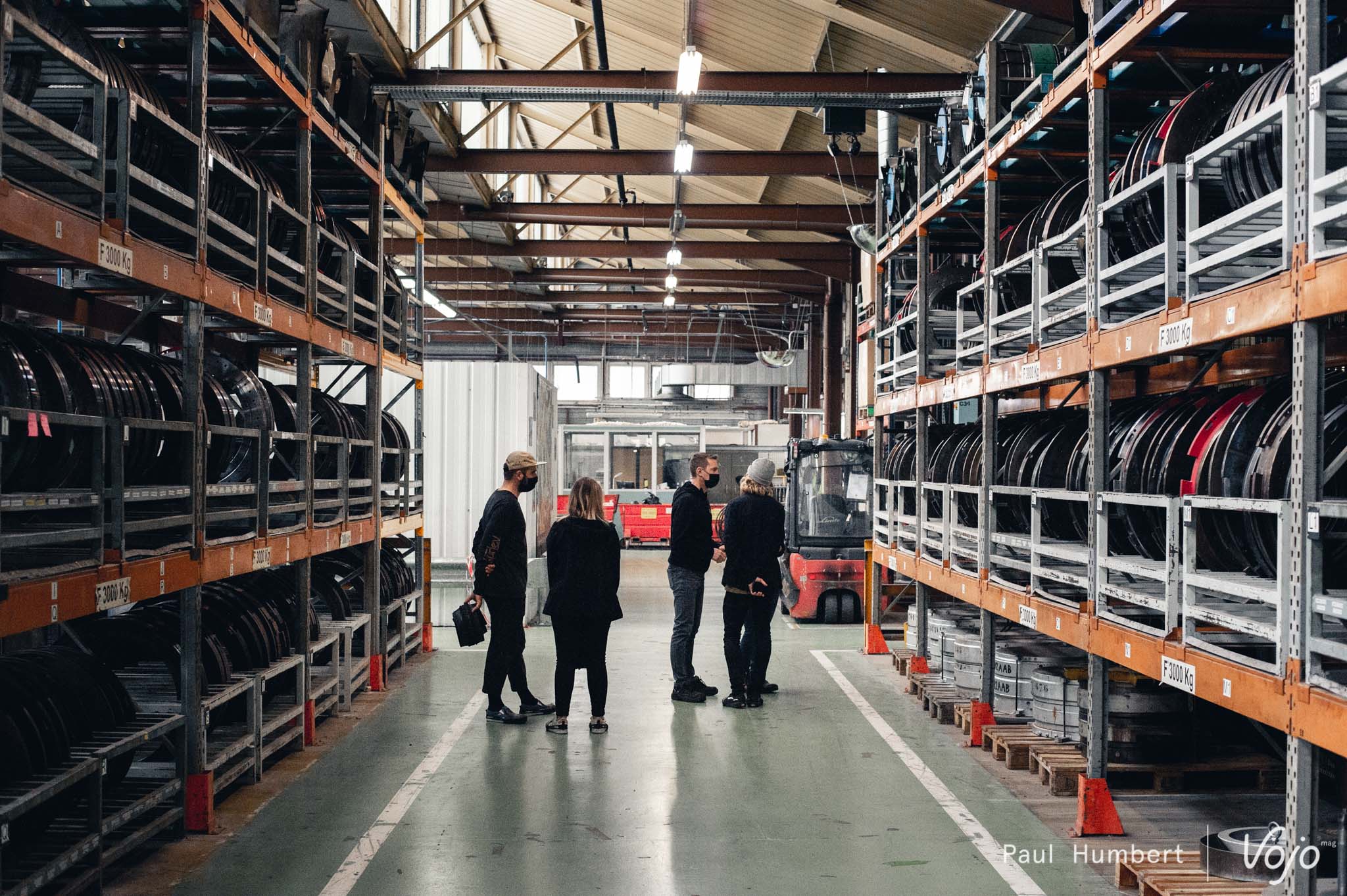 Dans d’immenses étagères, on découvre de lourds cercles d’acier dans lesquels apparaissent les dessins des pneus et l’empreinte des crampons.