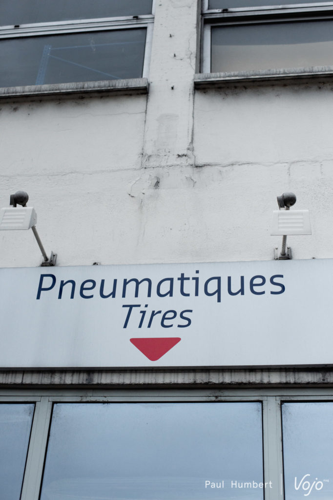 Dans d’immenses étagères, on découvre de lourds cercles d’acier dans lesquels apparaissent les dessins des pneus et l’empreinte des crampons.
