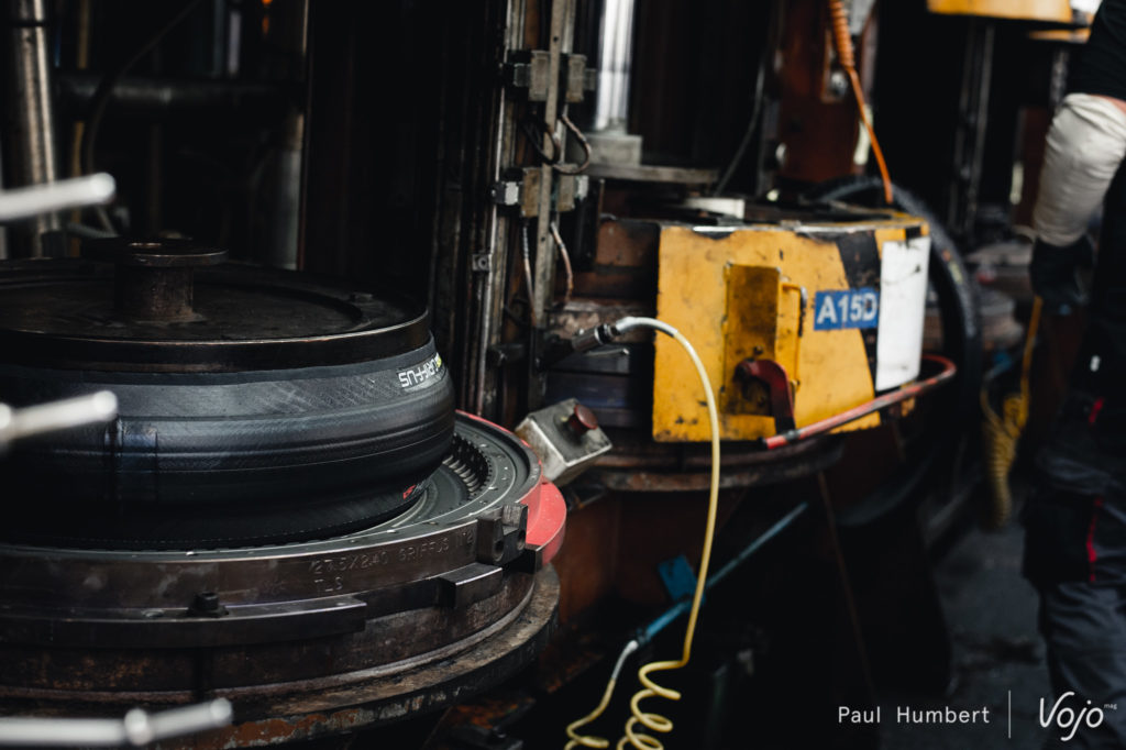 Notre pneu assemblé et collé est positionné dans le moule par des opérateurs. Le tout est installé dans un grand four qui n’est pas sans évoquer un moule à gaufre.