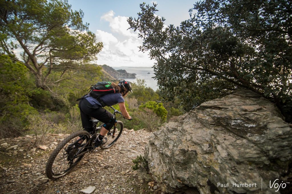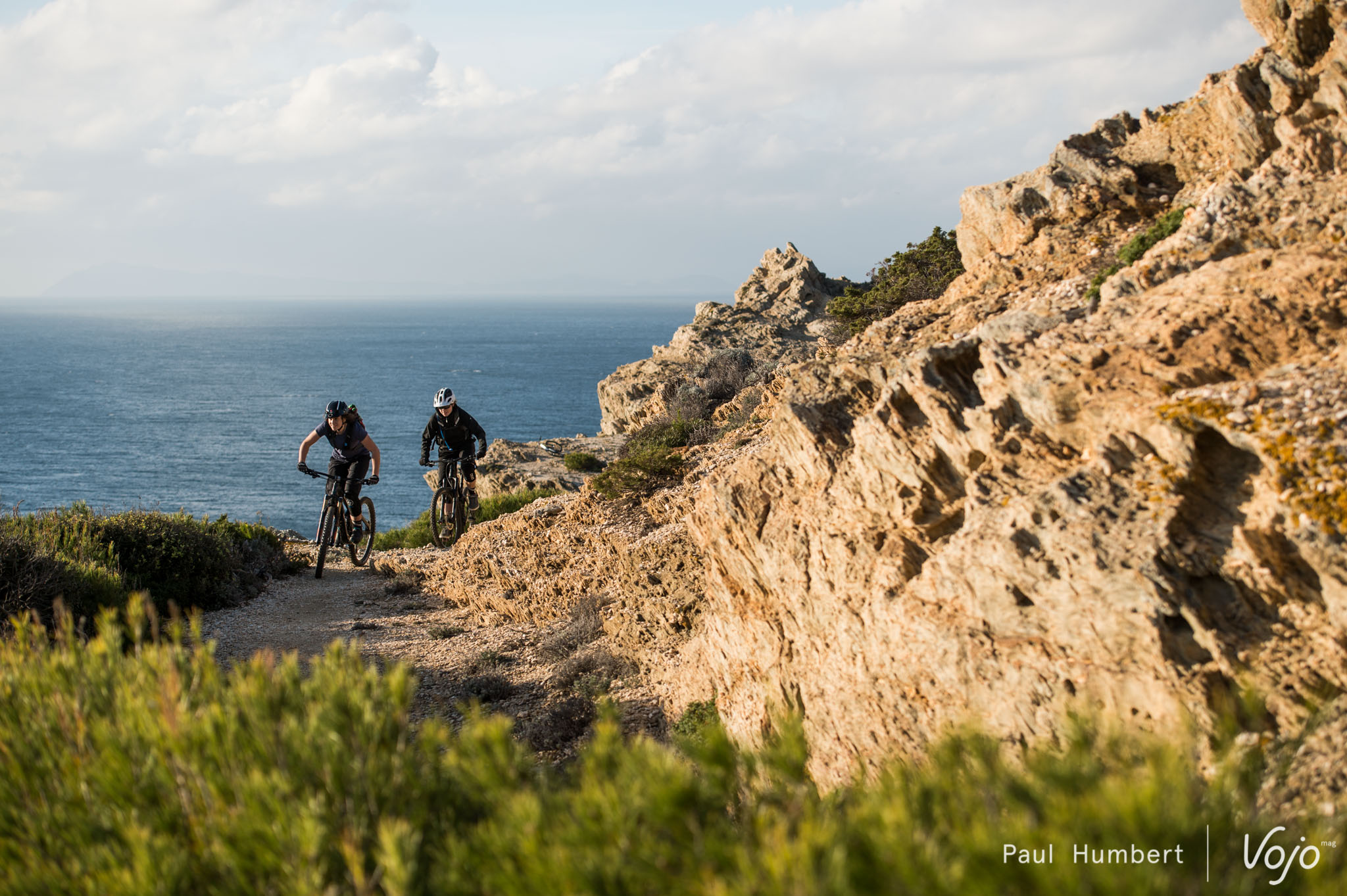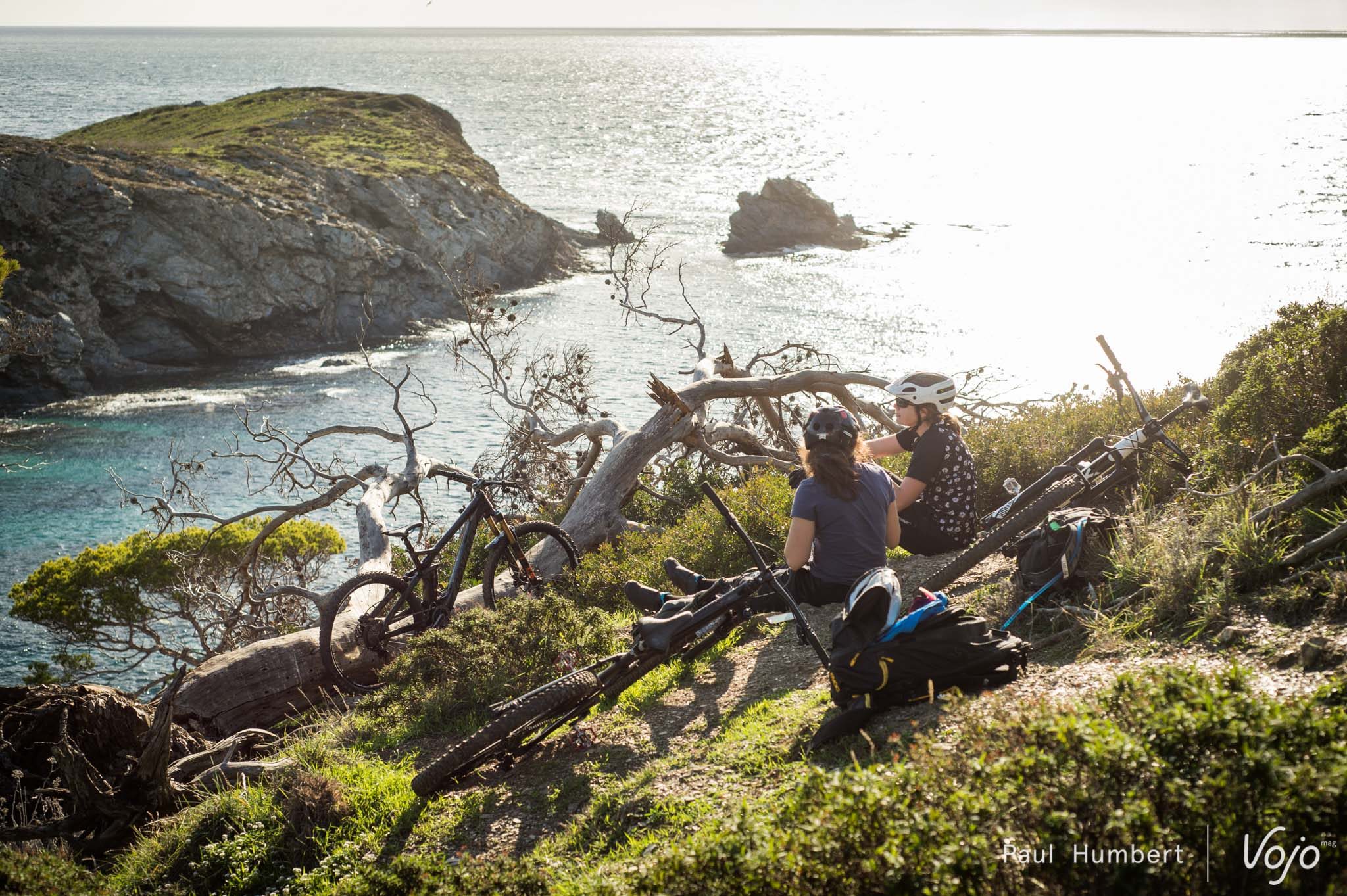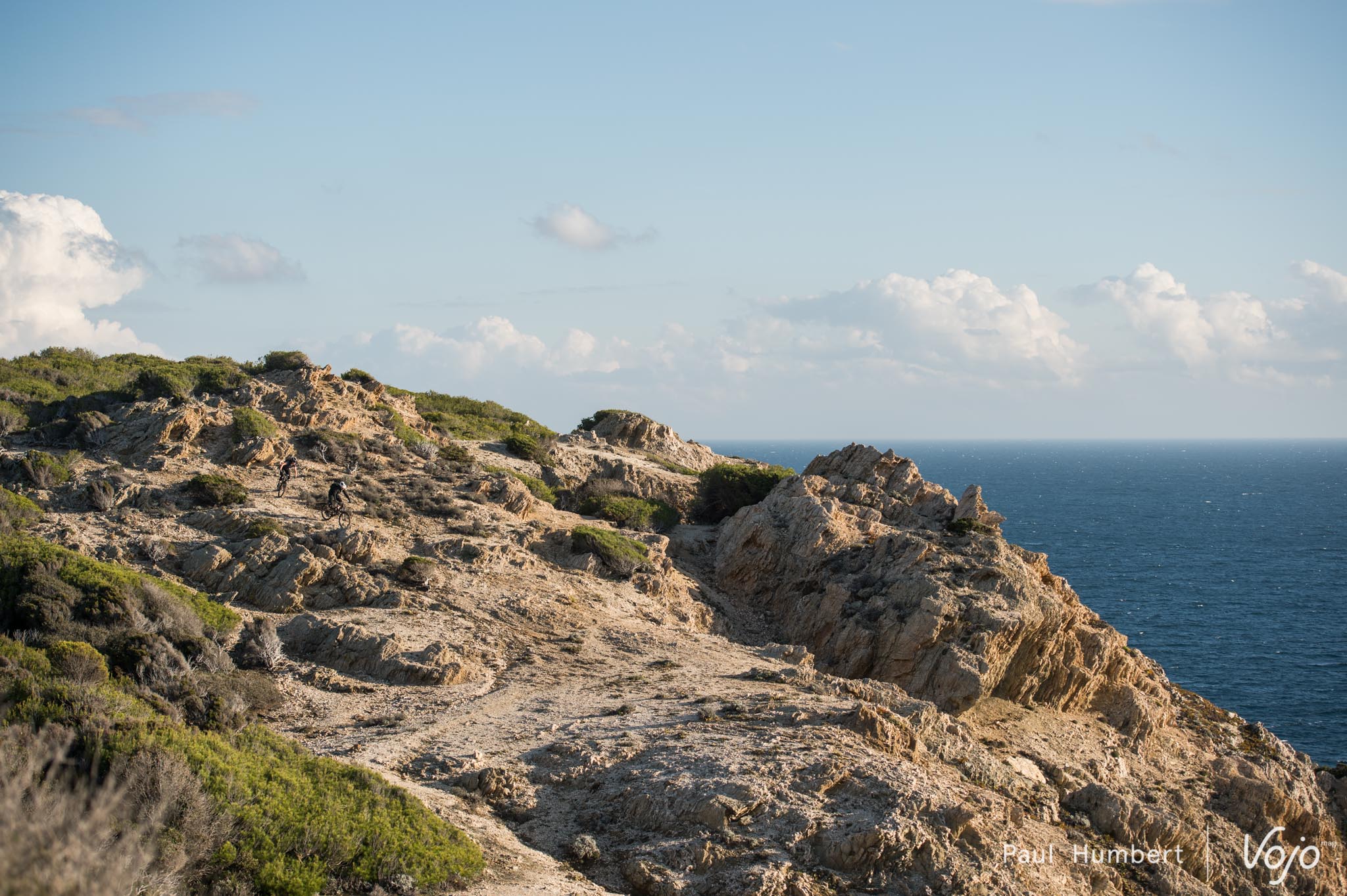 Le sentier est ludique, vallonné à souhait, alternant petites descentes trialisantes et montées rocailleuses et sinueuses. Il nous plonge tantôt dans le maquis, tantôt nous fait déboucher sur un point de vue bordant les falaises escarpées et le bleu sombre de la mer méditerranée en fin de journée.