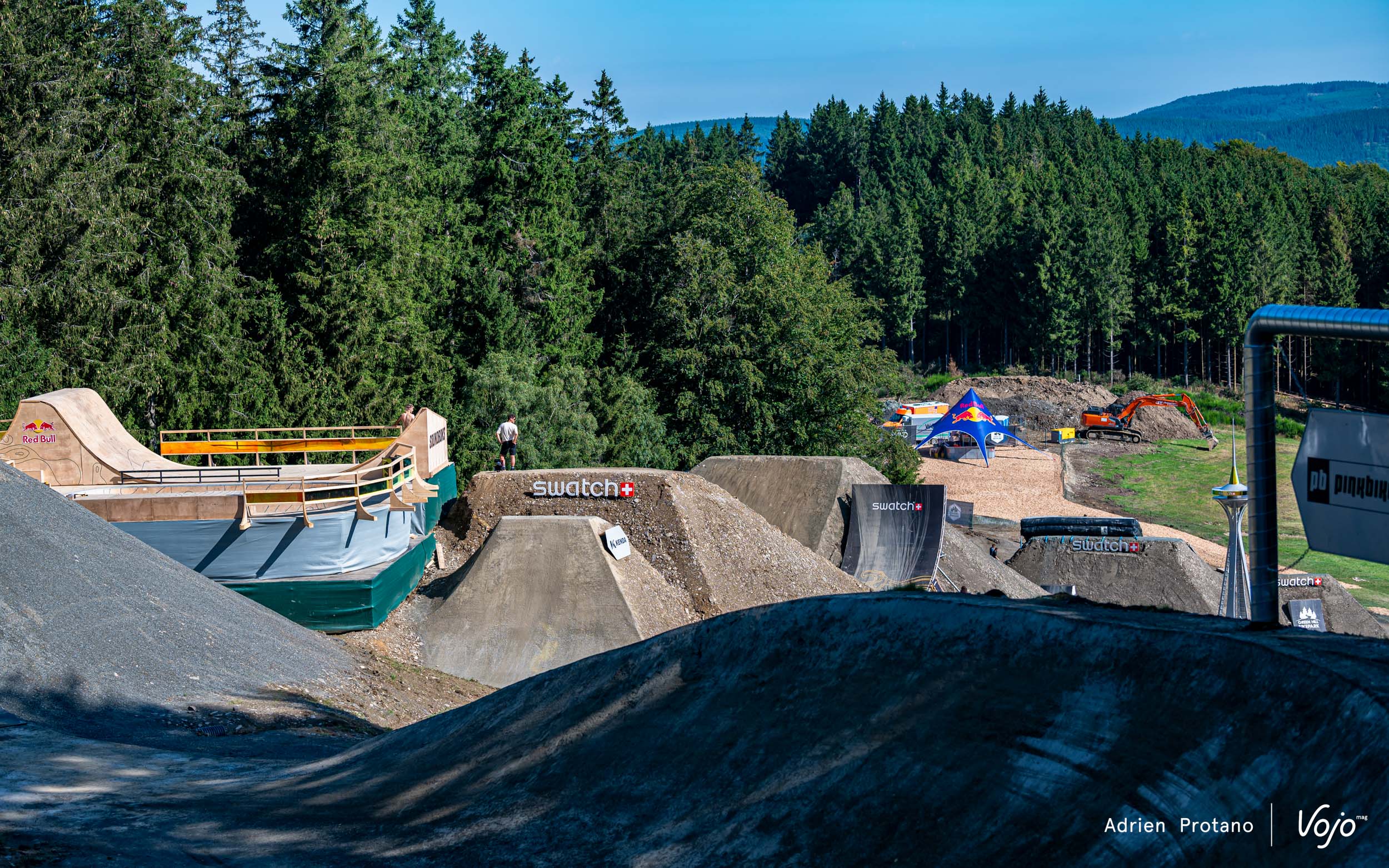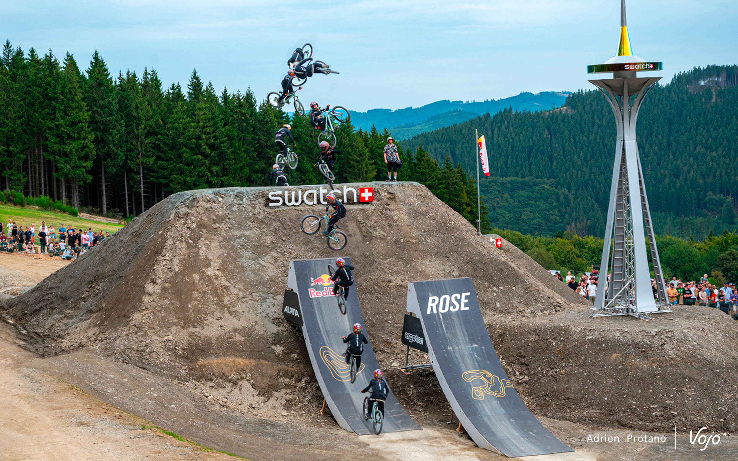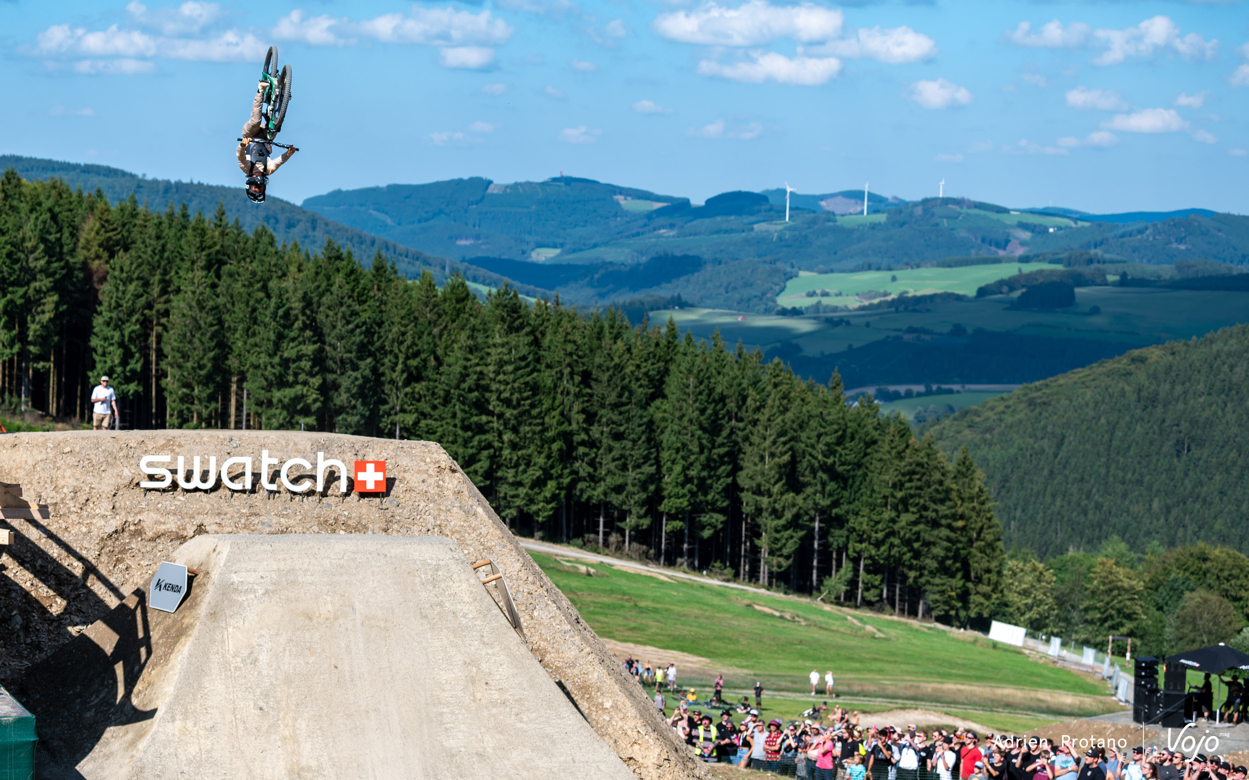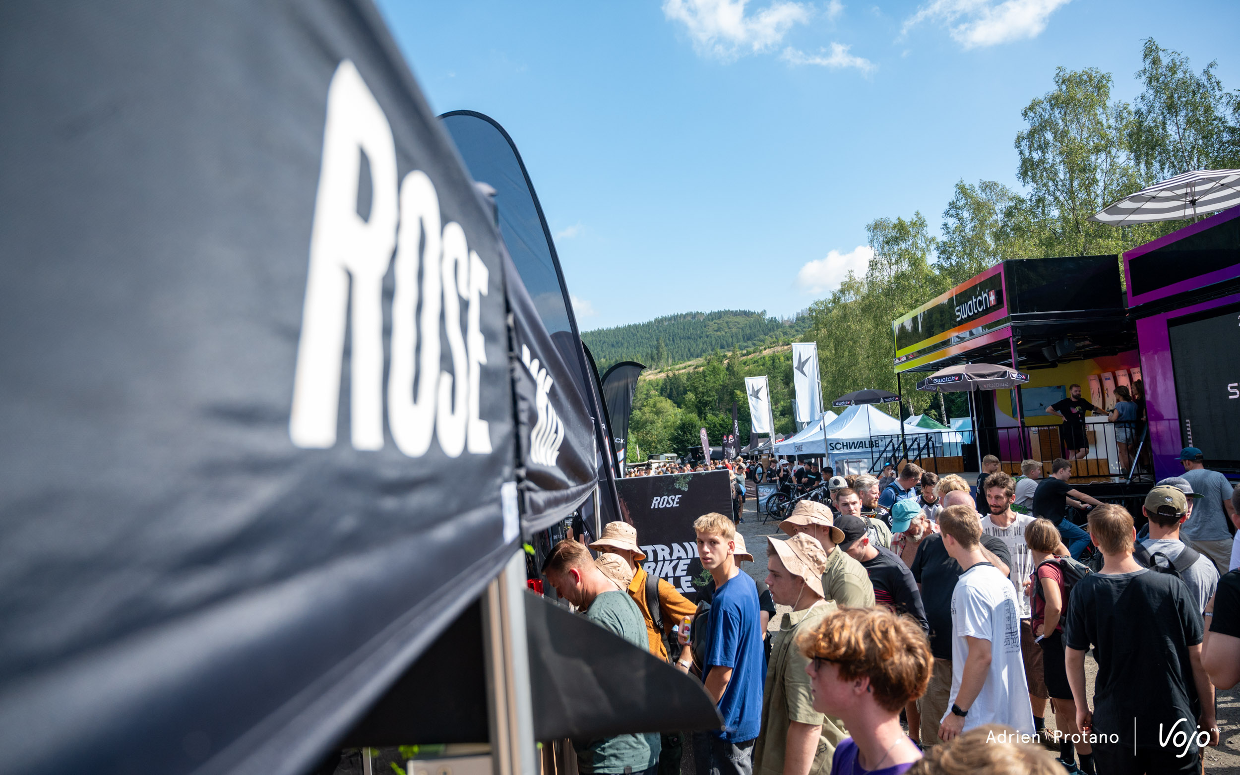 Bienvenu au Green Hill Bikepark pour le festival Beyond the Hill 2023 ! Situé à environ 3 heures de la frontière belge et à 2h de plus de Strasbourg, ce bikepark récemment ouvert à l’ouest de l’Allemagne a décidé de se lancer dans un projet fou : organiser un festival axé sur le VTT gravity tout en accueillant certains des meilleurs pilotes mondiaux de la discipline à l’occasion du Swatch Nines, une compétition de VTT slopestyle/freeride internationale. Anciennement connu sous le nom d’Audi Nines, le contest de VTT freeride/slopestyle revenait après une année de pause sous une nouvelle forme et dans un nouveau lieu : les « Swatch Nines » au sein du Greenhill bikepark. L’inspiration derrière cette compétition demeure toujours la même : « Nous avons fondé les Nines en opposition aux compétitions traditionnelles, comme un terrain de jeu où les athlètes peuvent se dépasser de la manière la plus sécurisée et la plus bienveillante possible. Ici, on ne met pas la pression pour faire de l’audience, mais on accompagne les riders dans le dépassement de leurs limites », explique Nico Zacek, fondateur des Swatch Nines. Afin d’exprimer leur talent et repousser les limites de leur discipline, les pilotes invités ont pu compter sur un parcours de qualité, tant visuellement que dans sa conception et sa construction. Mais à qui peut bien appartenir ce casque RedBull ? Difficile à deviner étant donné le nombre important de pilotes faisant partie de l’écurie de la marque présents ce week-end… On vous donne la réponse : celui-ci appartient à Harriet Burbidge-Smith. La pilote australienne était solidement entourée pour cette édition 2023 des Swatch Nines puisque 12 pilotes féminines ont répondu présent au total, dont notamment Casey Brown, Caroline Buchanan, Robin Goomes, Vinny Armstrong… Chez les hommes, la liste était d’autant plus longue, mais pas moins exclusive pour autant avec des pilotes de renom tels que Nicholi Rogatkin, Sam Pilgrim, Kaos Seagrave, Erik Fedko, Szymon Godziek, Tomas Lemoine… et bien d’autres encore. Échauffement terminé pour les pilotes, public en place, le show va pouvoir commencer ! À peine 16 ans et pourtant déjà à la première place du classement Freeride MTB World Tour, Patricia Druwen n’a pas attendu longtemps avant de démontrer au public son habileté sur ce parcours. La pilote allemande s’est imposée comme une pionnière, ouvrant la voie à la prochaine étape pour le VTT féminin avec un 540 et un Backflip Triple Barspin… Première pilote féminine de l’histoire à réaliser ces deux figures, Patricia Druwen repartira avec le prix de la meilleure figure slopestyle chez les femmes. Chez les hommes, les World’s First Tricks (comprenez là une figure réalisée pour la première fois dans le monde) s’enchaînent également ! Les frères Ruso, Elias et Daniel, ont notamment réussi un double backflip Tuck-No-Hander ainsi qu’un double backflip Can-Can. Tout récemment remis d’une blessure, Nicholi Rogatkin a ravi ses nombreux fans en exécutant l’une de ses figures signature dénommée « cash roll ». Avec ses 5 titres de championne du monde de four-cross, ses deux titres en contre-la-montre BMX et son maillot irisé en BMX en 2013, on ne présente plus Caroline Buchanan ! Si la pilote australienne est multiplement sacrée, elle fut également la première pilote féminine à réussir un frontflip en 2021, et un Superman Seat Grab Indian-Air lors de cette édition ! Je n’ai jamais vraiment fait un saut aussi grand qu’ici auparavant ! « Après être passée du BMX au VTT, j’avais très envie de me lancer dans le gros vélo, qui était complètement nouveau pour moi. Je n’ai jamais vraiment fait un saut aussi grand qu’ici auparavant, et réaliser un Superman Seat Grab Indian-Air devant une foule au Nines était incroyable », nous confiait la pilote Trek. Les pilotes prennent un malin plaisir à se motiver les uns les autres afin de se dépasser et le public en prend plein les rétines ! Le spectacle est impressionnant et même la météo est au beau fixe, après avoir été plus capricieuse durant le début de semaine et les premiers jours de reconnaissance du circuit par les athlètes. Robin Goomes lance le premier backflip de sa carrière, tout le monde retient son souffle… et la pilote néo-zélandaise retombe parfaitement sur ses deux roues. Dans la foulée, le pilote espagnol Bienvenido Aguado offre au public un spectaculaire Frontflip Cliffhanger sur le plus gros saut du parcours ! « Ce nouveau spot est incroyable, le parcours est super amusant, c’est un régal ! Voir les frères Ruso faire de gros tricks m’a motivé à faire ce trick et à le réussir devant ce public en feu », nous confiait juste après le pilote YT. Le parcours permettait également de marier les disciplines puisque 5 skateboarders triés sur le volet se sont joints à la fête, donnant lieu à de jolies scènes comme celle-ci entre Tomas Lemoine et Danny Léon ! Après une semaine à tenter de repousser leurs limites (et celles de la discipline par la même occasion), les pilotes se retrouvent finalement pour la soirée de gala et la remise des prix des meilleures figures, tant en freeride qu’en slopestyle, ainsi que pour désigner les pilotes masculin et féminin les plus méritants de la semaine. 10h pile, la foule investit rapidement le salon et ses différents stands dont notamment Santa Cruz, Rocky Mountain, Rose, Niner, Muc-Off, Schwalbe… Si la foule se presse aux alentours du stand de la marque allemande Rose, c’est en raison de l’arrivée d’un tout-nouveau modèle DH/Freeride dévoilé la veille. Baptisé Scrub, il se veut accessible et en aluminium avec une fourchette de prix allant de 3299€ à 4299€. Lukas Knopf roulait ce nouveau modèle sur le parcours des Swatch Nines. « Un monde de différence par rapport à l’ancien modèle (NDLR le Rose Soul Fire), qui com