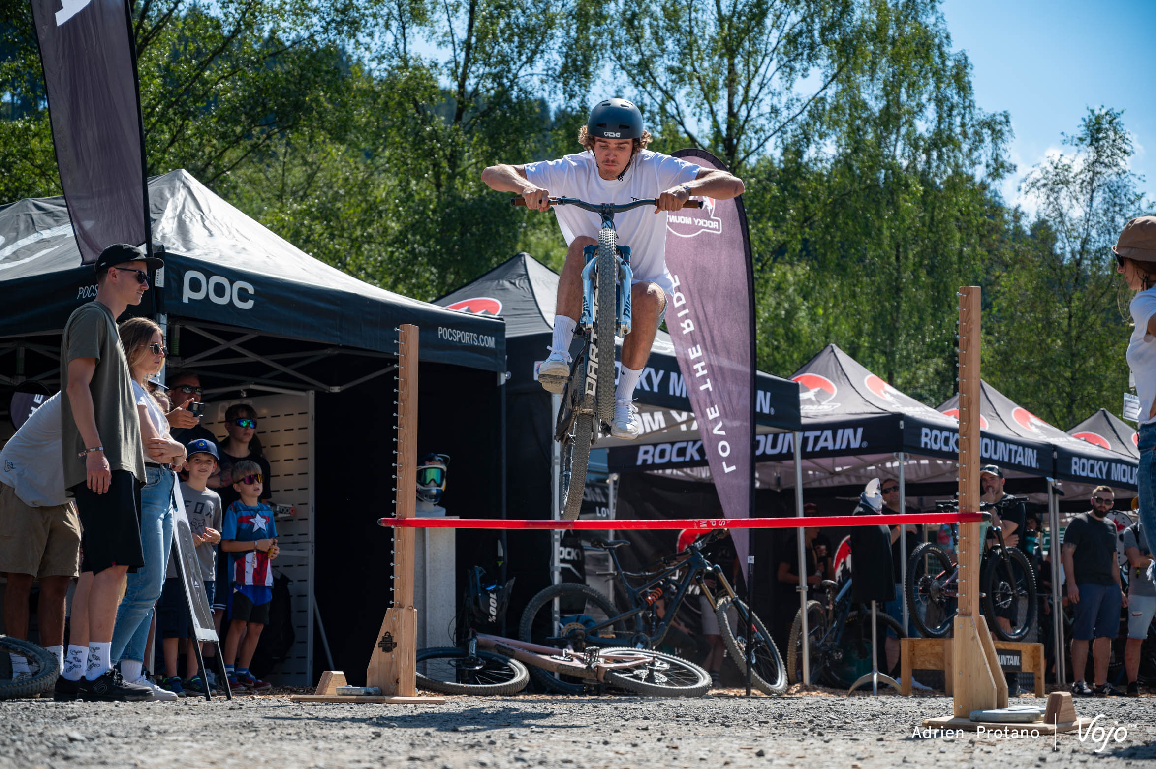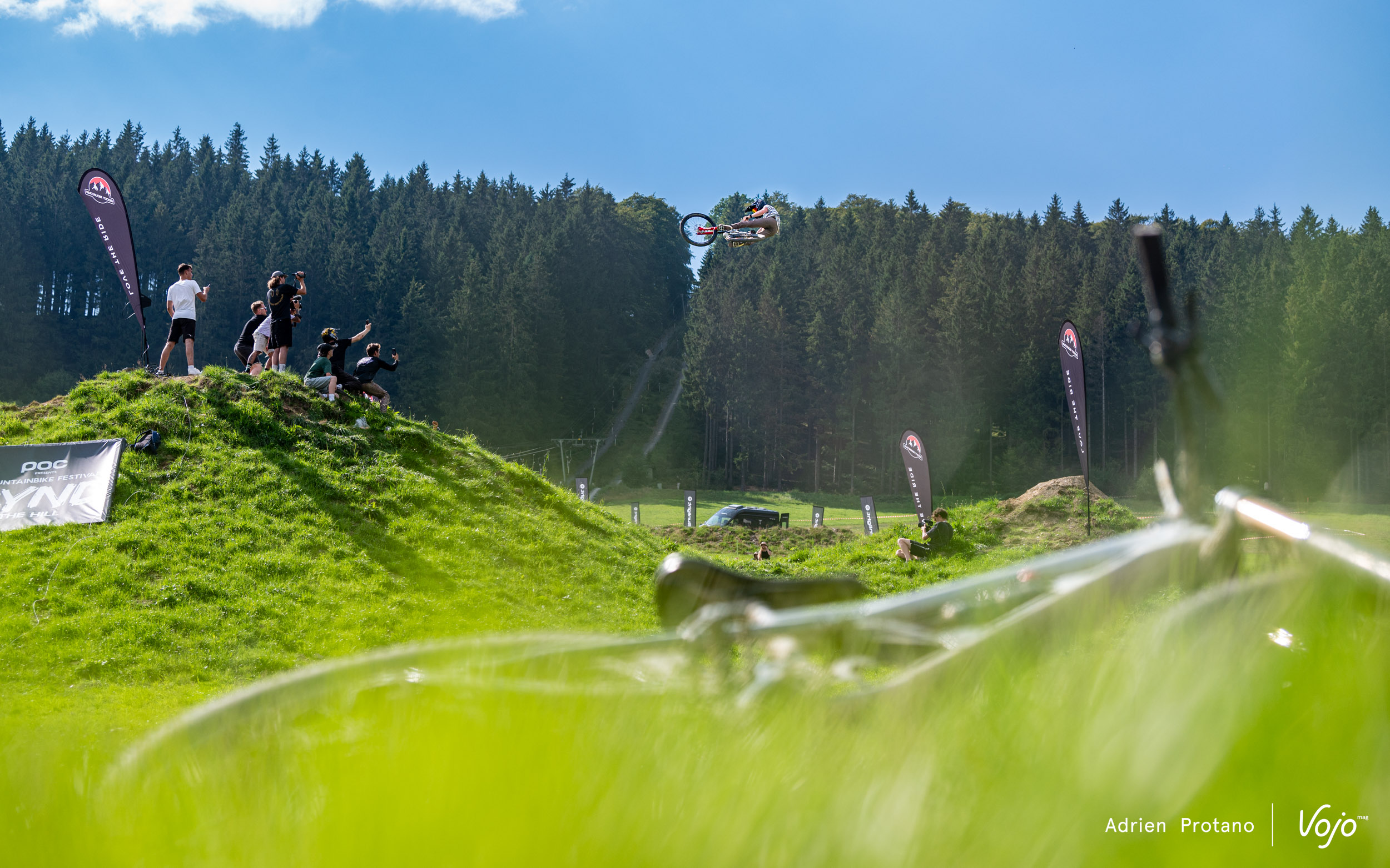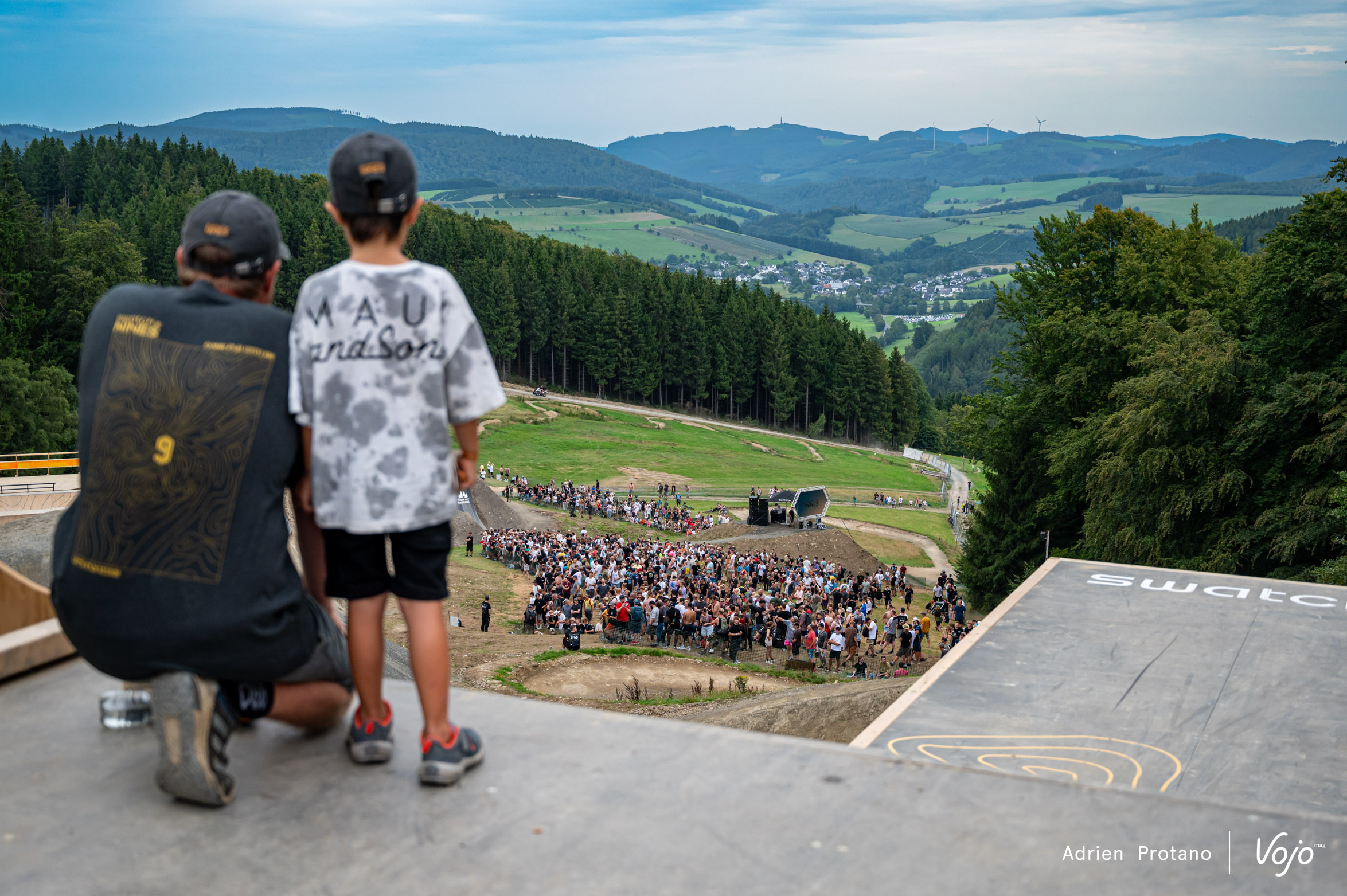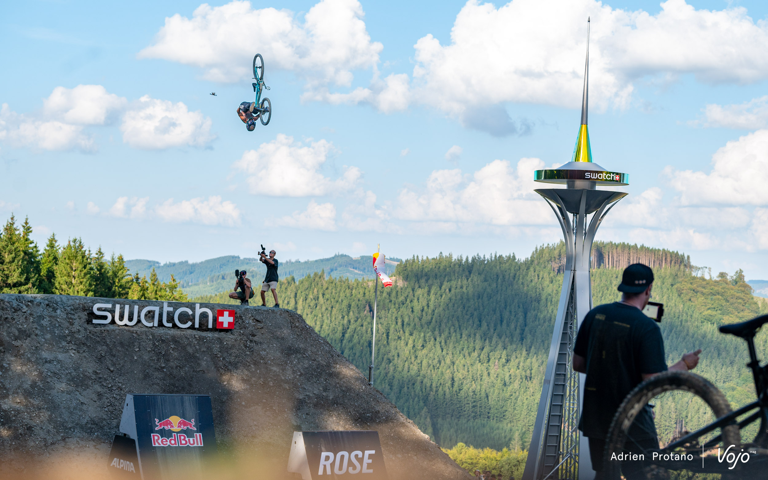 Bienvenu au Green Hill Bikepark pour le festival Beyond the Hill 2023 ! Situé à environ 3 heures de la frontière belge et à 2h de plus de Strasbourg, ce bikepark récemment ouvert à l’ouest de l’Allemagne a décidé de se lancer dans un projet fou : organiser un festival axé sur le VTT gravity tout en accueillant certains des meilleurs pilotes mondiaux de la discipline à l’occasion du Swatch Nines, une compétition de VTT slopestyle/freeride internationale. Anciennement connu sous le nom d’Audi Nines, le contest de VTT freeride/slopestyle revenait après une année de pause sous une nouvelle forme et dans un nouveau lieu : les « Swatch Nines » au sein du Greenhill bikepark. L’inspiration derrière cette compétition demeure toujours la même : « Nous avons fondé les Nines en opposition aux compétitions traditionnelles, comme un terrain de jeu où les athlètes peuvent se dépasser de la manière la plus sécurisée et la plus bienveillante possible. Ici, on ne met pas la pression pour faire de l’audience, mais on accompagne les riders dans le dépassement de leurs limites », explique Nico Zacek, fondateur des Swatch Nines. Afin d’exprimer leur talent et repousser les limites de leur discipline, les pilotes invités ont pu compter sur un parcours de qualité, tant visuellement que dans sa conception et sa construction. Mais à qui peut bien appartenir ce casque RedBull ? Difficile à deviner étant donné le nombre important de pilotes faisant partie de l’écurie de la marque présents ce week-end… On vous donne la réponse : celui-ci appartient à Harriet Burbidge-Smith. La pilote australienne était solidement entourée pour cette édition 2023 des Swatch Nines puisque 12 pilotes féminines ont répondu présent au total, dont notamment Casey Brown, Caroline Buchanan, Robin Goomes, Vinny Armstrong… Chez les hommes, la liste était d’autant plus longue, mais pas moins exclusive pour autant avec des pilotes de renom tels que Nicholi Rogatkin, Sam Pilgrim, Kaos Seagrave, Erik Fedko, Szymon Godziek, Tomas Lemoine… et bien d’autres encore. Échauffement terminé pour les pilotes, public en place, le show va pouvoir commencer ! À peine 16 ans et pourtant déjà à la première place du classement Freeride MTB World Tour, Patricia Druwen n’a pas attendu longtemps avant de démontrer au public son habileté sur ce parcours. La pilote allemande s’est imposée comme une pionnière, ouvrant la voie à la prochaine étape pour le VTT féminin avec un 540 et un Backflip Triple Barspin… Première pilote féminine de l’histoire à réaliser ces deux figures, Patricia Druwen repartira avec le prix de la meilleure figure slopestyle chez les femmes. Chez les hommes, les World’s First Tricks (comprenez là une figure réalisée pour la première fois dans le monde) s’enchaînent également ! Les frères Ruso, Elias et Daniel, ont notamment réussi un double backflip Tuck-No-Hander ainsi qu’un double backflip Can-Can. Tout récemment remis d’une blessure, Nicholi Rogatkin a ravi ses nombreux fans en exécutant l’une de ses figures signature dénommée « cash roll ». Avec ses 5 titres de championne du monde de four-cross, ses deux titres en contre-la-montre BMX et son maillot irisé en BMX en 2013, on ne présente plus Caroline Buchanan ! Si la pilote australienne est multiplement sacrée, elle fut également la première pilote féminine à réussir un frontflip en 2021, et un Superman Seat Grab Indian-Air lors de cette édition ! Je n’ai jamais vraiment fait un saut aussi grand qu’ici auparavant ! « Après être passée du BMX au VTT, j’avais très envie de me lancer dans le gros vélo, qui était complètement nouveau pour moi. Je n’ai jamais vraiment fait un saut aussi grand qu’ici auparavant, et réaliser un Superman Seat Grab Indian-Air devant une foule au Nines était incroyable », nous confiait la pilote Trek. Les pilotes prennent un malin plaisir à se motiver les uns les autres afin de se dépasser et le public en prend plein les rétines ! Le spectacle est impressionnant et même la météo est au beau fixe, après avoir été plus capricieuse durant le début de semaine et les premiers jours de reconnaissance du circuit par les athlètes. Robin Goomes lance le premier backflip de sa carrière, tout le monde retient son souffle… et la pilote néo-zélandaise retombe parfaitement sur ses deux roues. Dans la foulée, le pilote espagnol Bienvenido Aguado offre au public un spectaculaire Frontflip Cliffhanger sur le plus gros saut du parcours ! « Ce nouveau spot est incroyable, le parcours est super amusant, c’est un régal ! Voir les frères Ruso faire de gros tricks m’a motivé à faire ce trick et à le réussir devant ce public en feu », nous confiait juste après le pilote YT. Le parcours permettait également de marier les disciplines puisque 5 skateboarders triés sur le volet se sont joints à la fête, donnant lieu à de jolies scènes comme celle-ci entre Tomas Lemoine et Danny Léon ! Après une semaine à tenter de repousser leurs limites (et celles de la discipline par la même occasion), les pilotes se retrouvent finalement pour la soirée de gala et la remise des prix des meilleures figures, tant en freeride qu’en slopestyle, ainsi que pour désigner les pilotes masculin et féminin les plus méritants de la semaine. 10h pile, la foule investit rapidement le salon et ses différents stands dont notamment Santa Cruz, Rocky Mountain, Rose, Niner, Muc-Off, Schwalbe… Si la foule se presse aux alentours du stand de la marque allemande Rose, c’est en raison de l’arrivée d’un tout-nouveau modèle DH/Freeride dévoilé la veille. Baptisé Scrub, il se veut accessible et en aluminium avec une fourchette de prix allant de 3299€ à 4299€. Lukas Knopf roulait ce nouveau modèle sur le parcours des Swatch Nines. « Un monde de différence par rapport à l’ancien modèle (NDLR le Rose Soul Fire), qui com
