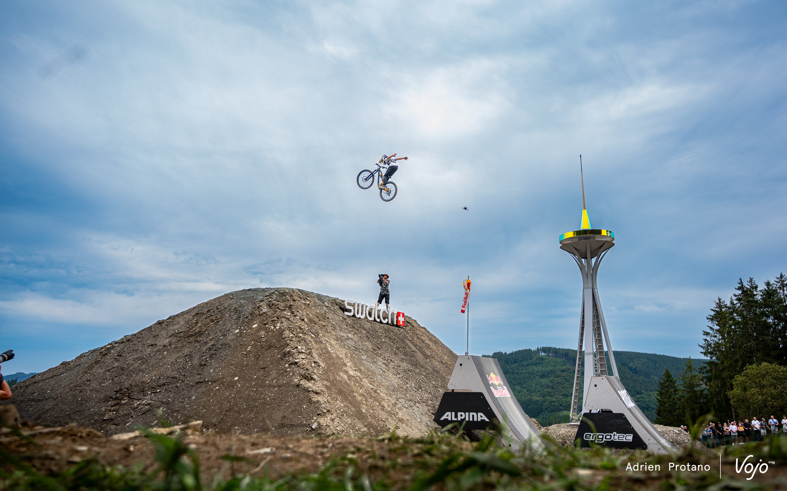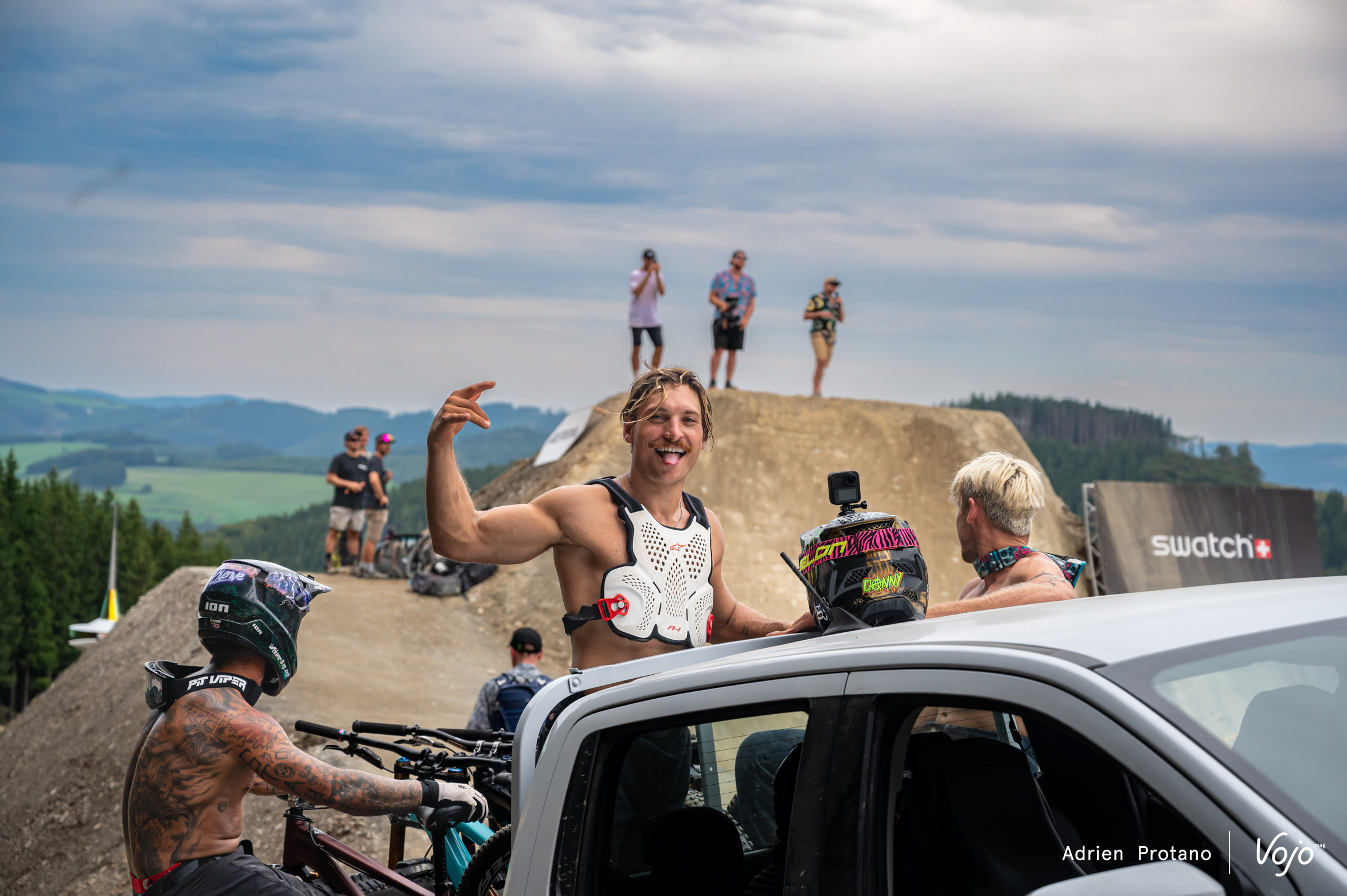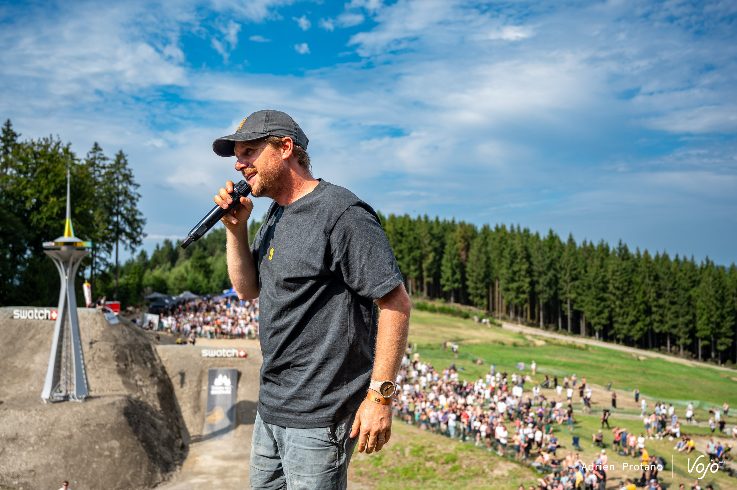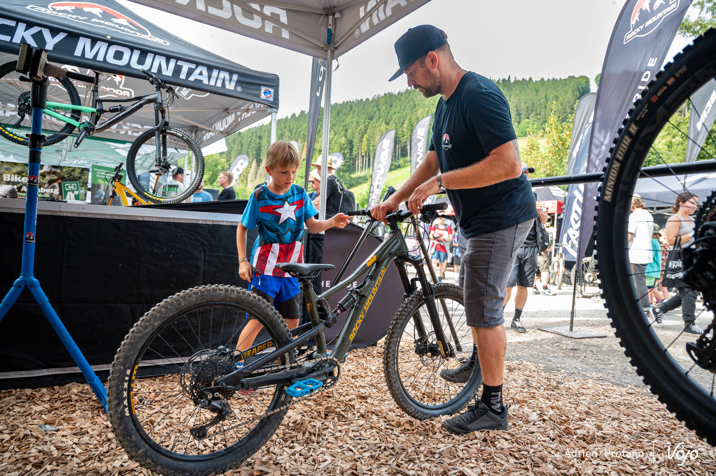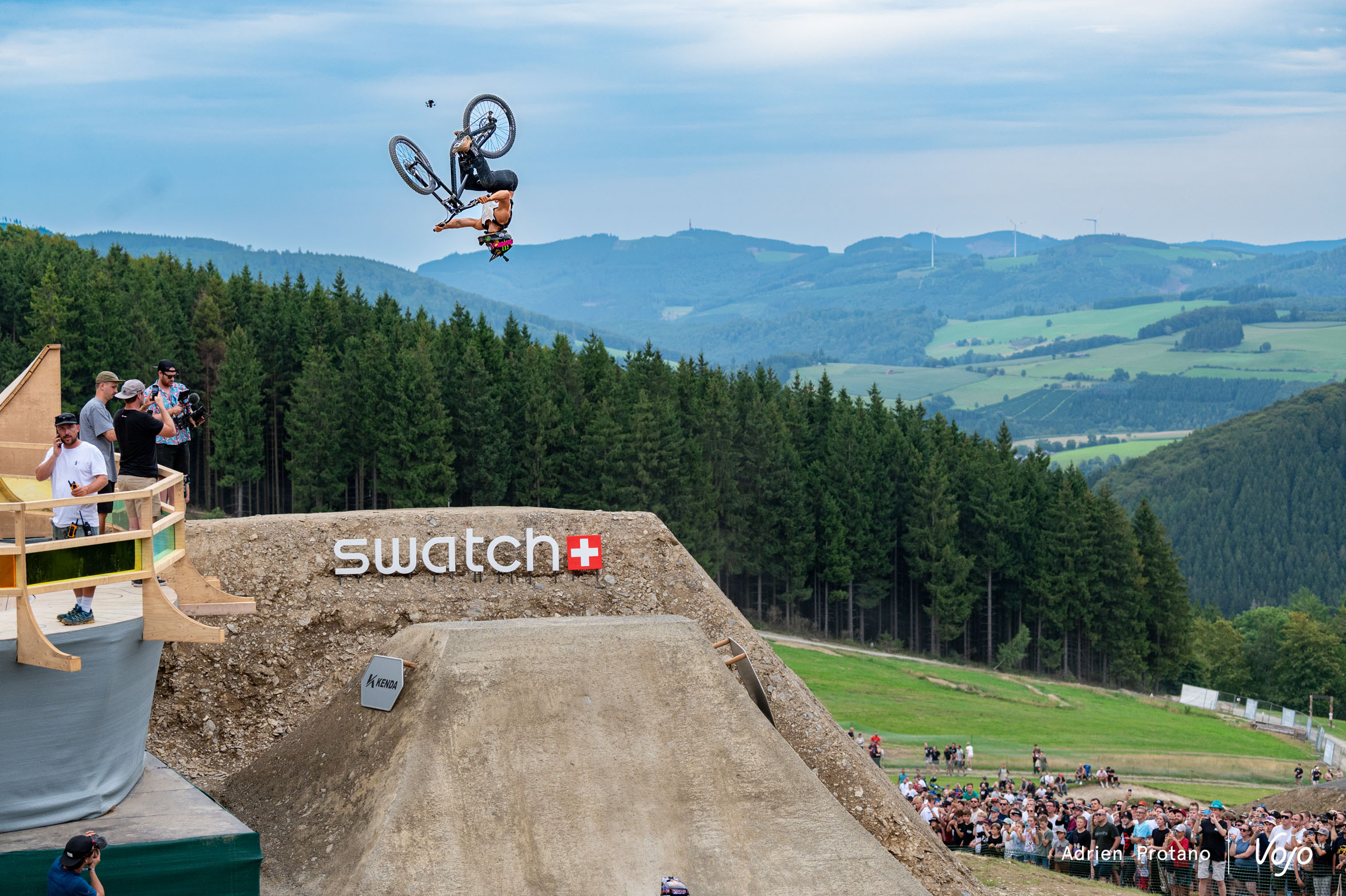 Bienvenu au Green Hill Bikepark pour le festival Beyond the Hill 2023 ! Situé à environ 3 heures de la frontière belge et à 2h de plus de Strasbourg, ce bikepark récemment ouvert à l’ouest de l’Allemagne a décidé de se lancer dans un projet fou : organiser un festival axé sur le VTT gravity tout en accueillant certains des meilleurs pilotes mondiaux de la discipline à l’occasion du Swatch Nines, une compétition de VTT slopestyle/freeride internationale. Anciennement connu sous le nom d’Audi Nines, le contest de VTT freeride/slopestyle revenait après une année de pause sous une nouvelle forme et dans un nouveau lieu : les « Swatch Nines » au sein du Greenhill bikepark. L’inspiration derrière cette compétition demeure toujours la même : « Nous avons fondé les Nines en opposition aux compétitions traditionnelles, comme un terrain de jeu où les athlètes peuvent se dépasser de la manière la plus sécurisée et la plus bienveillante possible. Ici, on ne met pas la pression pour faire de l’audience, mais on accompagne les riders dans le dépassement de leurs limites », explique Nico Zacek, fondateur des Swatch Nines. Afin d’exprimer leur talent et repousser les limites de leur discipline, les pilotes invités ont pu compter sur un parcours de qualité, tant visuellement que dans sa conception et sa construction. Mais à qui peut bien appartenir ce casque RedBull ? Difficile à deviner étant donné le nombre important de pilotes faisant partie de l’écurie de la marque présents ce week-end… On vous donne la réponse : celui-ci appartient à Harriet Burbidge-Smith. La pilote australienne était solidement entourée pour cette édition 2023 des Swatch Nines puisque 12 pilotes féminines ont répondu présent au total, dont notamment Casey Brown, Caroline Buchanan, Robin Goomes, Vinny Armstrong… Chez les hommes, la liste était d’autant plus longue, mais pas moins exclusive pour autant avec des pilotes de renom tels que Nicholi Rogatkin, Sam Pilgrim, Kaos Seagrave, Erik Fedko, Szymon Godziek, Tomas Lemoine… et bien d’autres encore. Échauffement terminé pour les pilotes, public en place, le show va pouvoir commencer ! À peine 16 ans et pourtant déjà à la première place du classement Freeride MTB World Tour, Patricia Druwen n’a pas attendu longtemps avant de démontrer au public son habileté sur ce parcours. La pilote allemande s’est imposée comme une pionnière, ouvrant la voie à la prochaine étape pour le VTT féminin avec un 540 et un Backflip Triple Barspin… Première pilote féminine de l’histoire à réaliser ces deux figures, Patricia Druwen repartira avec le prix de la meilleure figure slopestyle chez les femmes. Chez les hommes, les World’s First Tricks (comprenez là une figure réalisée pour la première fois dans le monde) s’enchaînent également ! Les frères Ruso, Elias et Daniel, ont notamment réussi un double backflip Tuck-No-Hander ainsi qu’un double backflip Can-Can. Tout récemment remis d’une blessure, Nicholi Rogatkin a ravi ses nombreux fans en exécutant l’une de ses figures signature dénommée « cash roll ». Avec ses 5 titres de championne du monde de four-cross, ses deux titres en contre-la-montre BMX et son maillot irisé en BMX en 2013, on ne présente plus Caroline Buchanan ! Si la pilote australienne est multiplement sacrée, elle fut également la première pilote féminine à réussir un frontflip en 2021, et un Superman Seat Grab Indian-Air lors de cette édition ! Je n’ai jamais vraiment fait un saut aussi grand qu’ici auparavant ! « Après être passée du BMX au VTT, j’avais très envie de me lancer dans le gros vélo, qui était complètement nouveau pour moi. Je n’ai jamais vraiment fait un saut aussi grand qu’ici auparavant, et réaliser un Superman Seat Grab Indian-Air devant une foule au Nines était incroyable », nous confiait la pilote Trek. Les pilotes prennent un malin plaisir à se motiver les uns les autres afin de se dépasser et le public en prend plein les rétines ! Le spectacle est impressionnant et même la météo est au beau fixe, après avoir été plus capricieuse durant le début de semaine et les premiers jours de reconnaissance du circuit par les athlètes. Robin Goomes lance le premier backflip de sa carrière, tout le monde retient son souffle… et la pilote néo-zélandaise retombe parfaitement sur ses deux roues. Dans la foulée, le pilote espagnol Bienvenido Aguado offre au public un spectaculaire Frontflip Cliffhanger sur le plus gros saut du parcours ! « Ce nouveau spot est incroyable, le parcours est super amusant, c’est un régal ! Voir les frères Ruso faire de gros tricks m’a motivé à faire ce trick et à le réussir devant ce public en feu », nous confiait juste après le pilote YT. Le parcours permettait également de marier les disciplines puisque 5 skateboarders triés sur le volet se sont joints à la fête, donnant lieu à de jolies scènes comme celle-ci entre Tomas Lemoine et Danny Léon ! Après une semaine à tenter de repousser leurs limites (et celles de la discipline par la même occasion), les pilotes se retrouvent finalement pour la soirée de gala et la remise des prix des meilleures figures, tant en freeride qu’en slopestyle, ainsi que pour désigner les pilotes masculin et féminin les plus méritants de la semaine. 10h pile, la foule investit rapidement le salon et ses différents stands dont notamment Santa Cruz, Rocky Mountain, Rose, Niner, Muc-Off, Schwalbe… Si la foule se presse aux alentours du stand de la marque allemande Rose, c’est en raison de l’arrivée d’un tout-nouveau modèle DH/Freeride dévoilé la veille. Baptisé Scrub, il se veut accessible et en aluminium avec une fourchette de prix allant de 3299€ à 4299€. Lukas Knopf roulait ce nouveau modèle sur le parcours des Swatch Nines. « Un monde de différence par rapport à l’ancien modèle (NDLR le Rose Soul Fire), qui com