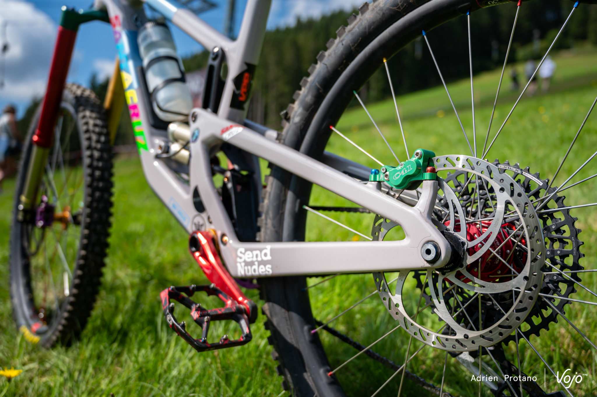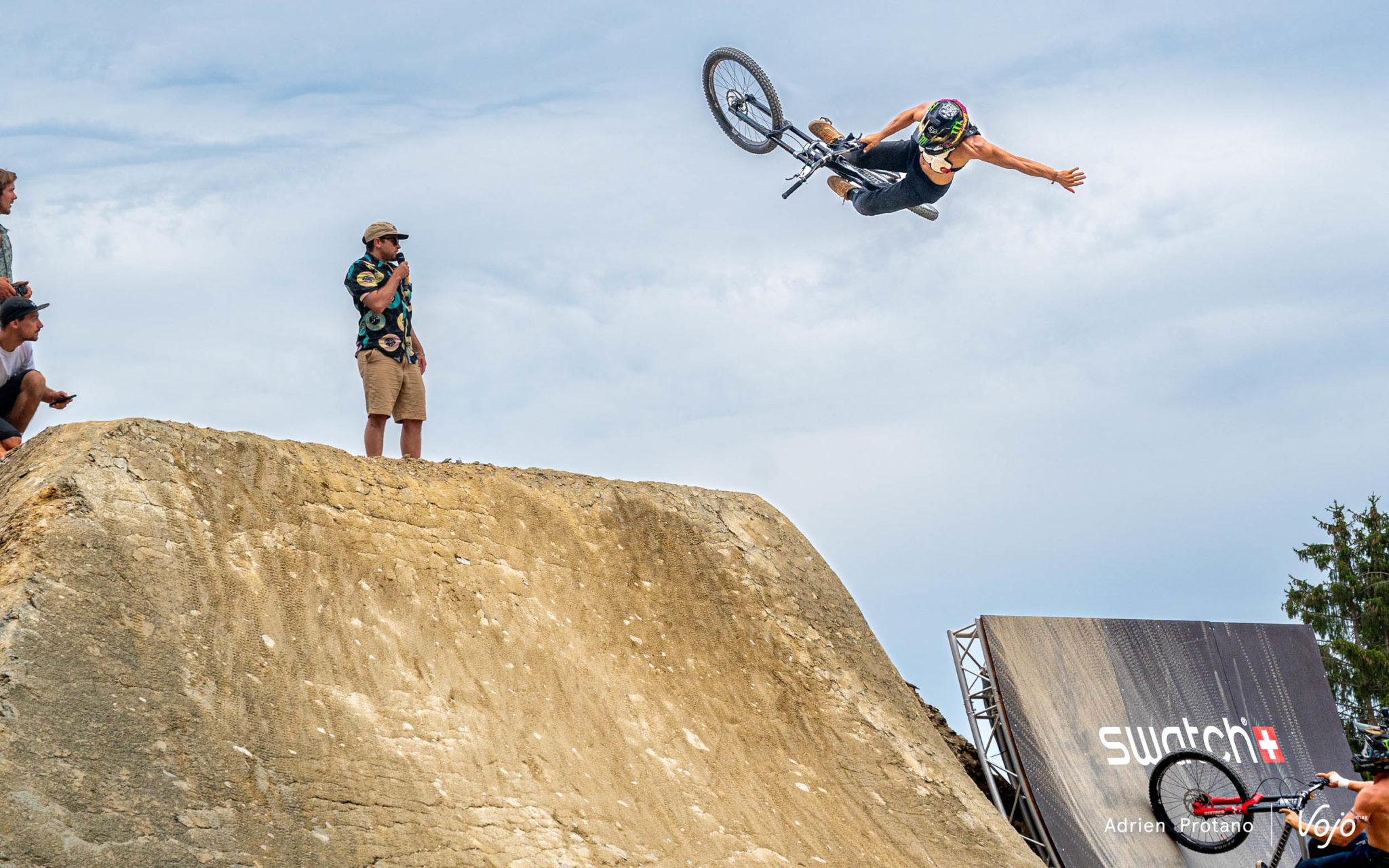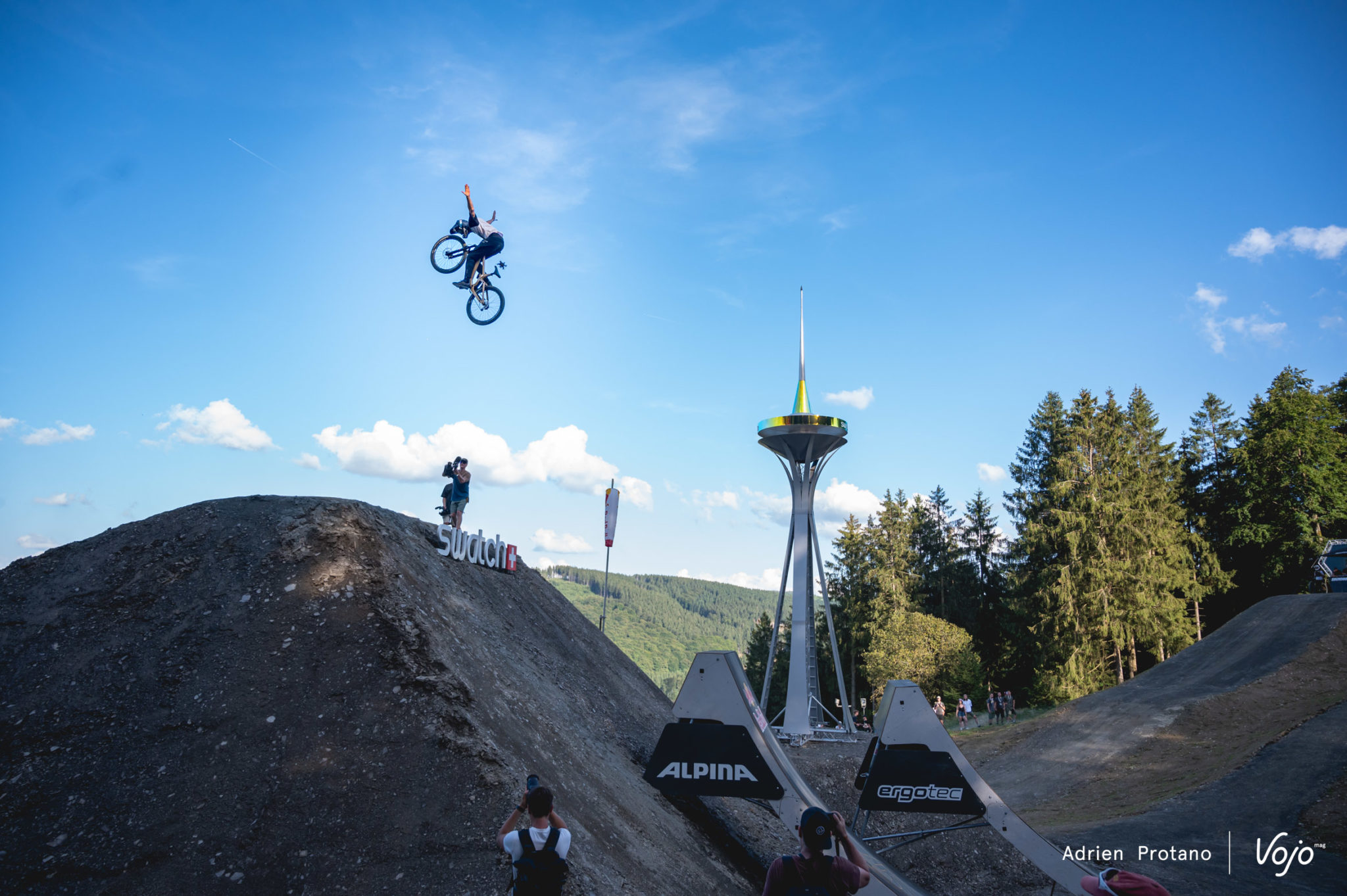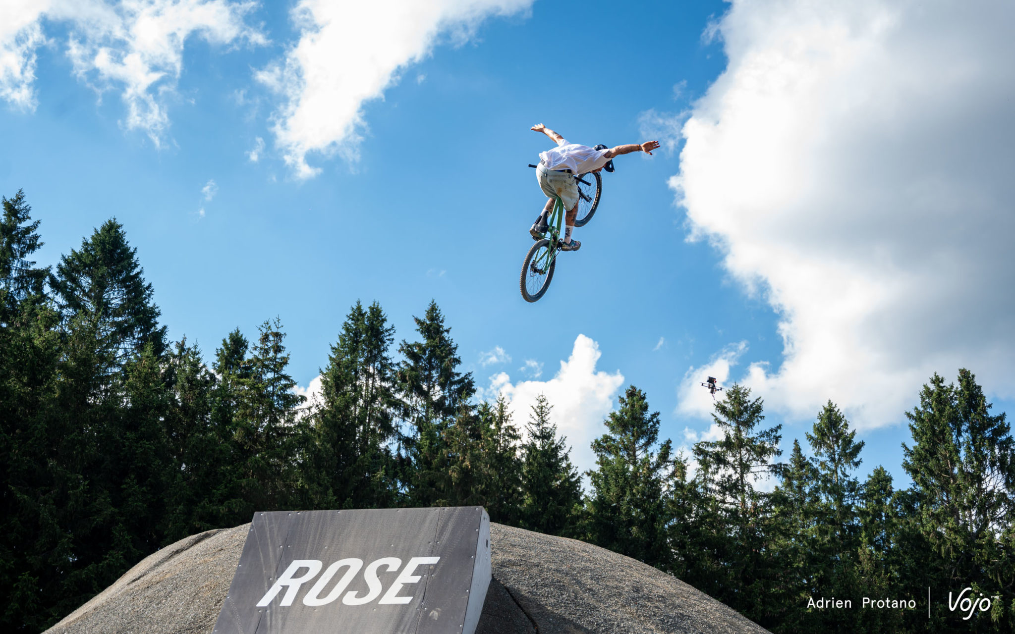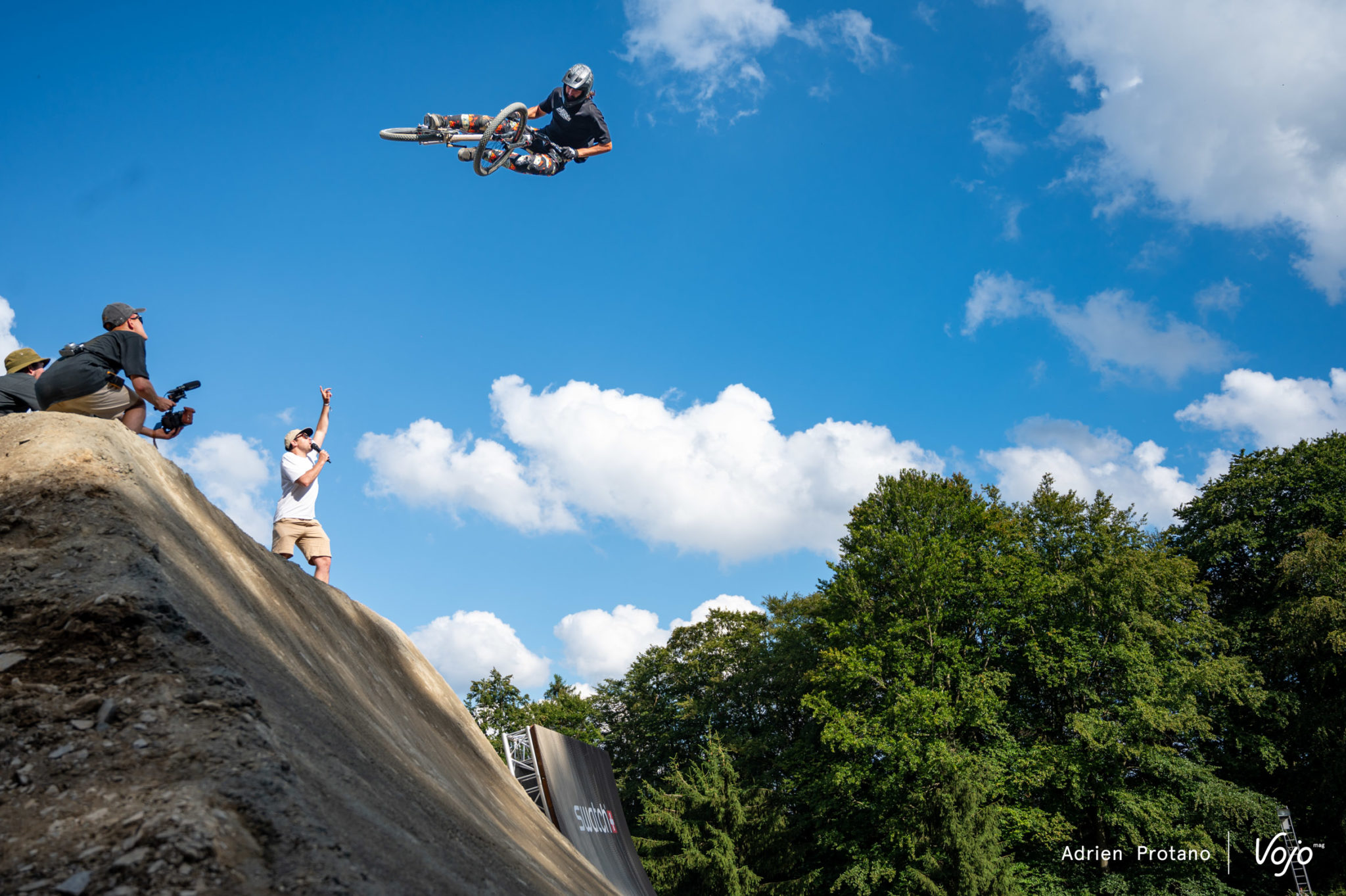 Bienvenu au Green Hill Bikepark pour le festival Beyond the Hill 2023 ! Situé à environ 3 heures de la frontière belge et à 2h de plus de Strasbourg, ce bikepark récemment ouvert à l’ouest de l’Allemagne a décidé de se lancer dans un projet fou : organiser un festival axé sur le VTT gravity tout en accueillant certains des meilleurs pilotes mondiaux de la discipline à l’occasion du Swatch Nines, une compétition de VTT slopestyle/freeride internationale. Anciennement connu sous le nom d’Audi Nines, le contest de VTT freeride/slopestyle revenait après une année de pause sous une nouvelle forme et dans un nouveau lieu : les « Swatch Nines » au sein du Greenhill bikepark. L’inspiration derrière cette compétition demeure toujours la même : « Nous avons fondé les Nines en opposition aux compétitions traditionnelles, comme un terrain de jeu où les athlètes peuvent se dépasser de la manière la plus sécurisée et la plus bienveillante possible. Ici, on ne met pas la pression pour faire de l’audience, mais on accompagne les riders dans le dépassement de leurs limites », explique Nico Zacek, fondateur des Swatch Nines. Afin d’exprimer leur talent et repousser les limites de leur discipline, les pilotes invités ont pu compter sur un parcours de qualité, tant visuellement que dans sa conception et sa construction. Mais à qui peut bien appartenir ce casque RedBull ? Difficile à deviner étant donné le nombre important de pilotes faisant partie de l’écurie de la marque présents ce week-end… On vous donne la réponse : celui-ci appartient à Harriet Burbidge-Smith. La pilote australienne était solidement entourée pour cette édition 2023 des Swatch Nines puisque 12 pilotes féminines ont répondu présent au total, dont notamment Casey Brown, Caroline Buchanan, Robin Goomes, Vinny Armstrong… Chez les hommes, la liste était d’autant plus longue, mais pas moins exclusive pour autant avec des pilotes de renom tels que Nicholi Rogatkin, Sam Pilgrim, Kaos Seagrave, Erik Fedko, Szymon Godziek, Tomas Lemoine… et bien d’autres encore. Échauffement terminé pour les pilotes, public en place, le show va pouvoir commencer ! À peine 16 ans et pourtant déjà à la première place du classement Freeride MTB World Tour, Patricia Druwen n’a pas attendu longtemps avant de démontrer au public son habileté sur ce parcours. La pilote allemande s’est imposée comme une pionnière, ouvrant la voie à la prochaine étape pour le VTT féminin avec un 540 et un Backflip Triple Barspin… Première pilote féminine de l’histoire à réaliser ces deux figures, Patricia Druwen repartira avec le prix de la meilleure figure slopestyle chez les femmes. Chez les hommes, les World’s First Tricks (comprenez là une figure réalisée pour la première fois dans le monde) s’enchaînent également ! Les frères Ruso, Elias et Daniel, ont notamment réussi un double backflip Tuck-No-Hander ainsi qu’un double backflip Can-Can. Tout récemment remis d’une blessure, Nicholi Rogatkin a ravi ses nombreux fans en exécutant l’une de ses figures signature dénommée « cash roll ». Avec ses 5 titres de championne du monde de four-cross, ses deux titres en contre-la-montre BMX et son maillot irisé en BMX en 2013, on ne présente plus Caroline Buchanan ! Si la pilote australienne est multiplement sacrée, elle fut également la première pilote féminine à réussir un frontflip en 2021, et un Superman Seat Grab Indian-Air lors de cette édition ! Je n’ai jamais vraiment fait un saut aussi grand qu’ici auparavant ! « Après être passée du BMX au VTT, j’avais très envie de me lancer dans le gros vélo, qui était complètement nouveau pour moi. Je n’ai jamais vraiment fait un saut aussi grand qu’ici auparavant, et réaliser un Superman Seat Grab Indian-Air devant une foule au Nines était incroyable », nous confiait la pilote Trek. Les pilotes prennent un malin plaisir à se motiver les uns les autres afin de se dépasser et le public en prend plein les rétines ! Le spectacle est impressionnant et même la météo est au beau fixe, après avoir été plus capricieuse durant le début de semaine et les premiers jours de reconnaissance du circuit par les athlètes. Robin Goomes lance le premier backflip de sa carrière, tout le monde retient son souffle… et la pilote néo-zélandaise retombe parfaitement sur ses deux roues. Dans la foulée, le pilote espagnol Bienvenido Aguado offre au public un spectaculaire Frontflip Cliffhanger sur le plus gros saut du parcours ! « Ce nouveau spot est incroyable, le parcours est super amusant, c’est un régal ! Voir les frères Ruso faire de gros tricks m’a motivé à faire ce trick et à le réussir devant ce public en feu », nous confiait juste après le pilote YT. Le parcours permettait également de marier les disciplines puisque 5 skateboarders triés sur le volet se sont joints à la fête, donnant lieu à de jolies scènes comme celle-ci entre Tomas Lemoine et Danny Léon ! Après une semaine à tenter de repousser leurs limites (et celles de la discipline par la même occasion), les pilotes se retrouvent finalement pour la soirée de gala et la remise des prix des meilleures figures, tant en freeride qu’en slopestyle, ainsi que pour désigner les pilotes masculin et féminin les plus méritants de la semaine. 10h pile, la foule investit rapidement le salon et ses différents stands dont notamment Santa Cruz, Rocky Mountain, Rose, Niner, Muc-Off, Schwalbe… Si la foule se presse aux alentours du stand de la marque allemande Rose, c’est en raison de l’arrivée d’un tout-nouveau modèle DH/Freeride dévoilé la veille. Baptisé Scrub, il se veut accessible et en aluminium avec une fourchette de prix allant de 3299€ à 4299€. Lukas Knopf roulait ce nouveau modèle sur le parcours des Swatch Nines. « Un monde de différence par rapport à l’ancien modèle (NDLR le Rose Soul Fire), qui com
