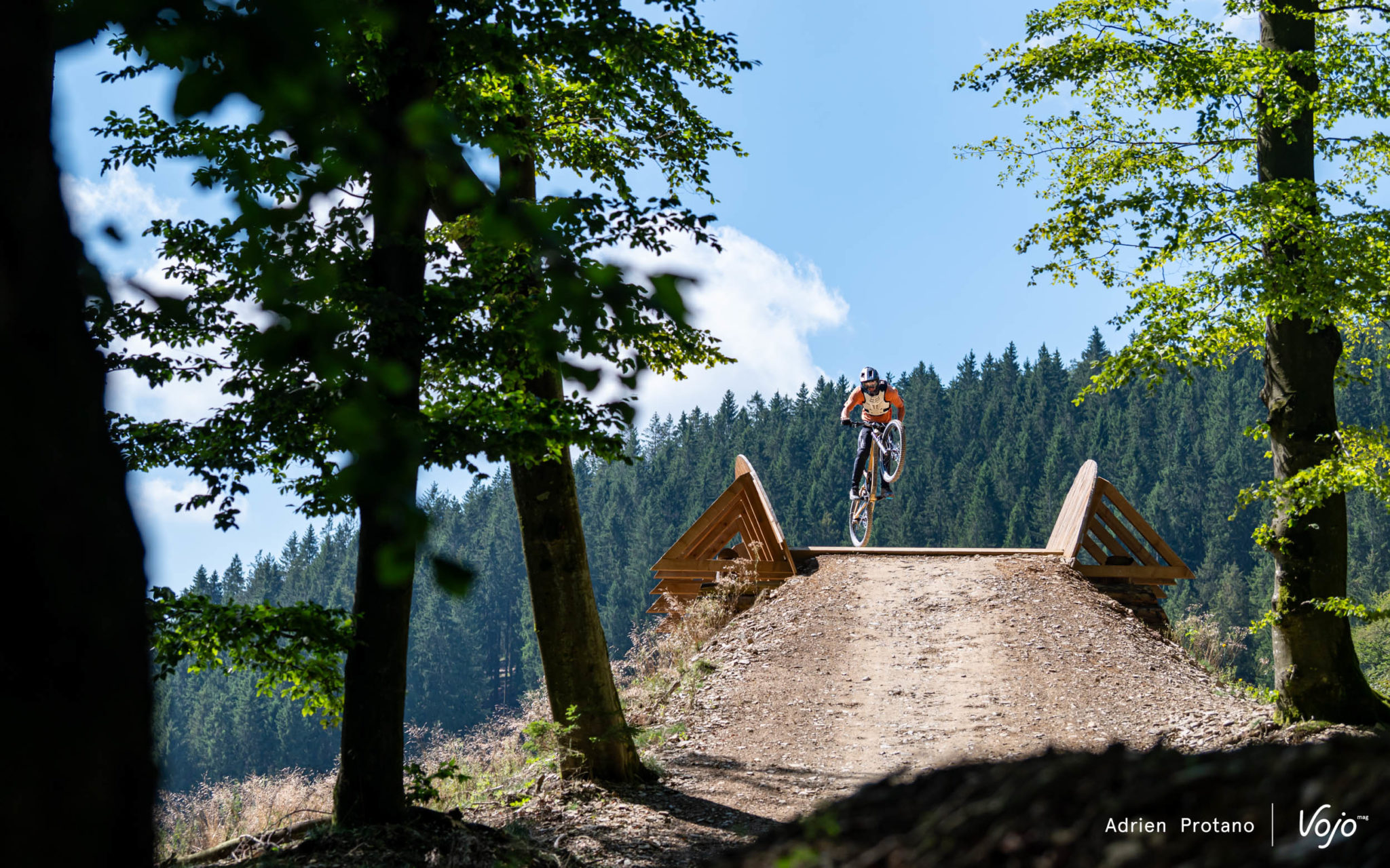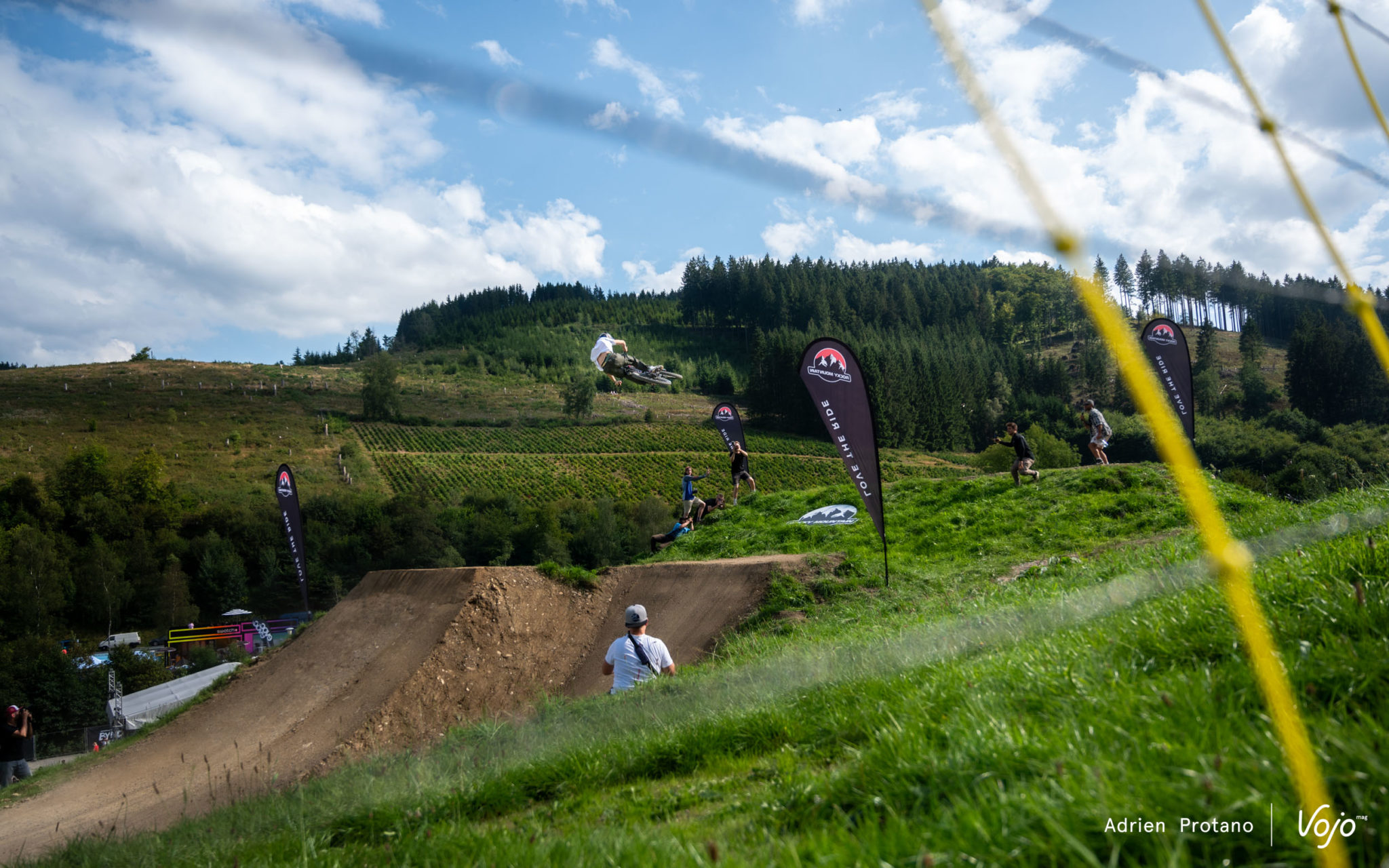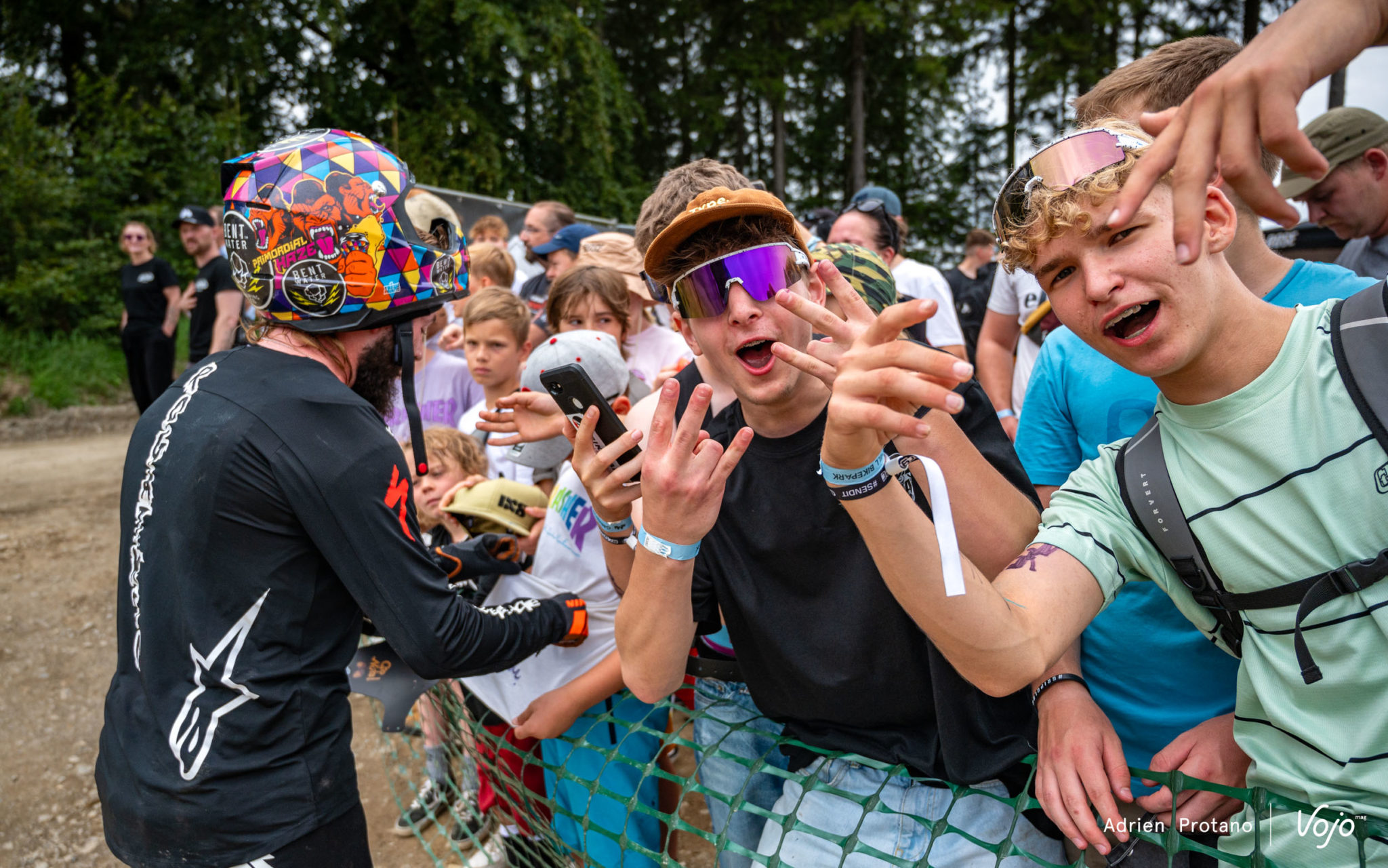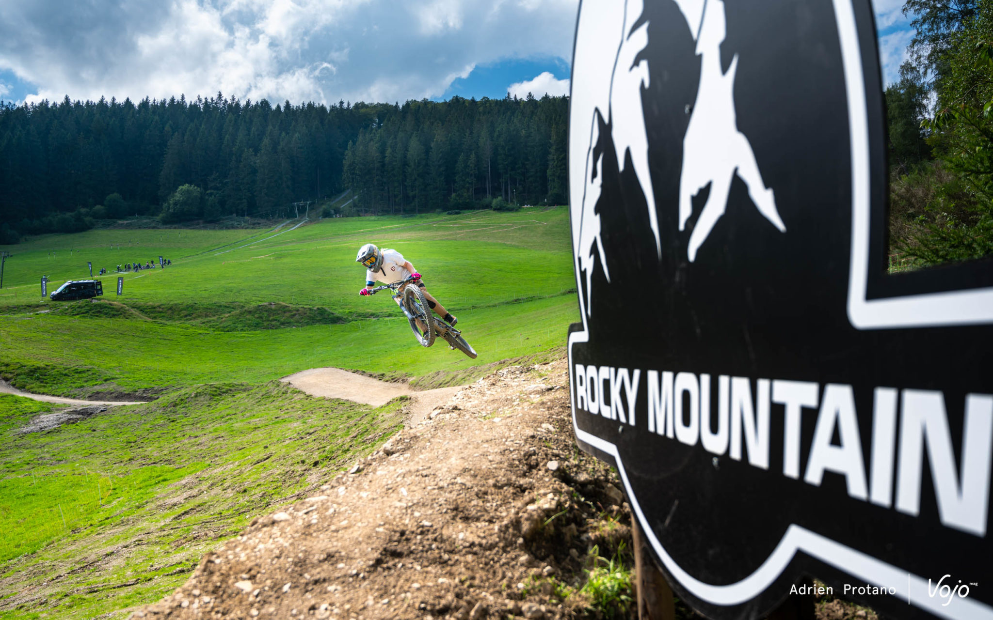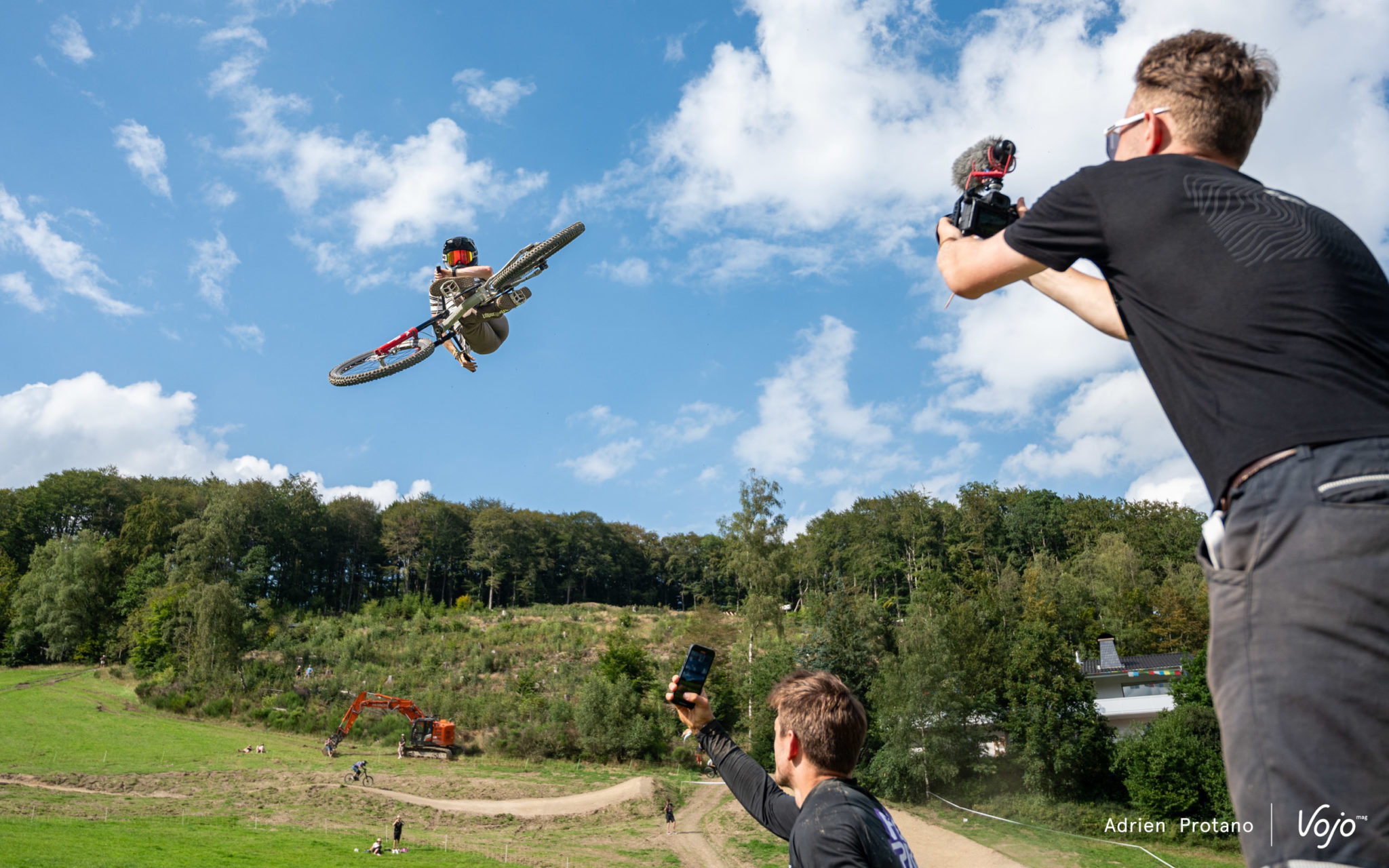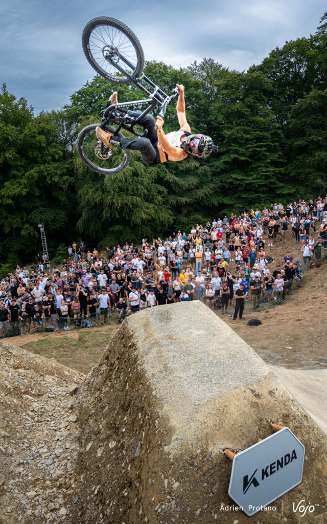 Bienvenu au Green Hill Bikepark pour le festival Beyond the Hill 2023 ! Situé à environ 3 heures de la frontière belge et à 2h de plus de Strasbourg, ce bikepark récemment ouvert à l’ouest de l’Allemagne a décidé de se lancer dans un projet fou : organiser un festival axé sur le VTT gravity tout en accueillant certains des meilleurs pilotes mondiaux de la discipline à l’occasion du Swatch Nines, une compétition de VTT slopestyle/freeride internationale. Anciennement connu sous le nom d’Audi Nines, le contest de VTT freeride/slopestyle revenait après une année de pause sous une nouvelle forme et dans un nouveau lieu : les « Swatch Nines » au sein du Greenhill bikepark. L’inspiration derrière cette compétition demeure toujours la même : « Nous avons fondé les Nines en opposition aux compétitions traditionnelles, comme un terrain de jeu où les athlètes peuvent se dépasser de la manière la plus sécurisée et la plus bienveillante possible. Ici, on ne met pas la pression pour faire de l’audience, mais on accompagne les riders dans le dépassement de leurs limites », explique Nico Zacek, fondateur des Swatch Nines. Afin d’exprimer leur talent et repousser les limites de leur discipline, les pilotes invités ont pu compter sur un parcours de qualité, tant visuellement que dans sa conception et sa construction. Mais à qui peut bien appartenir ce casque RedBull ? Difficile à deviner étant donné le nombre important de pilotes faisant partie de l’écurie de la marque présents ce week-end… On vous donne la réponse : celui-ci appartient à Harriet Burbidge-Smith. La pilote australienne était solidement entourée pour cette édition 2023 des Swatch Nines puisque 12 pilotes féminines ont répondu présent au total, dont notamment Casey Brown, Caroline Buchanan, Robin Goomes, Vinny Armstrong… Chez les hommes, la liste était d’autant plus longue, mais pas moins exclusive pour autant avec des pilotes de renom tels que Nicholi Rogatkin, Sam Pilgrim, Kaos Seagrave, Erik Fedko, Szymon Godziek, Tomas Lemoine… et bien d’autres encore. Échauffement terminé pour les pilotes, public en place, le show va pouvoir commencer ! À peine 16 ans et pourtant déjà à la première place du classement Freeride MTB World Tour, Patricia Druwen n’a pas attendu longtemps avant de démontrer au public son habileté sur ce parcours. La pilote allemande s’est imposée comme une pionnière, ouvrant la voie à la prochaine étape pour le VTT féminin avec un 540 et un Backflip Triple Barspin… Première pilote féminine de l’histoire à réaliser ces deux figures, Patricia Druwen repartira avec le prix de la meilleure figure slopestyle chez les femmes. Chez les hommes, les World’s First Tricks (comprenez là une figure réalisée pour la première fois dans le monde) s’enchaînent également ! Les frères Ruso, Elias et Daniel, ont notamment réussi un double backflip Tuck-No-Hander ainsi qu’un double backflip Can-Can. Tout récemment remis d’une blessure, Nicholi Rogatkin a ravi ses nombreux fans en exécutant l’une de ses figures signature dénommée « cash roll ». Avec ses 5 titres de championne du monde de four-cross, ses deux titres en contre-la-montre BMX et son maillot irisé en BMX en 2013, on ne présente plus Caroline Buchanan ! Si la pilote australienne est multiplement sacrée, elle fut également la première pilote féminine à réussir un frontflip en 2021, et un Superman Seat Grab Indian-Air lors de cette édition ! Je n’ai jamais vraiment fait un saut aussi grand qu’ici auparavant ! « Après être passée du BMX au VTT, j’avais très envie de me lancer dans le gros vélo, qui était complètement nouveau pour moi. Je n’ai jamais vraiment fait un saut aussi grand qu’ici auparavant, et réaliser un Superman Seat Grab Indian-Air devant une foule au Nines était incroyable », nous confiait la pilote Trek. Les pilotes prennent un malin plaisir à se motiver les uns les autres afin de se dépasser et le public en prend plein les rétines ! Le spectacle est impressionnant et même la météo est au beau fixe, après avoir été plus capricieuse durant le début de semaine et les premiers jours de reconnaissance du circuit par les athlètes. Robin Goomes lance le premier backflip de sa carrière, tout le monde retient son souffle… et la pilote néo-zélandaise retombe parfaitement sur ses deux roues. Dans la foulée, le pilote espagnol Bienvenido Aguado offre au public un spectaculaire Frontflip Cliffhanger sur le plus gros saut du parcours ! « Ce nouveau spot est incroyable, le parcours est super amusant, c’est un régal ! Voir les frères Ruso faire de gros tricks m’a motivé à faire ce trick et à le réussir devant ce public en feu », nous confiait juste après le pilote YT. Le parcours permettait également de marier les disciplines puisque 5 skateboarders triés sur le volet se sont joints à la fête, donnant lieu à de jolies scènes comme celle-ci entre Tomas Lemoine et Danny Léon ! Après une semaine à tenter de repousser leurs limites (et celles de la discipline par la même occasion), les pilotes se retrouvent finalement pour la soirée de gala et la remise des prix des meilleures figures, tant en freeride qu’en slopestyle, ainsi que pour désigner les pilotes masculin et féminin les plus méritants de la semaine. 10h pile, la foule investit rapidement le salon et ses différents stands dont notamment Santa Cruz, Rocky Mountain, Rose, Niner, Muc-Off, Schwalbe… Si la foule se presse aux alentours du stand de la marque allemande Rose, c’est en raison de l’arrivée d’un tout-nouveau modèle DH/Freeride dévoilé la veille. Baptisé Scrub, il se veut accessible et en aluminium avec une fourchette de prix allant de 3299€ à 4299€. Lukas Knopf roulait ce nouveau modèle sur le parcours des Swatch Nines. « Un monde de différence par rapport à l’ancien modèle (NDLR le Rose Soul Fire), qui com