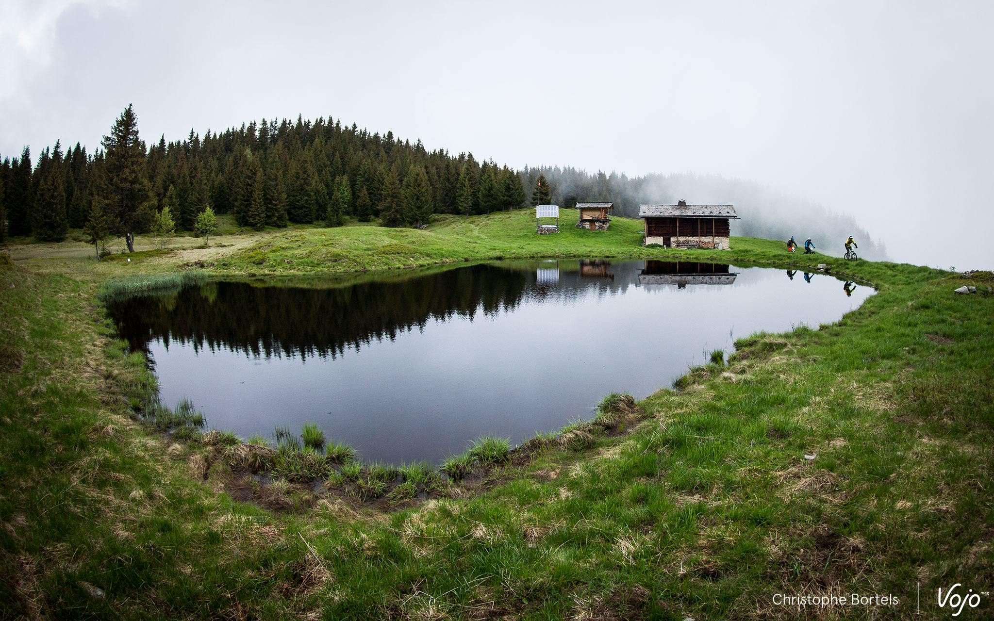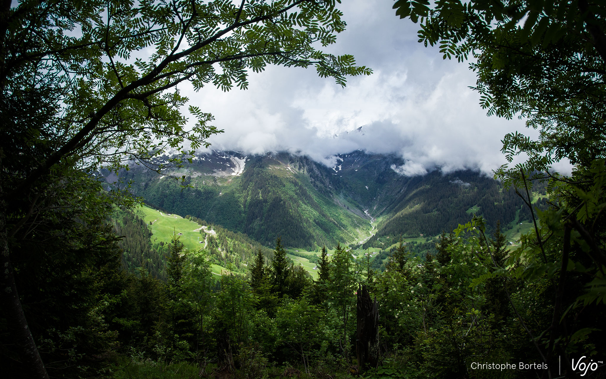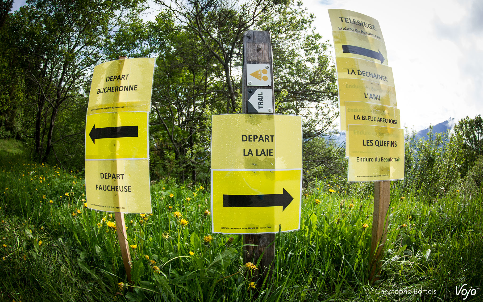 Devant composer avec le relief particulièrement escarpé du Beaufortain, les locaux ont du mal à tracer des pistes accessibles pour tous. Du coup, ils proposaient cette année une boucle bleue, les 3 Grottes, qui partait des hauteurs des Saisies pour rejoindre Hauteluce, plus bas dans la vallée. Malheureusement, la pluie des derniers jours avait rendu le terrain très lourd et les passages roulants ou en côte se sont transformés en quasi calvaire…