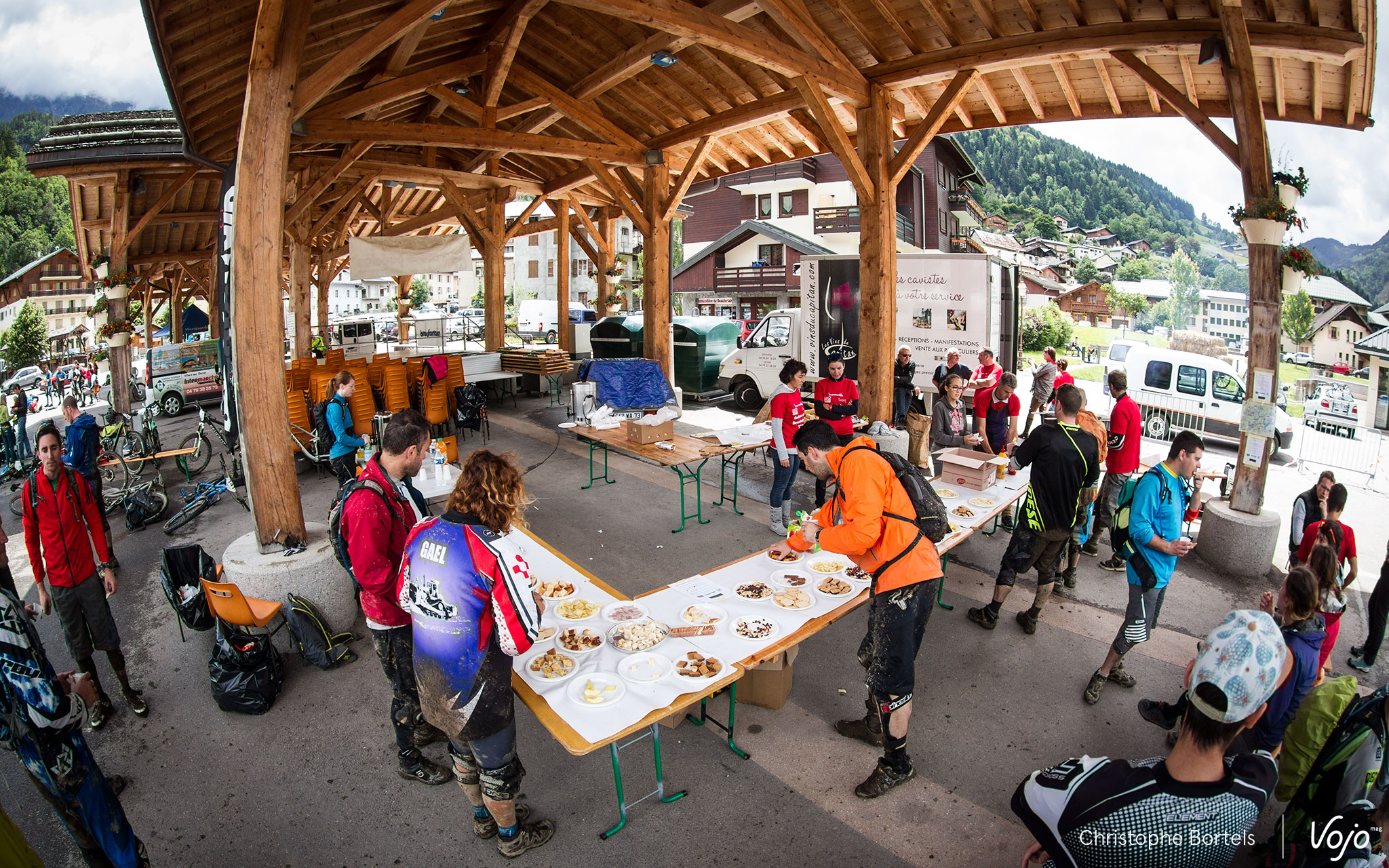 Un ravito permanent avait pris place sur la place de Beaufort, bien à l’abri de la pluie. Au menu : biscuits, saucissons, fruits secs, mais aussi des chips et des pains-saucisses. Le soir, c’était lasagne !