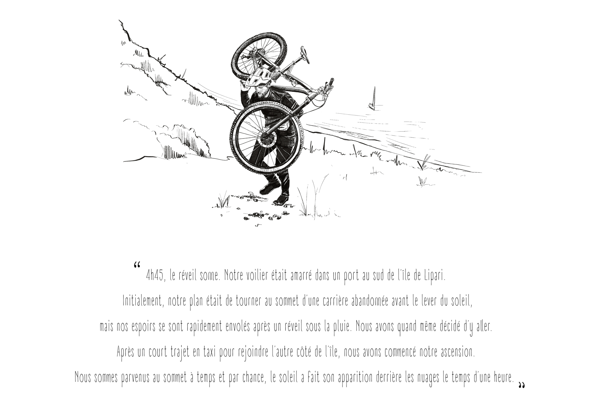 Il y a quelques jours, nous découvrions la première aventure de Kilian Bron sous ses nouvelles couleurs. L’aventurier nous a fait embarquer sur un voilier entre les îles Eoliennes. Baptisée « Chasing Volcanoes », la vidéo de 10 minutes ajoutait une touche de poésie aux images d’action. C’est Commencal qui nous a proposé de nous replonger dans cette aventure avec un portfolio illustré signé JB Liautard et Lucie Souchière au crayon. En découvrant les images qui suivent, nous n’avons pas hésité longtemps avant de leur ouvrir les portes de Vojo :