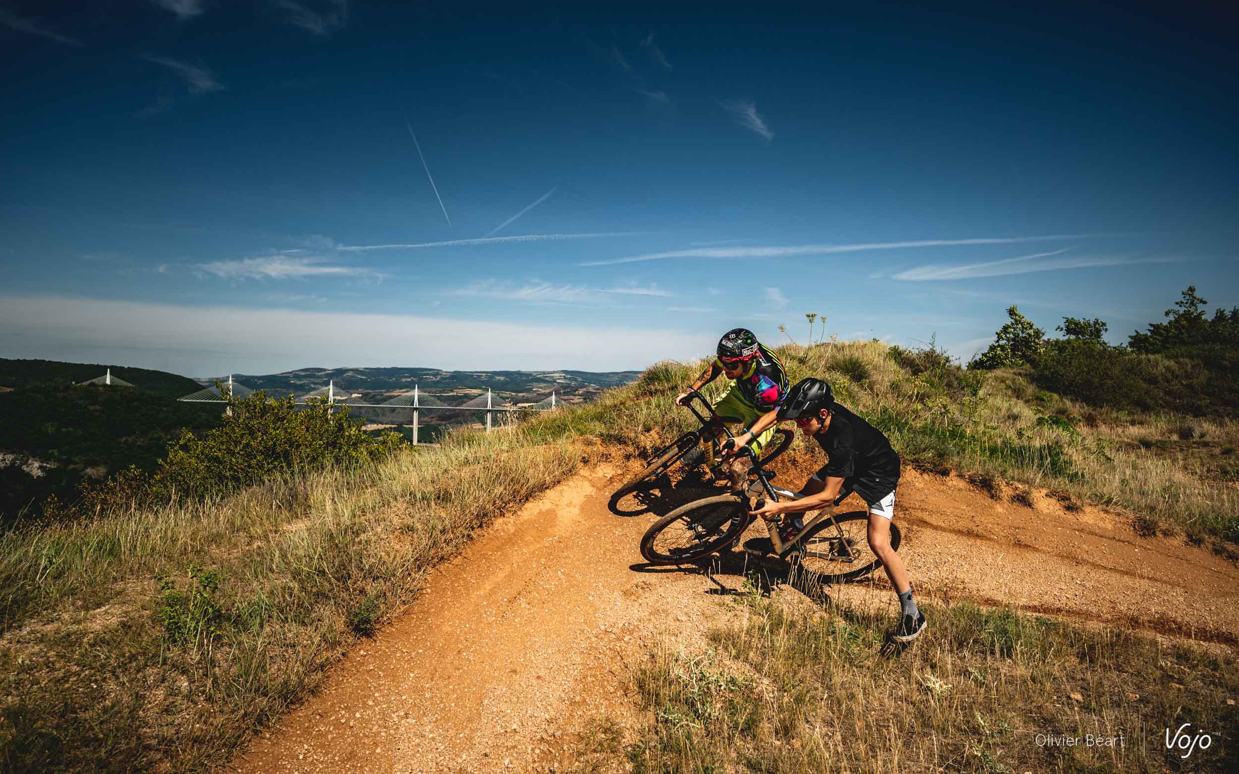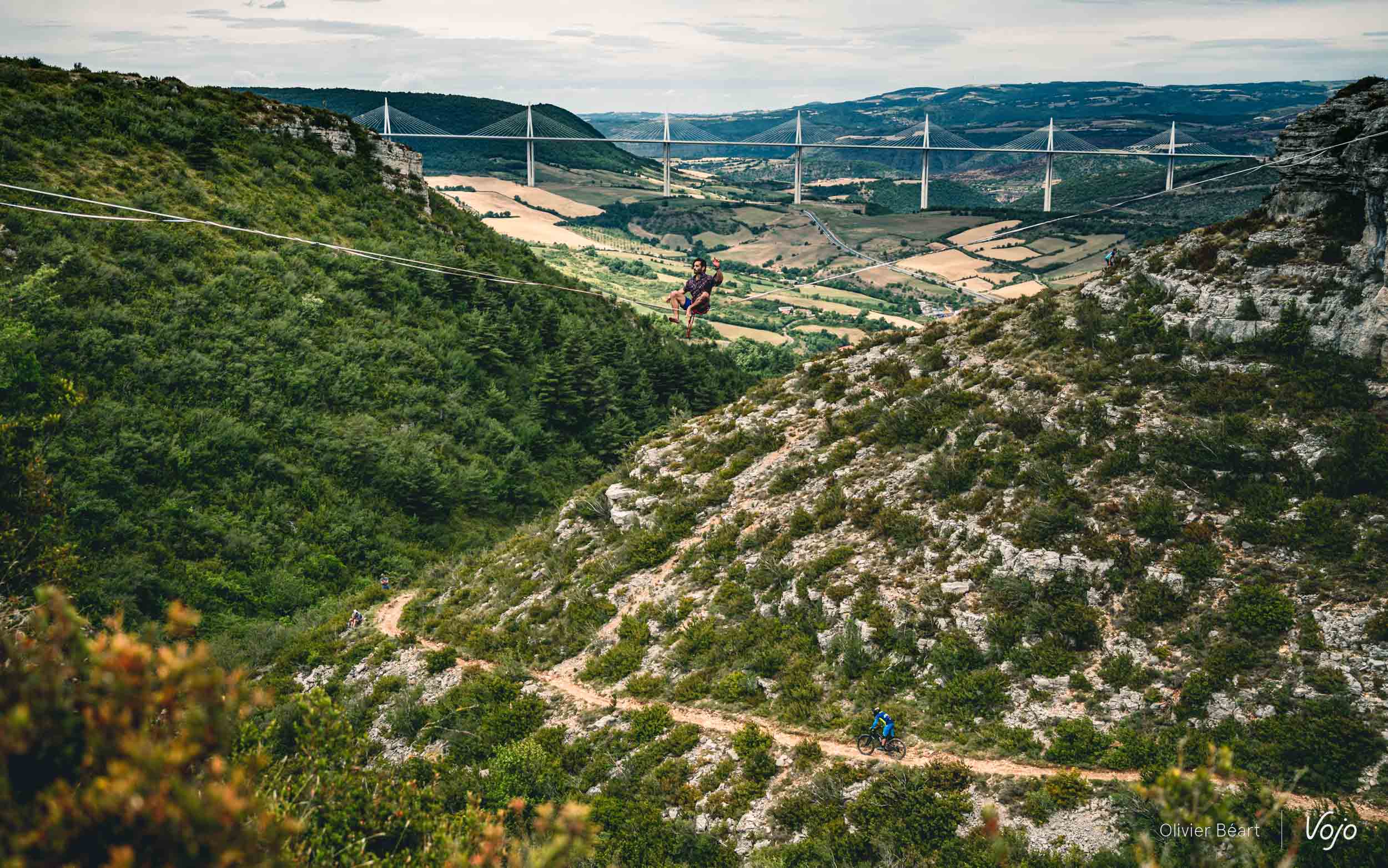 Le VTT enduro est aussi présent, avec une course organisée le samedi. Le centre névralgique se trouve cette fois sur le site de Brunas, sur les hauteurs de Millau, en plein plateau du Larzac. La photo ci-dessus résume bien la mixité qui est à la base de la philosophie des NG, avec la Highline qui se trouve aussi à cet endroit et sous laquelle passe l’enduro VTT !