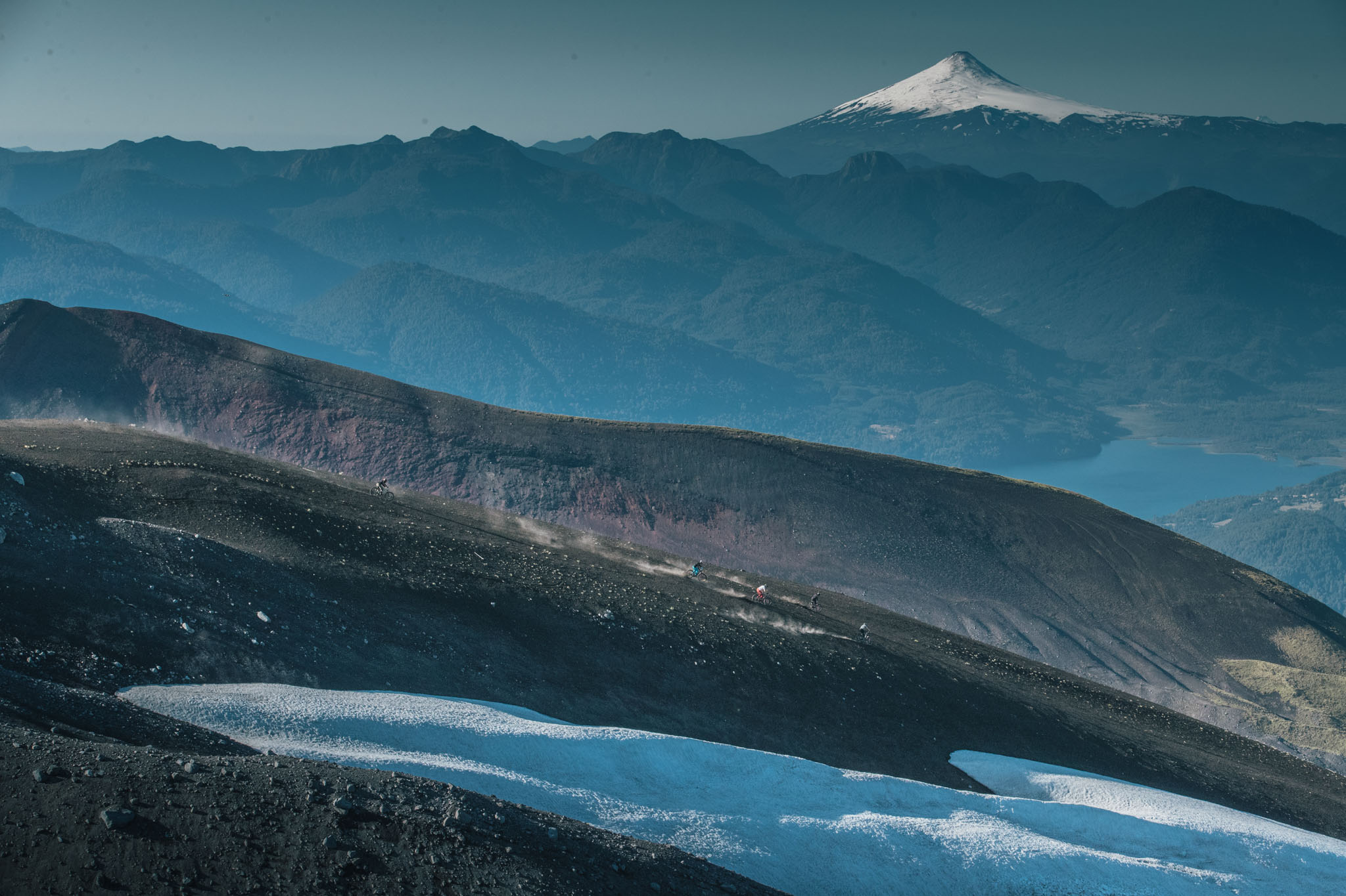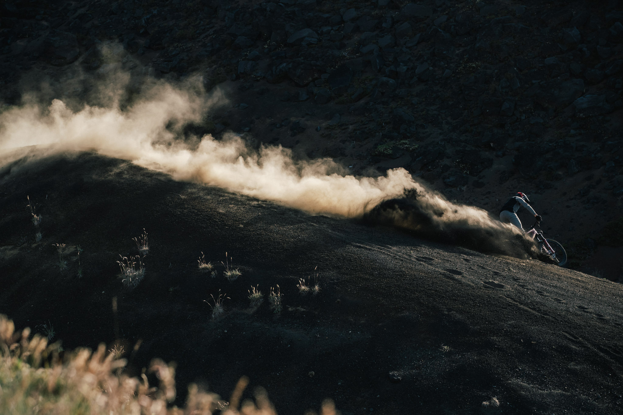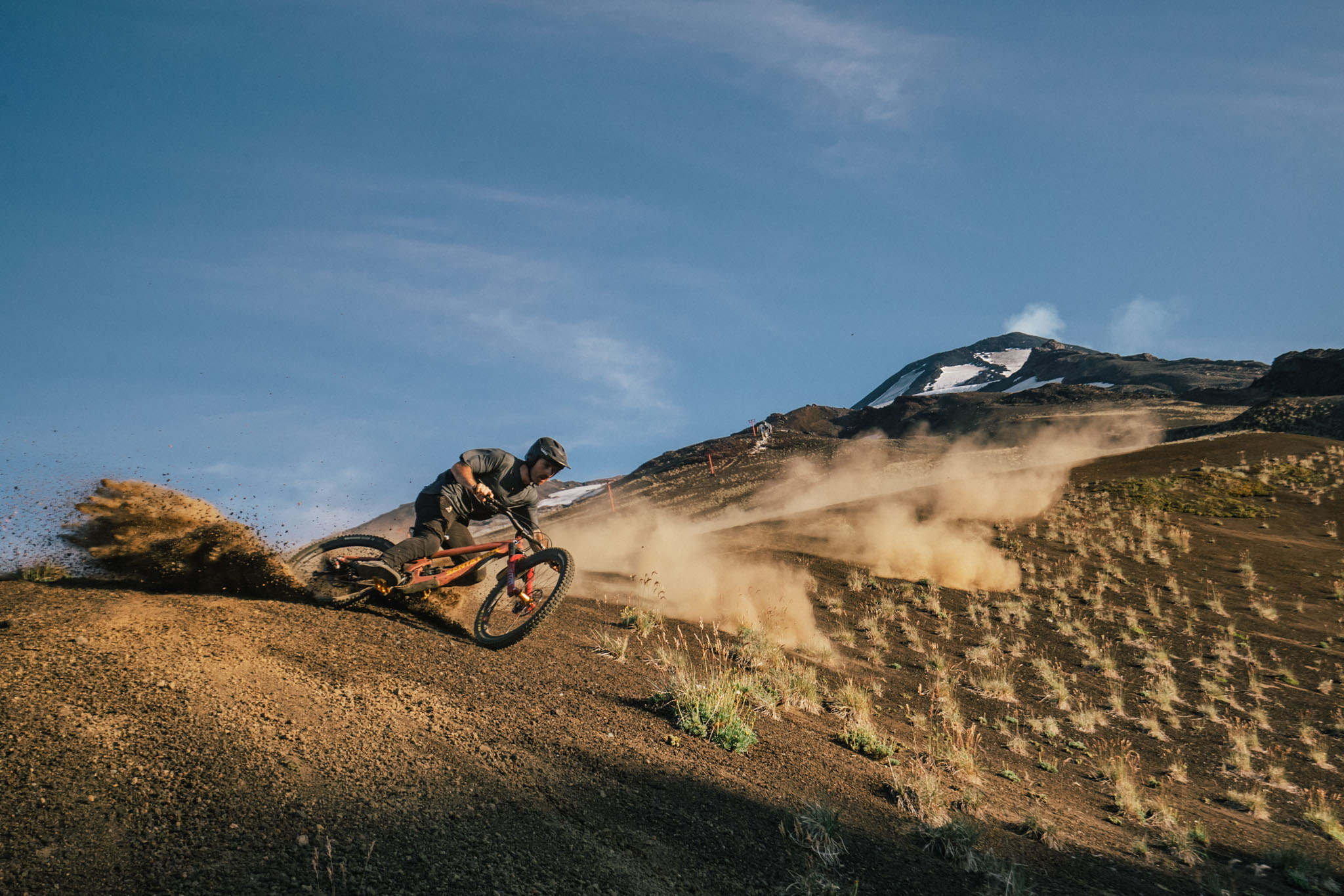 On s’est élancés mais il n’y avait pas de trail. On avait juste à aller dans la direction de Sam et d’Adrian. On est parti tous les 4 et on était complètement en travers quand on a attaqué la partie raide. On s’est tous mis à crier comme jamais. Les vélos étaient complètement en glisse mais on gardait vraiment le contrôle. À un moment, Mitch et moi nous étions tellement proches que je crois que nos roues se sont touchées. On est arrivés en bas, en se tapant dans les mains et on a regardé Adrian et Sam qui étaient au moins aussi aux anges que nous ! On est remonté aussi sec en courant et on a continué jusqu’à ce que le soleil se couche derrière le volcan. »