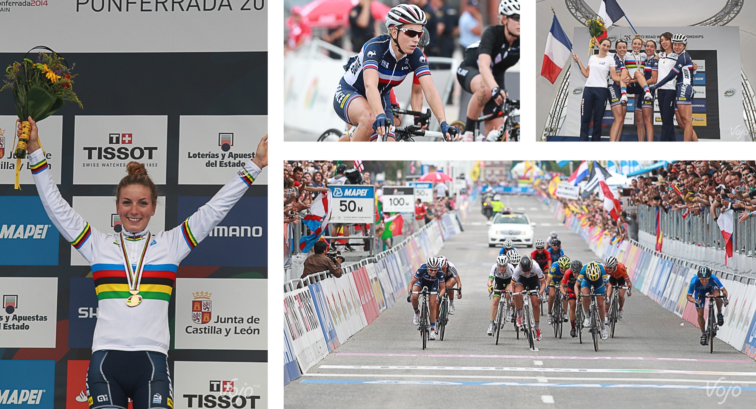 En 2014, c’est l’explosion : championne de France de cyclocross, vainqueur de la Flèche Wallonne, 2e du Giro féminin, deux victoires en coupe du monde VTT et surtout un premier titre mondial Elite sur route conquis en septembre à Ponferrada ! C’est l’événement : elle est la première Française à décrocher ce maillot depuis Jeannie Longo. A star is born !