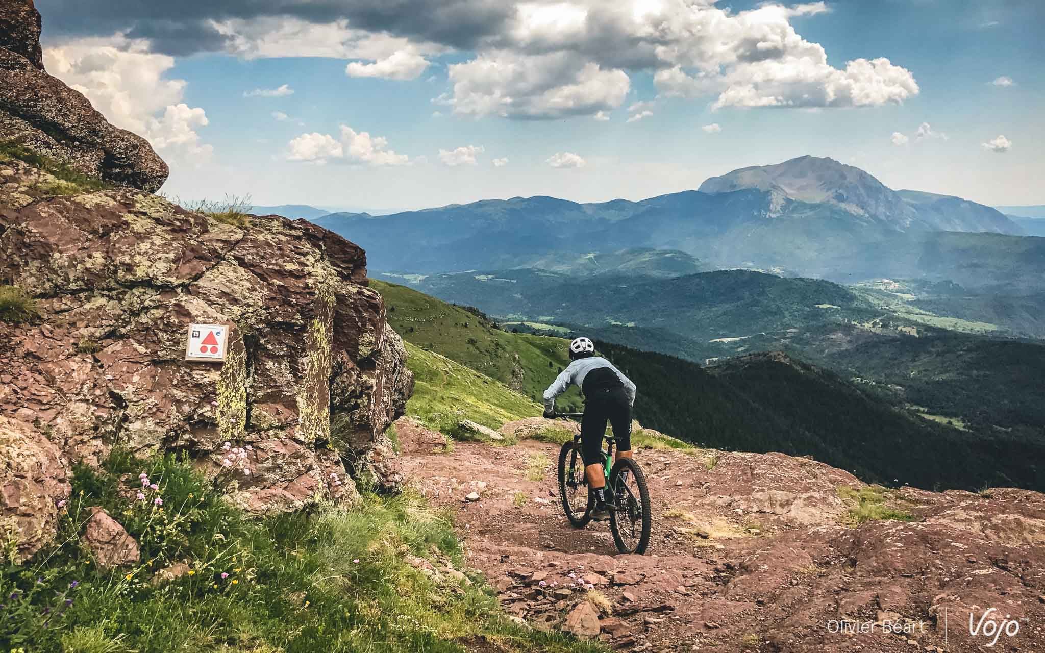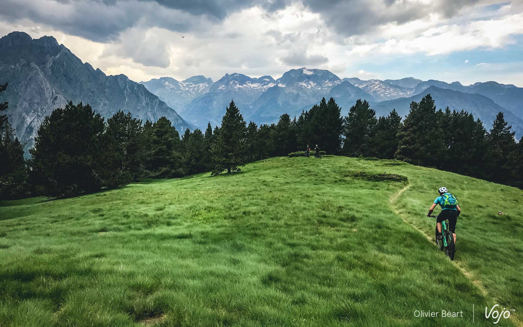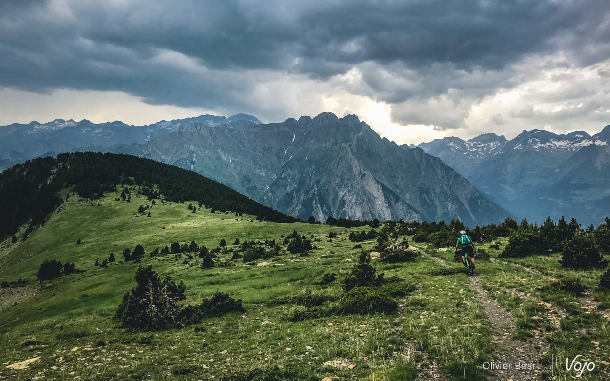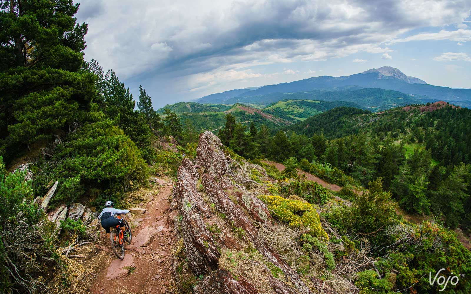 Arrivé au terme de notre ascension, nous nous faufilons à travers une étroite crevasse qui fend la montagne. De l’autre côté, c’est la France, à hauteur de Bagnère de Luchon. La vue est à couper le souffle… comme l’étroit sentier qui nous attend. De la pente raide, de gros rochers et surtout des dizaines de virages en épingles hyper serrés : il y a tout pour mettre en difficulté un gros enduro 29 » comme l’Orbea Rallon R5. Et pourtant.