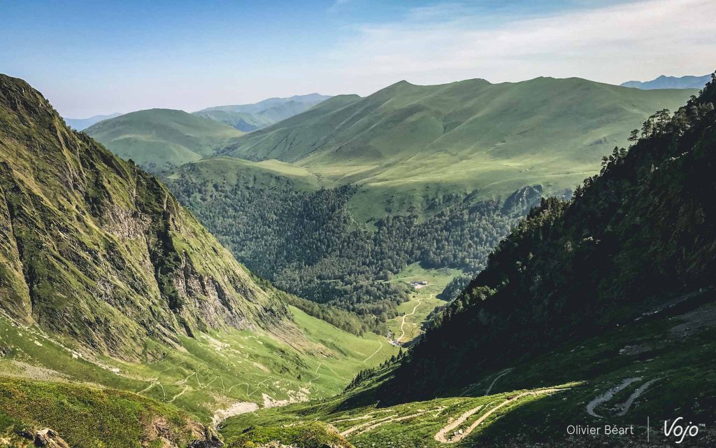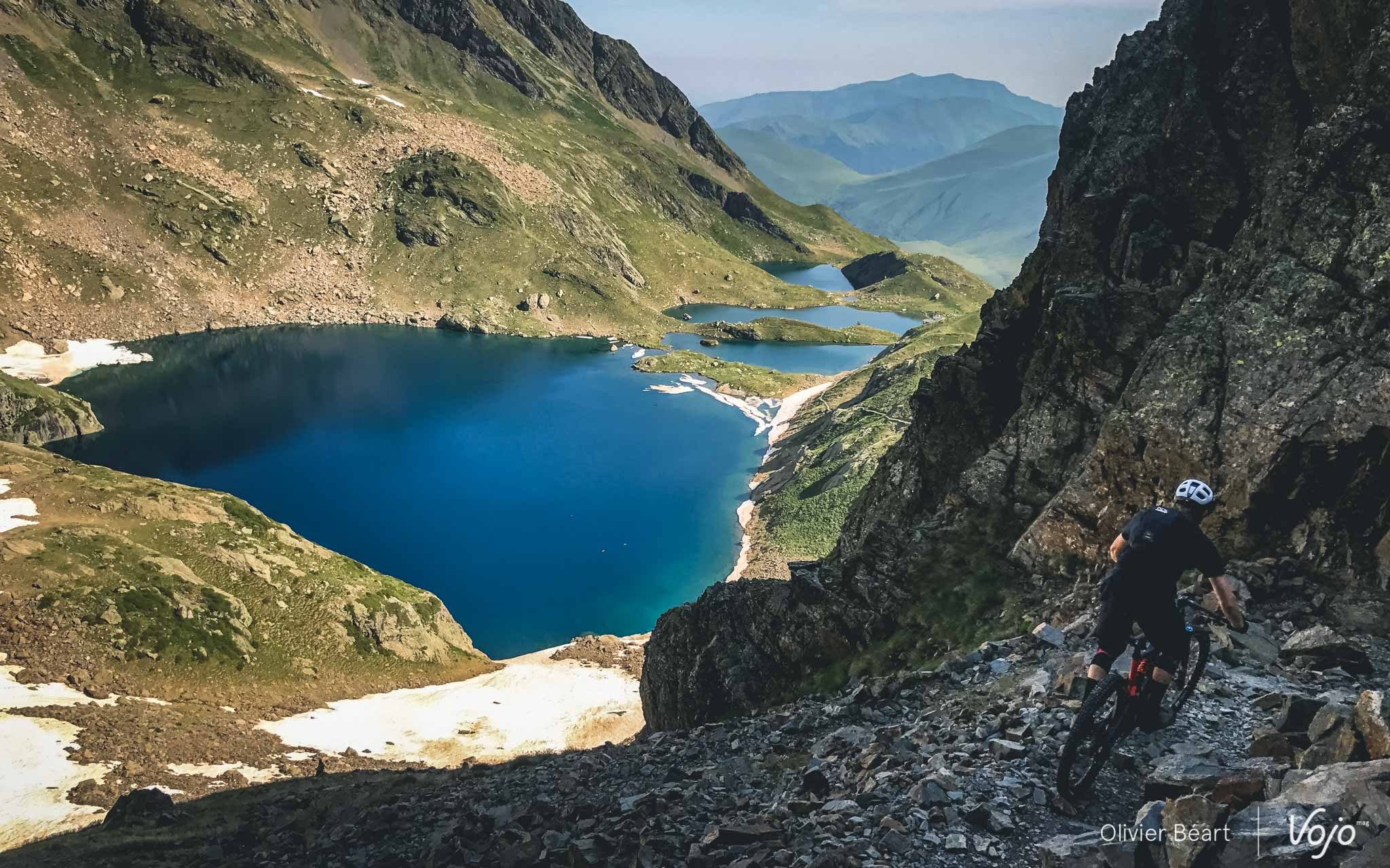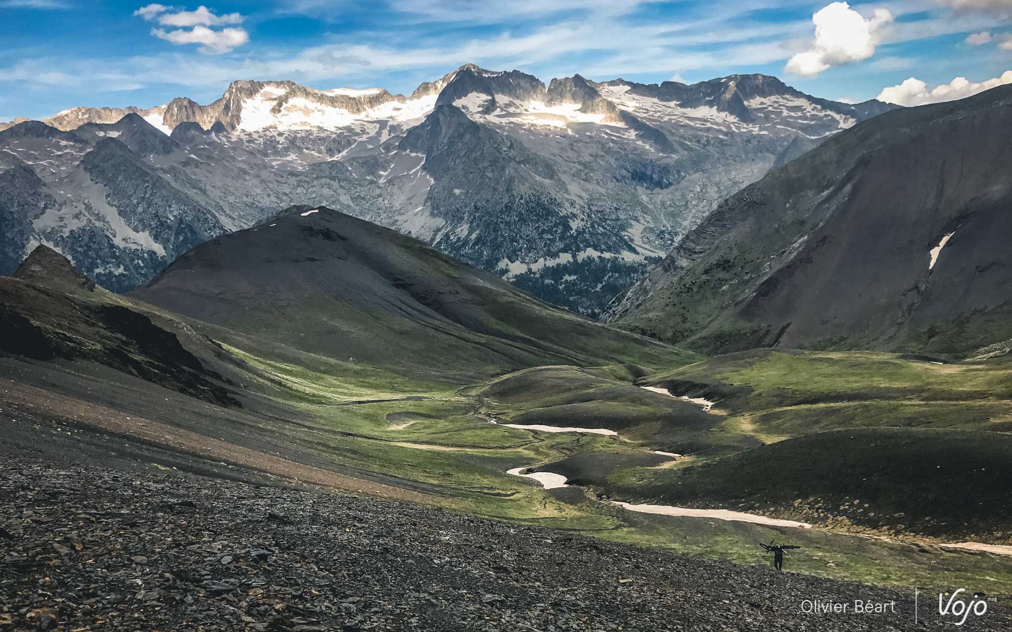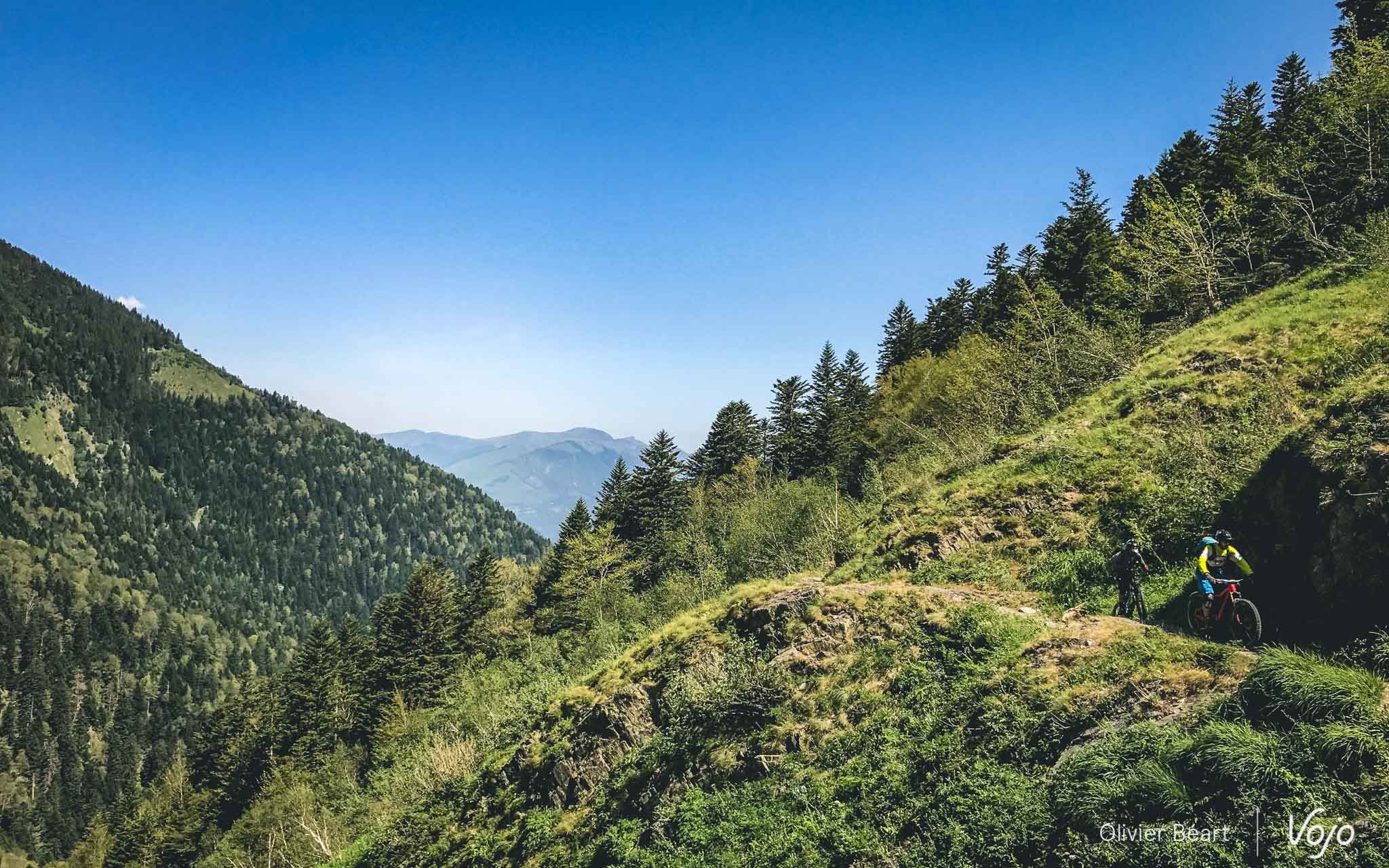 Arrivé au terme de notre ascension, nous nous faufilons à travers une étroite crevasse qui fend la montagne. De l’autre côté, c’est la France, à hauteur de Bagnère de Luchon. La vue est à couper le souffle… comme l’étroit sentier qui nous attend. De la pente raide, de gros rochers et surtout des dizaines de virages en épingles hyper serrés : il y a tout pour mettre en difficulté un gros enduro 29 » comme l’Orbea Rallon R5. Et pourtant.