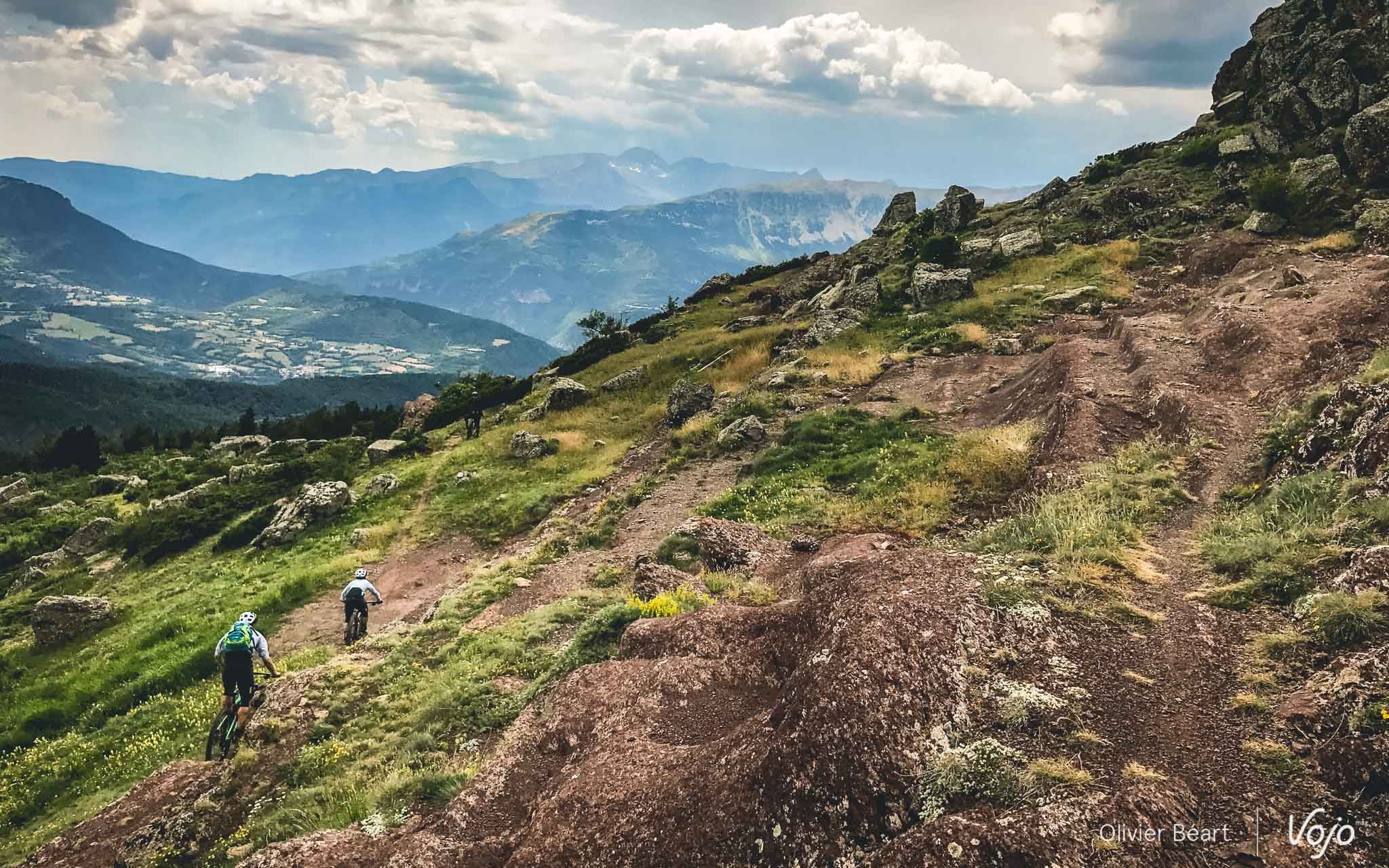 Après s’être enfilé quasiment 1700m de négatif d’une traite, on enchaîne avec un sentier en corniche d’apparence plus paisible car relativement plat, mais qui réserve tout de même quelques beaux défis trialisants. Je n’arrive pas à tous les passer mais le vélo m’aide bien et l’amortisseur à ressort ne bouffe pas toute l’énergie quand il faut donner des impulsions.