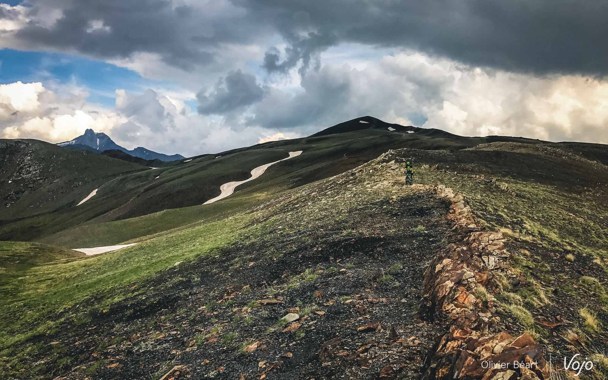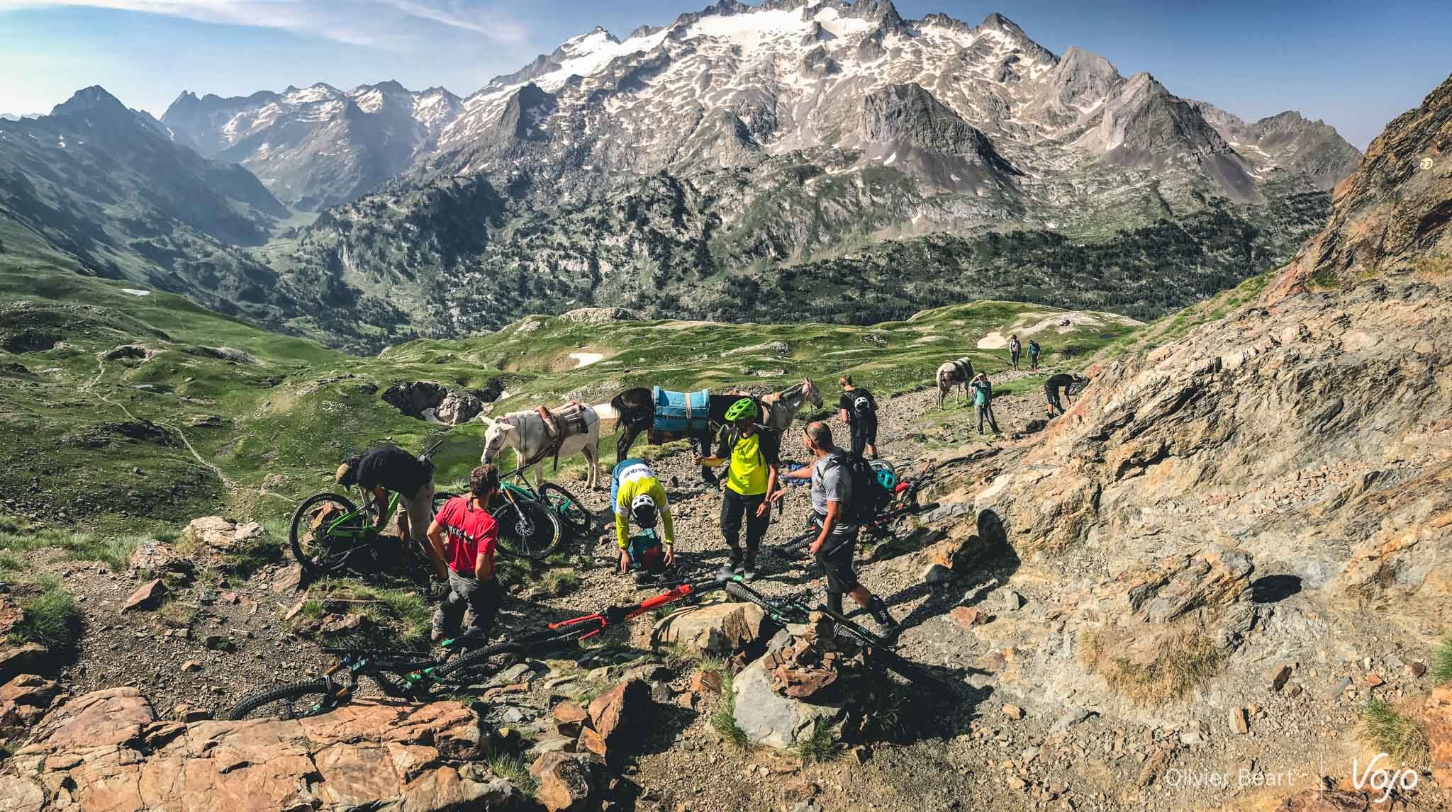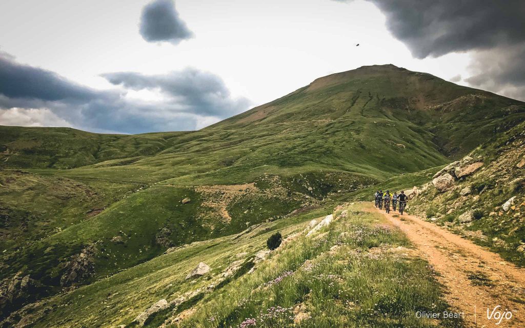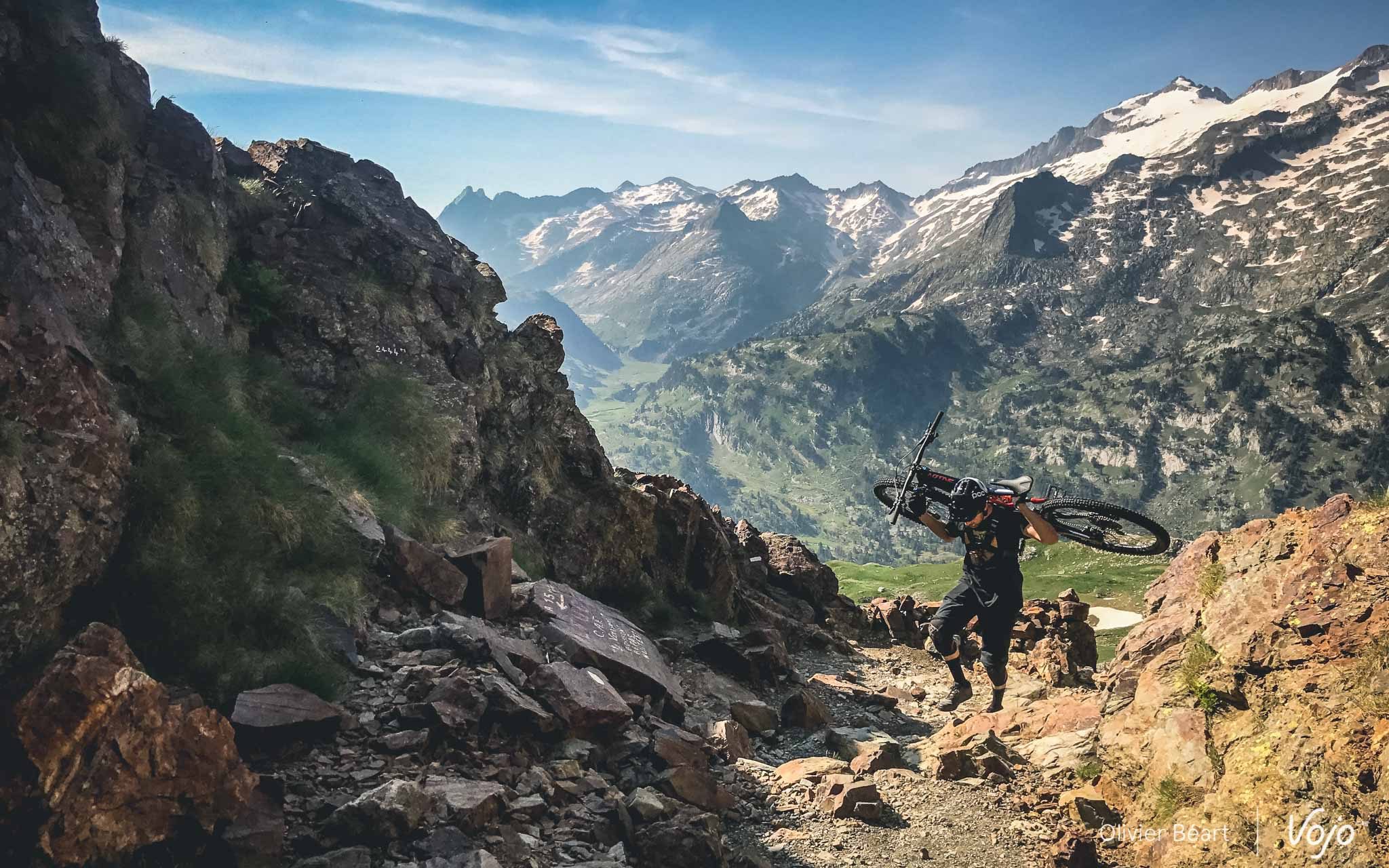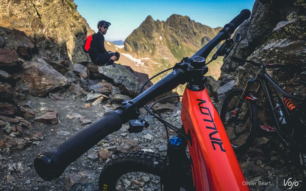 Près du sommet, nous devons encore porter le vélo sur quelques dizaines de mètres. L’occasion de voir que l’Orbea Rallon R5 carbone est particulièrement léger, avec à peine plus de 13kg pédales comprises. Et avec l’amortisseur à ressort. Car oui, je ne vous l’ai pas dit mais j’ai laissé l’amortisseur à air au vestiaire pour tenter l’option plus « fat ». Je vais vite me rendre compte que c’est un très bon choix quand il s’agit de manger du dénivelé : nous avons 3800m de négatif au programme aujourd’hui !