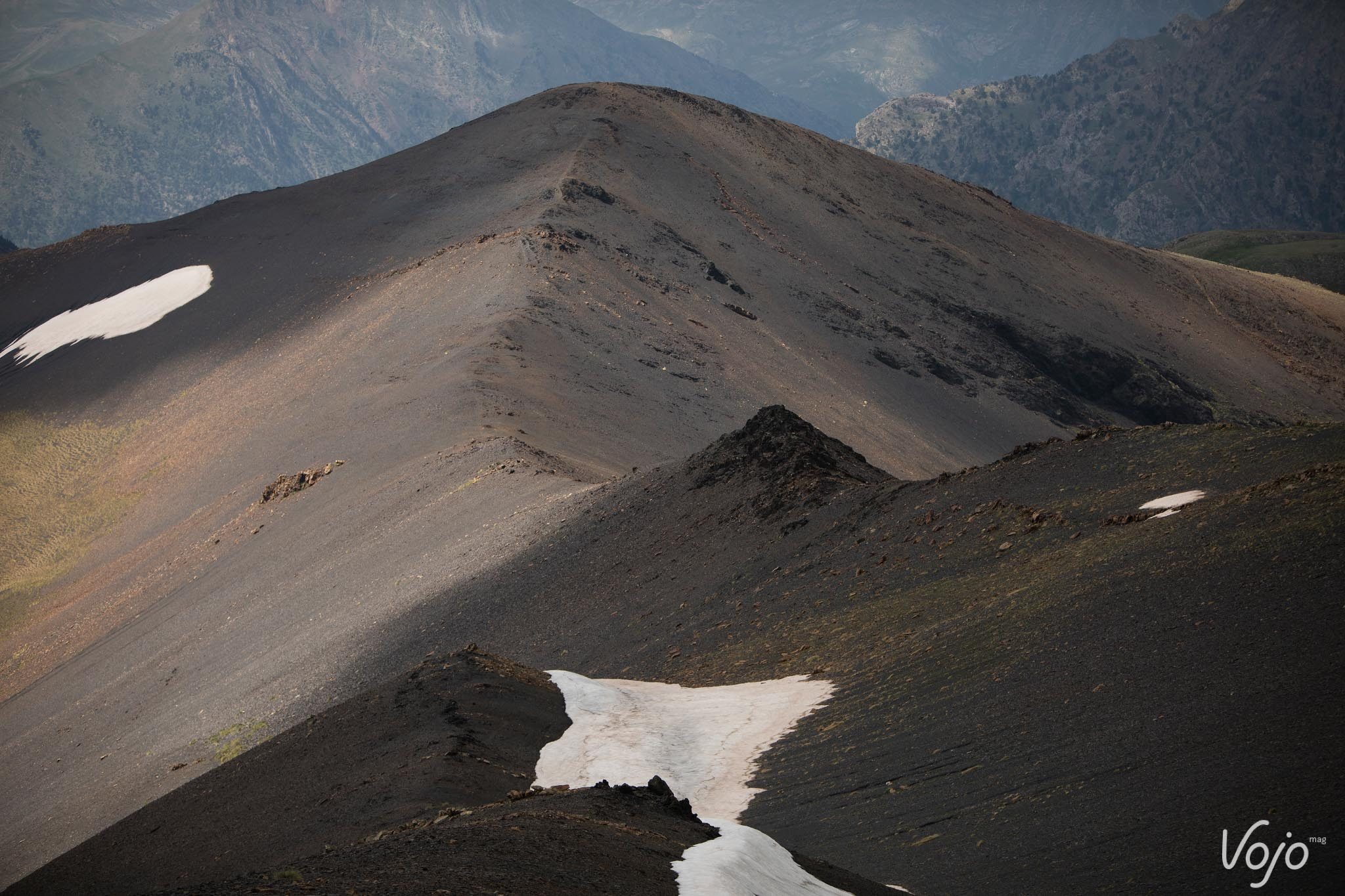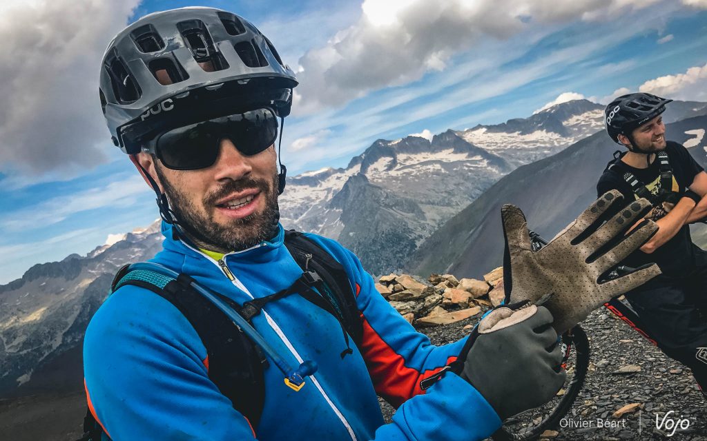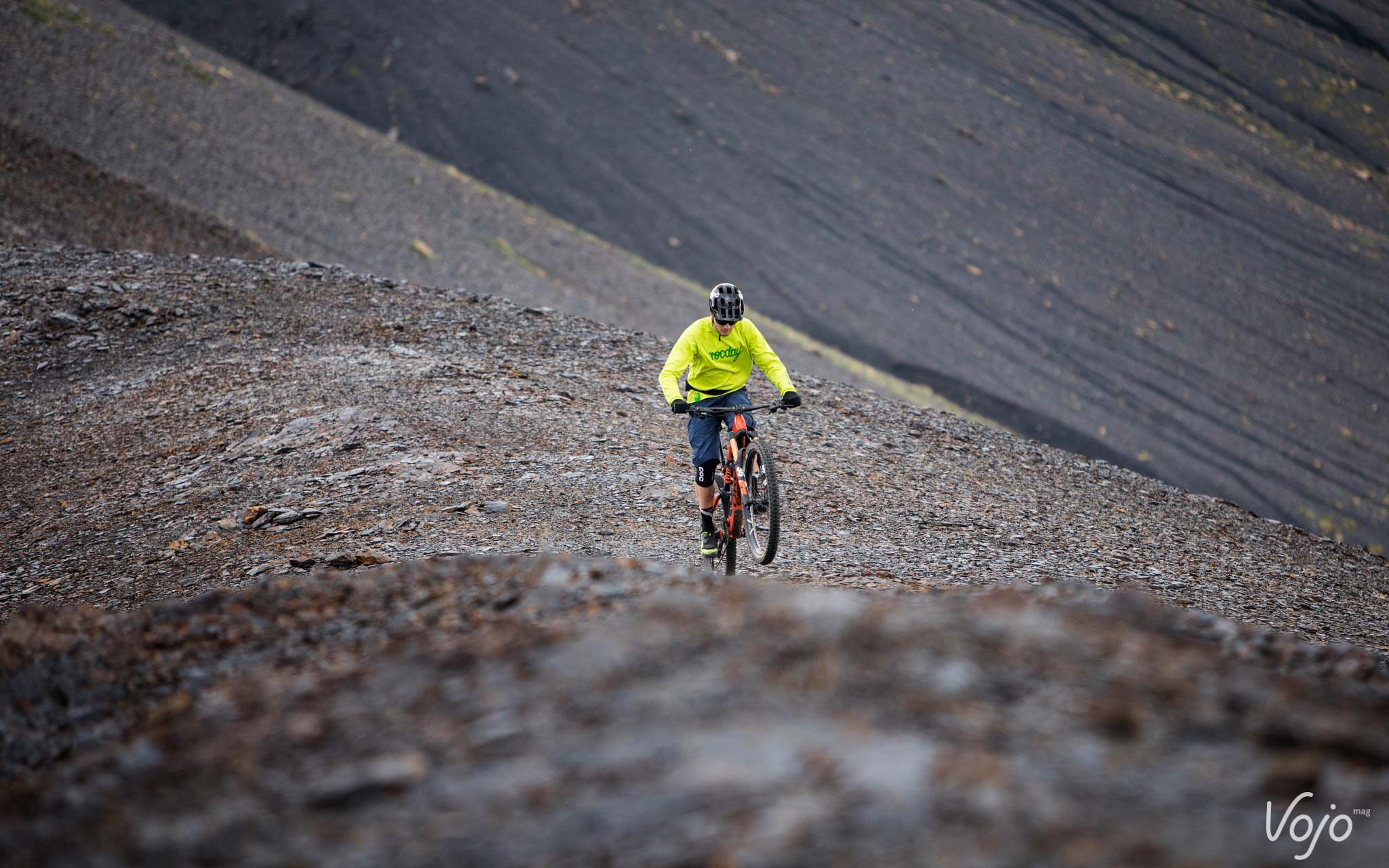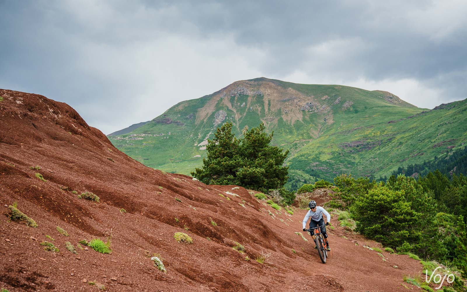 Près du sommet, nous devons encore porter le vélo sur quelques dizaines de mètres. L’occasion de voir que l’Orbea Rallon R5 carbone est particulièrement léger, avec à peine plus de 13kg pédales comprises. Et avec l’amortisseur à ressort. Car oui, je ne vous l’ai pas dit mais j’ai laissé l’amortisseur à air au vestiaire pour tenter l’option plus « fat ». Je vais vite me rendre compte que c’est un très bon choix quand il s’agit de manger du dénivelé : nous avons 3800m de négatif au programme aujourd’hui !
